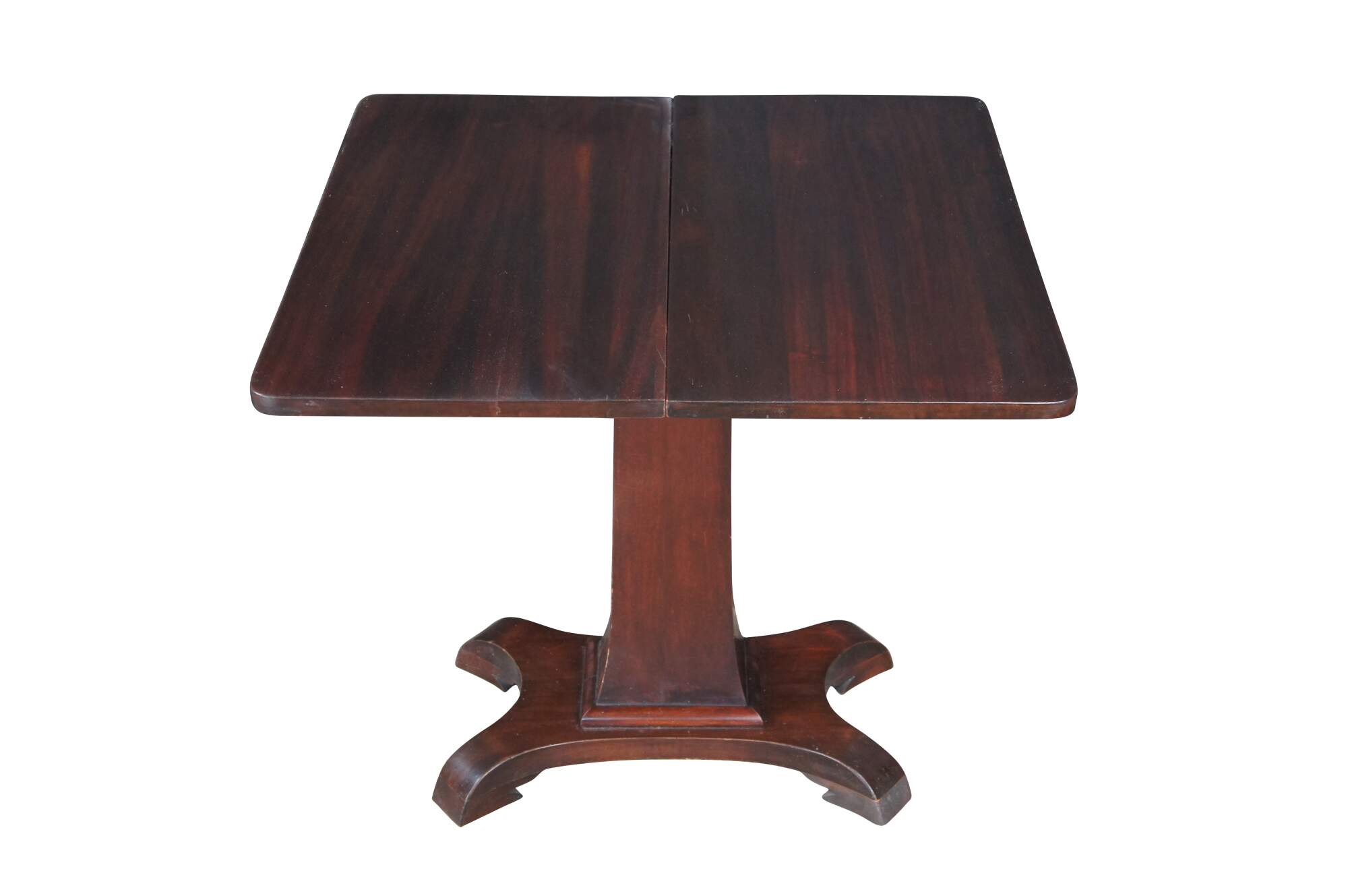 Antique 19th Century Victorian Era American Empire flip top game table or console. Made of mahogany featuring American Empire styling with rectangular form, tapered pedestal over a splayed base with curved feet.