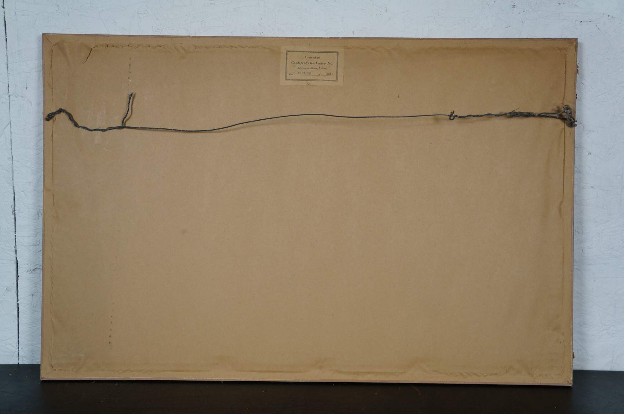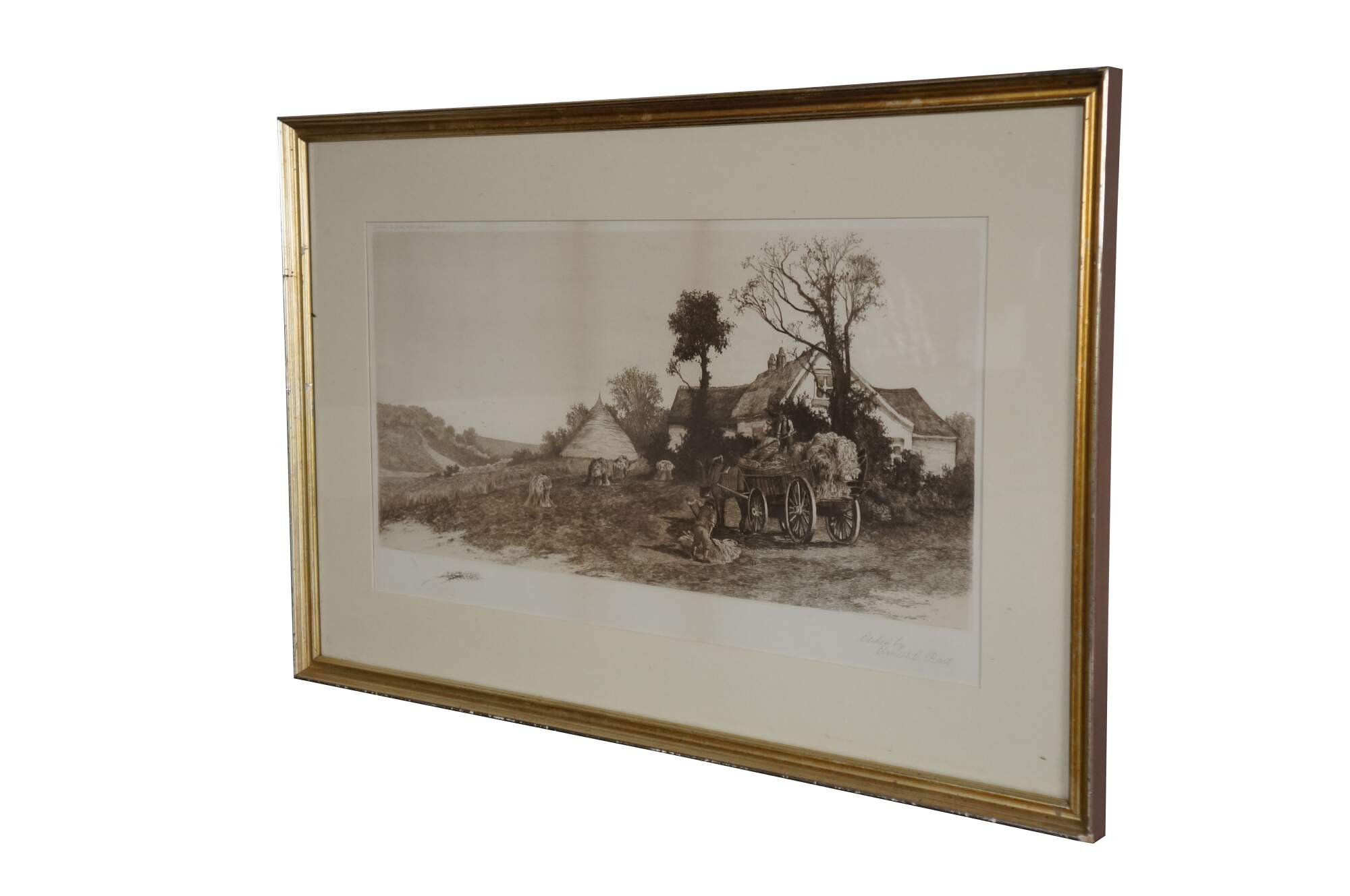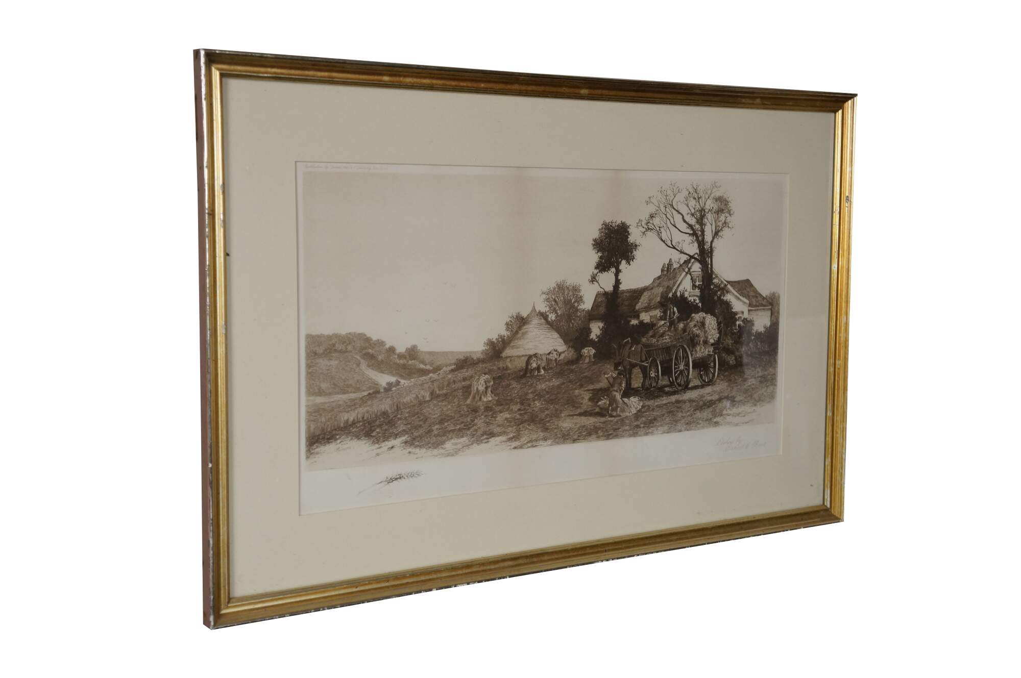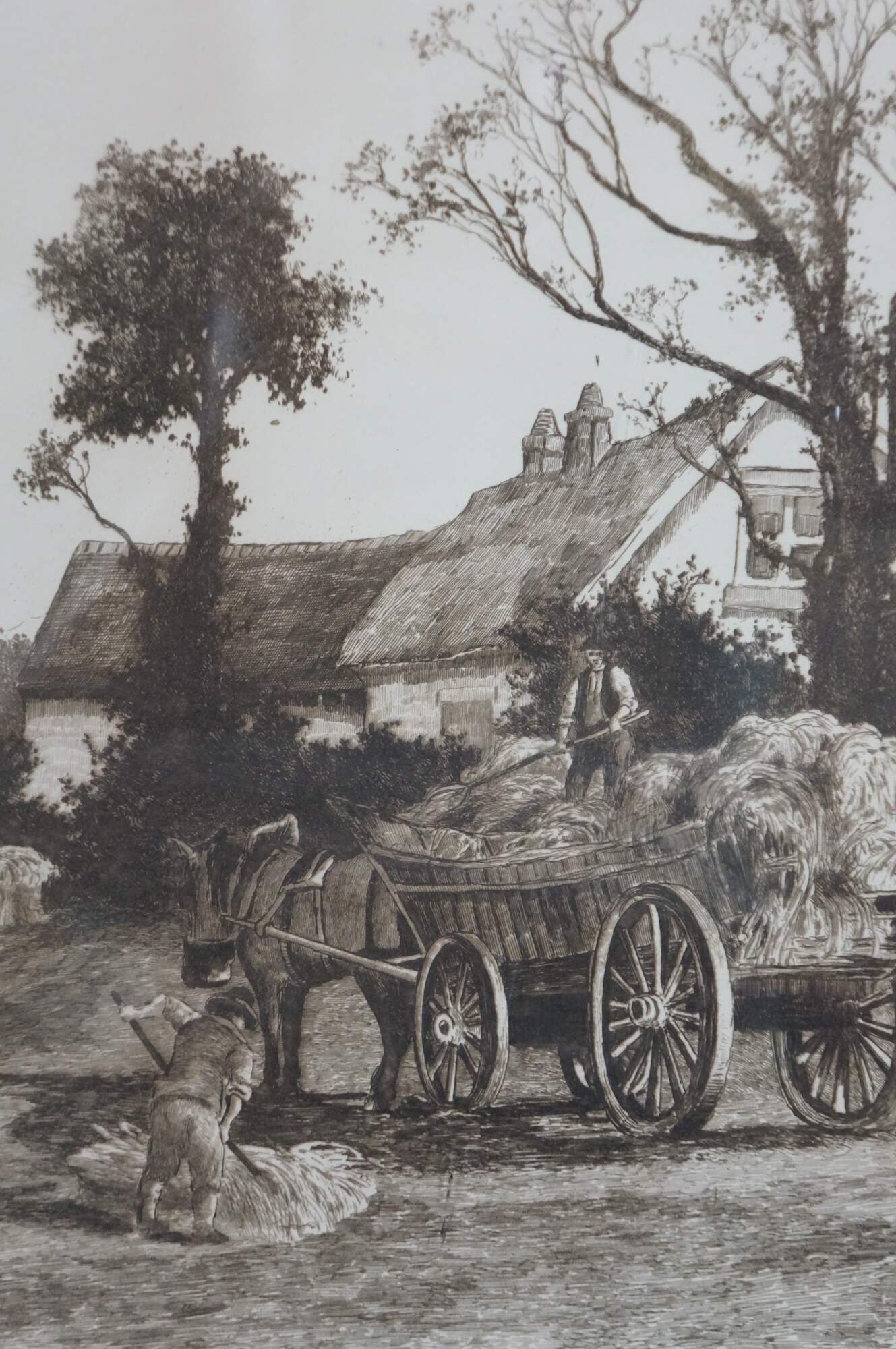 Late 19th century black and white etching by Ernest C. Rost. Harvest landscape showing figures baling hay into a cart near a country farmhouse. Remarke of a head of wheat, lower left. "Etched by Ernest C. rost" printed, lower right. Published by fishel, Adler, & Schwartz, New York. Giltwood frame with raised bevel; white mat. Framed at Goodspeed's Book Shop, Inc - 9/23/1959 - No 3015.