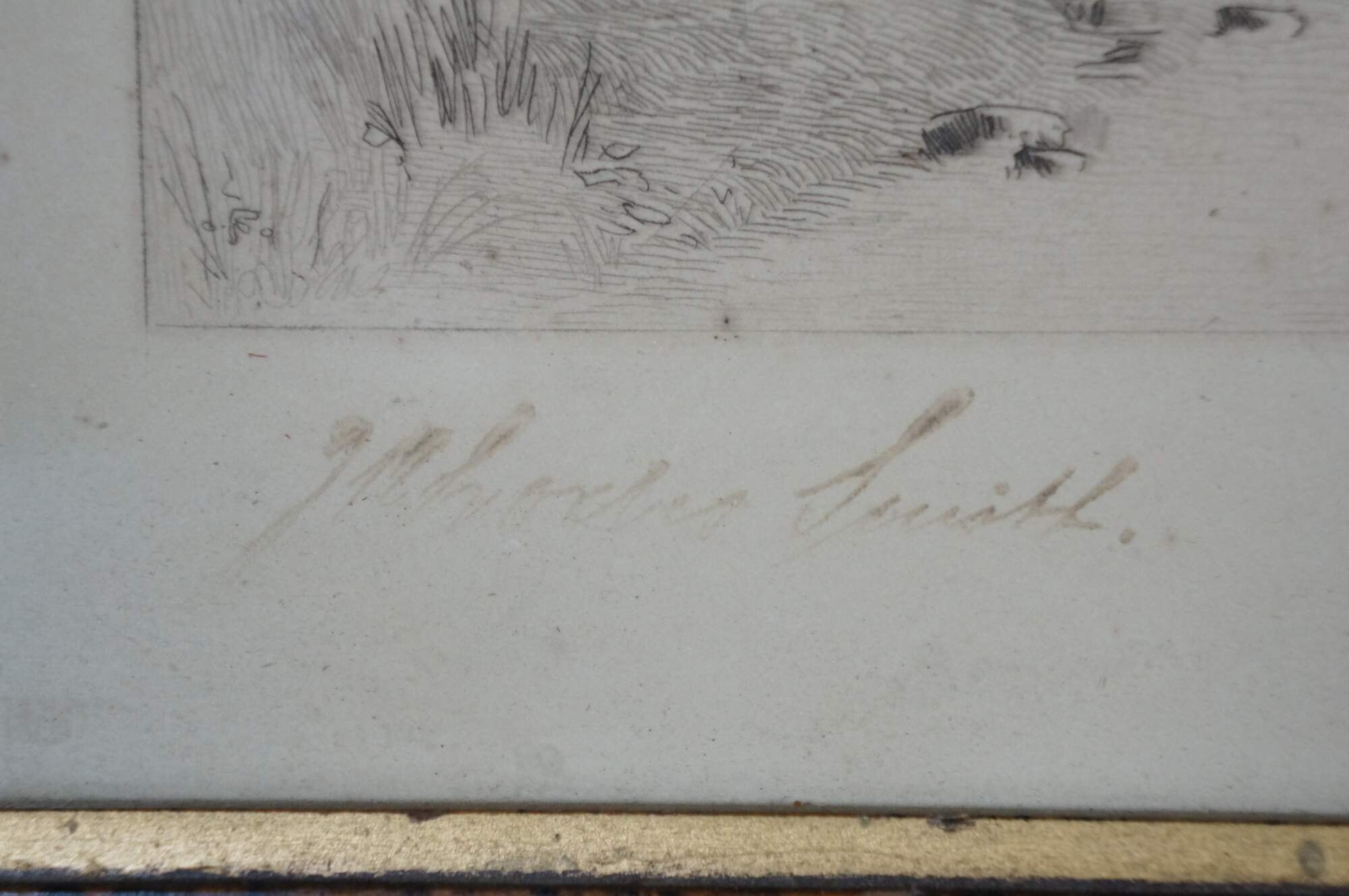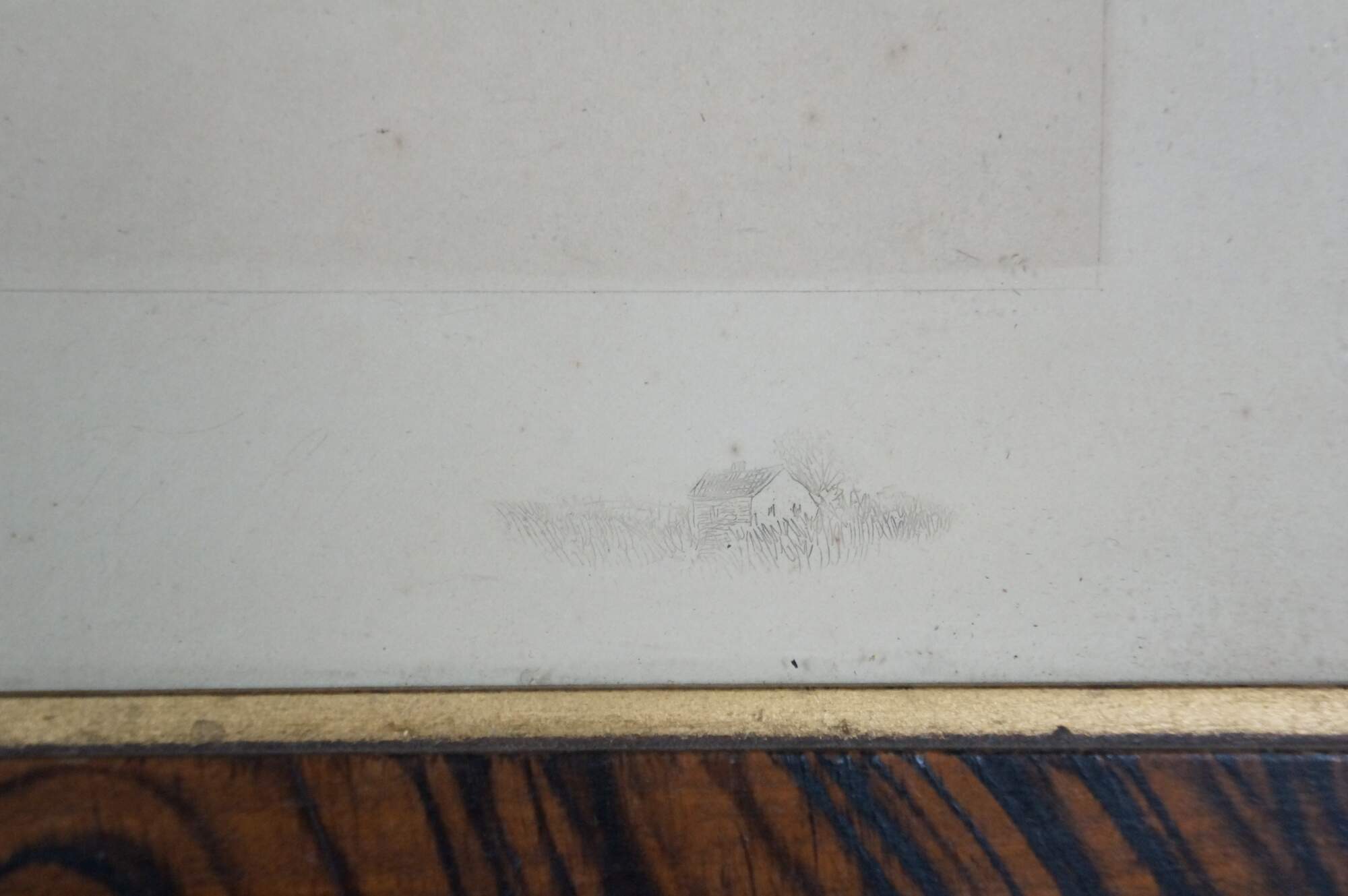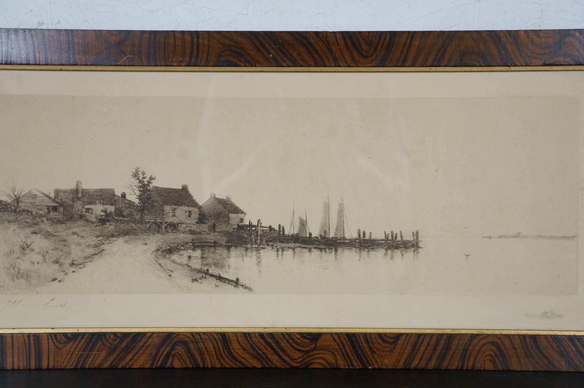 Early 20th century black and white etching. Panoramic coastal landscape of a fishing village near a dock with sailboats. Ink signed, Smith, lower left. Remarke of a cottage, lower right. Published by James Tyroler, New York, 1902. Painted grain frame with gilt inner border; no mat.