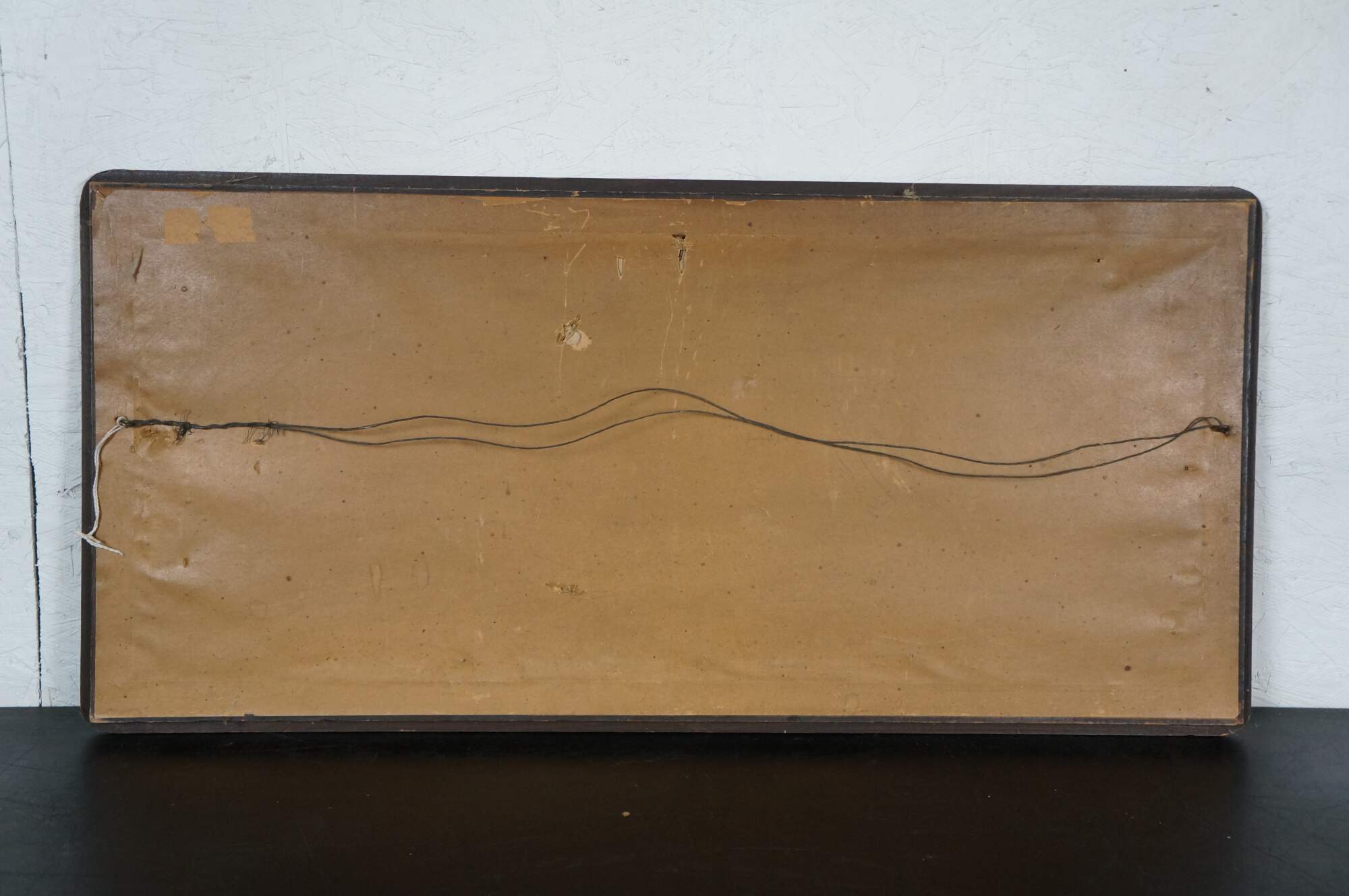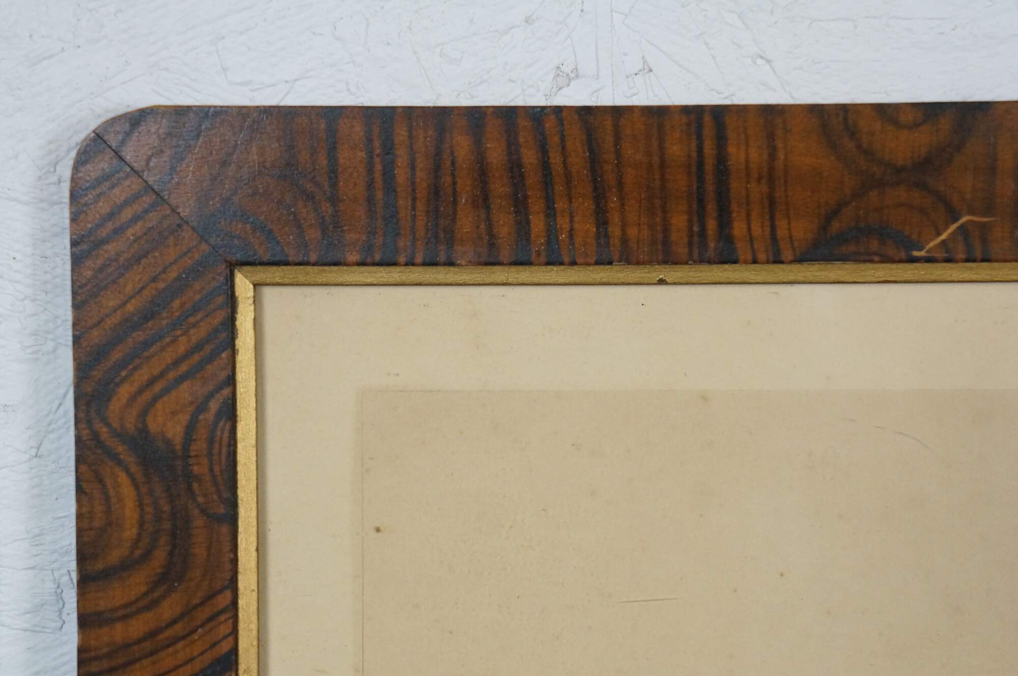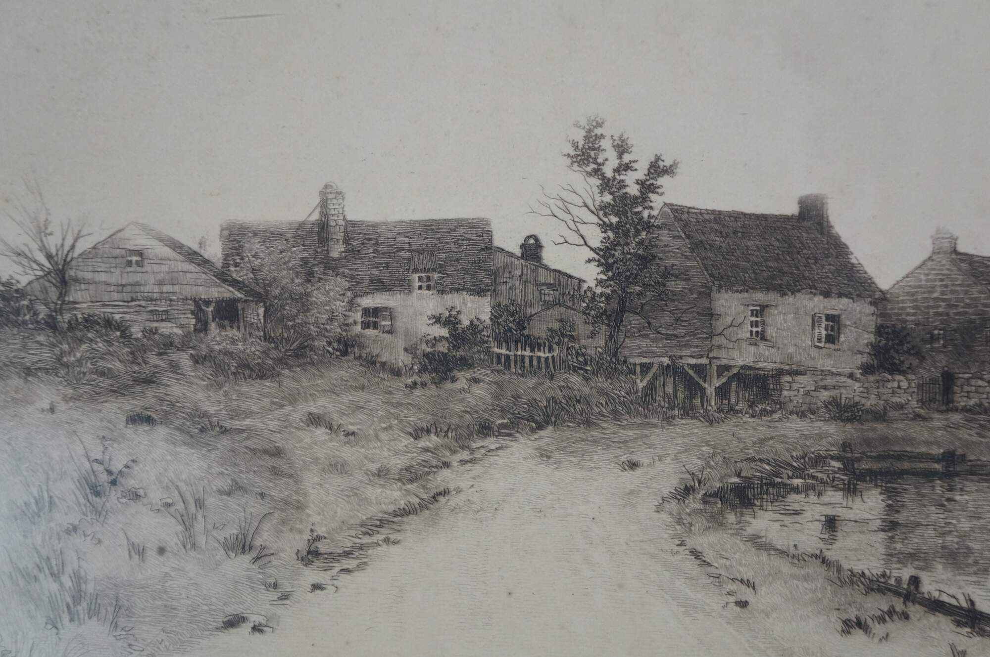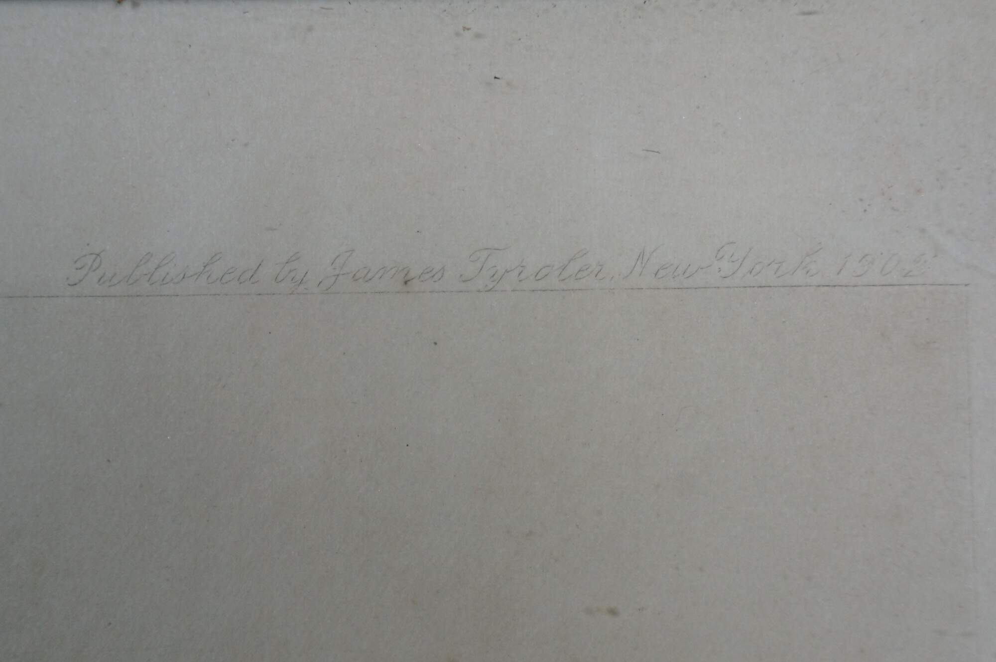 Early 20th century black and white etching. Panoramic coastal landscape of a fishing village near a dock with sailboats. Ink signed, Smith, lower left. Remarke of a cottage, lower right. Published by James Tyroler, New York, 1902. Painted grain frame with gilt inner border; no mat.