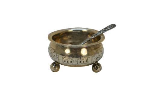 Antique 1874 Russian silver salt cellar and repousse sterling spoon by S. Kirk & Son. Cauldron shaped salt cellar with three ball feet, etched with lotus blossoms and buildings. Assayers Mark: BC 1874 - Viktor Vasilyevich Savinsky or Veniamin Vasilyevich Savinsky. Purity Mark: 84 (875/1000 silver). Town Mark: St George Slaying Dragon / Figure on Horse - Moscow. Makers Mark: Ф (F) - Unidentified. Salt spoon handle is decorated with a dense design of various flowers; marked on reverse; date post-1914.