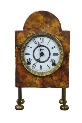 Antique Art Deco style floral marbelite decoupage, key wound, chiming mantel clock. Rectangular wood case with arch top, decoupaged with red and brown roses and flowers, standing on four brass legs with tablet shaped feet. White enamel face with black Roman numerals & hands; brass egg and dart frame with glass cover. Movement by Ingraham Clock Company of Bristol, Connecticut.