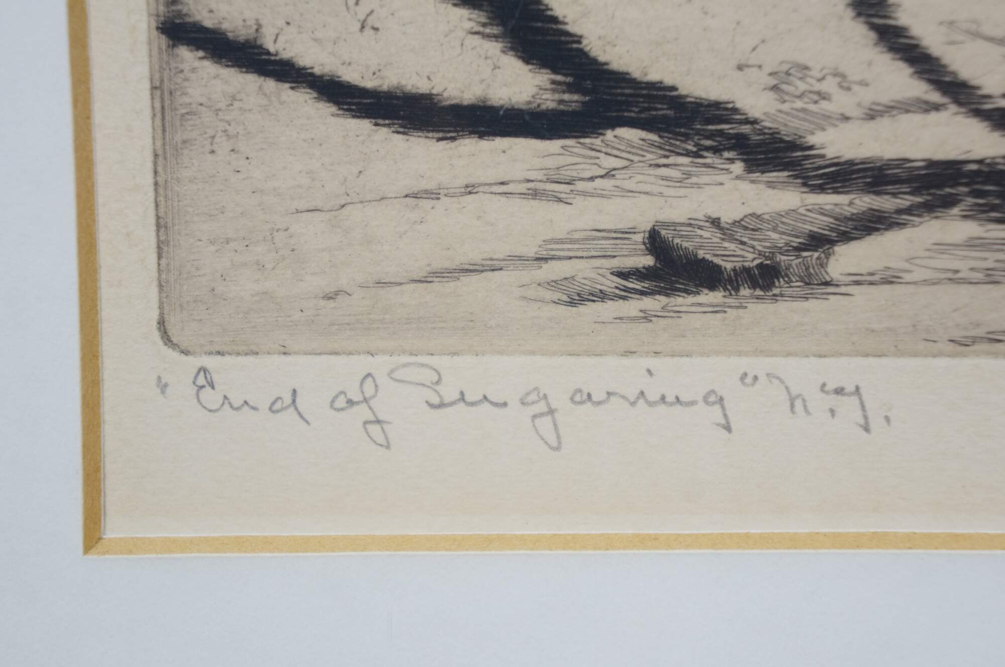 Antique 1930's limited edition black and white etching titled "End of Sugaring" by Walter Ronald Locke. Depicts a forest landscape with stacks of buckets laying beside sugar maple trees, with figures approaching a barn in the distance. Pencil titled, signed, and dated '39, lower edge. Published by Associated American Artists. Wood frame with black detail; white mat; original label on back.