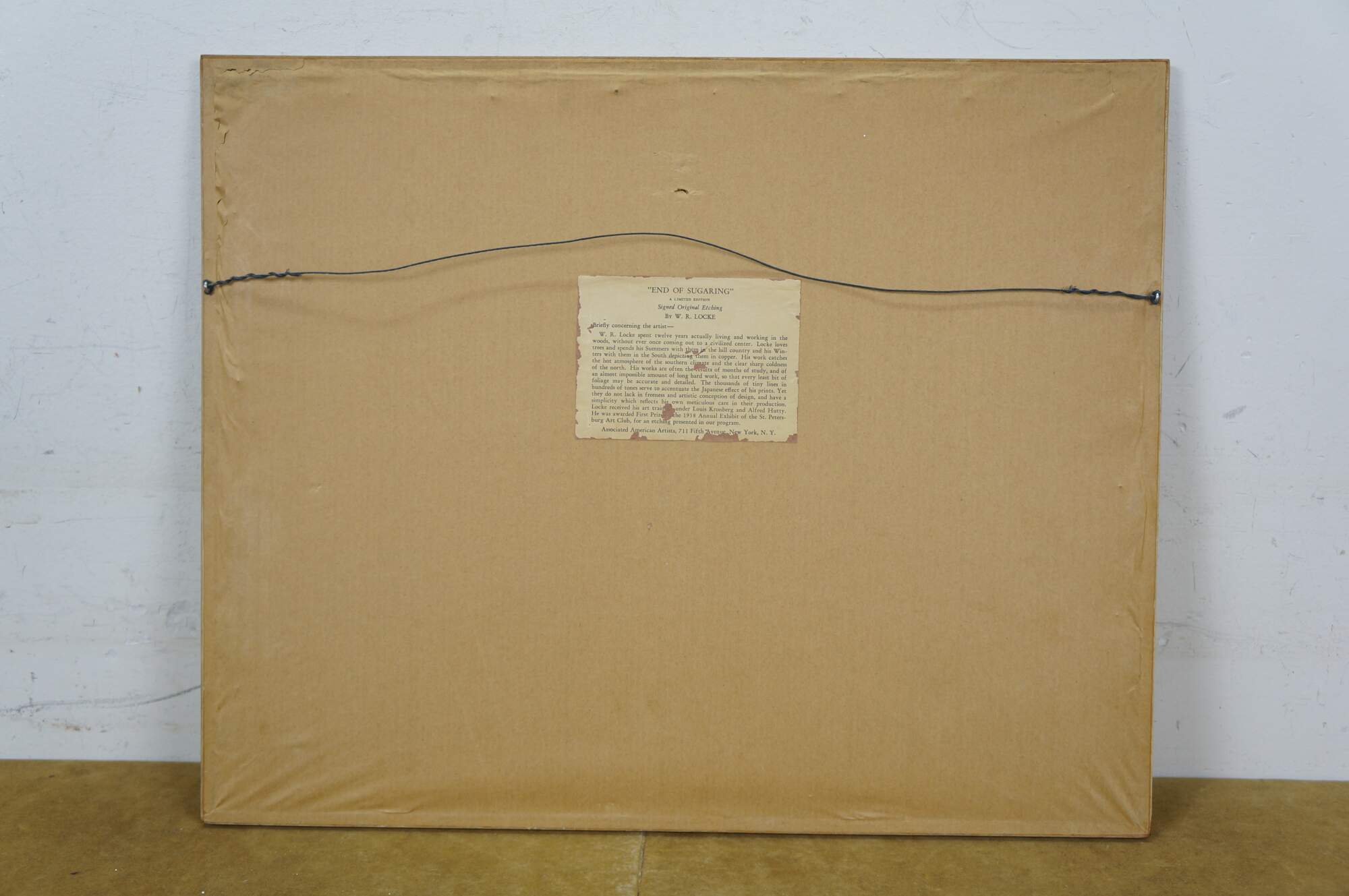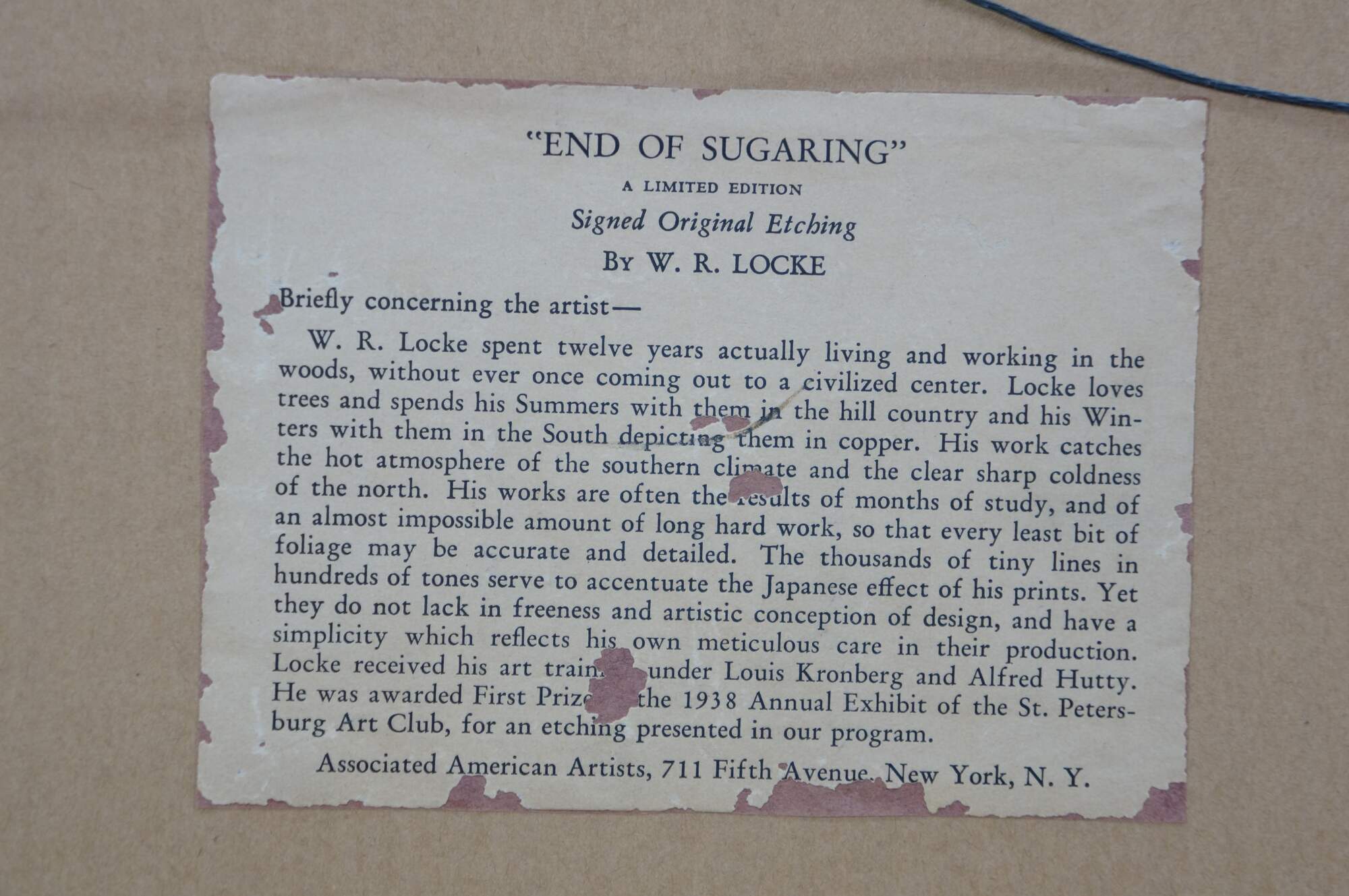"Walter Ronald Locke (1883 - 1949) was an etcher best known for his landscapes. He resided in Florida and many of his surviving works are of Florida scenes, although he also made prints of places elsewhere in the United States. Locke was born in Winchester, Massachusetts, and studied art under Louis Kronberg and Alfred Hutty. During his lifetime, he exhibited at the Library of Congress and Society of American Etchers. He was also affiliated with Associated American Artists, an organization founded to produce and market fine art prints nationwide. The latter marketed his prints with a biography that noted "[h]is works are often the results of months of study, and of an almost impossible amount of long hard work, so that every least bit of foliage may be accurate and detailed." His works are in the collections of the Albright-Knox Art Gallery, Buffalo; Nelson-Atkins Museum of Art, Kansas City; Carnegie Museums, Pittsburgh; the Butler Institute of American Art, Youngstown; and the Yale University Art Gallery." (askART)