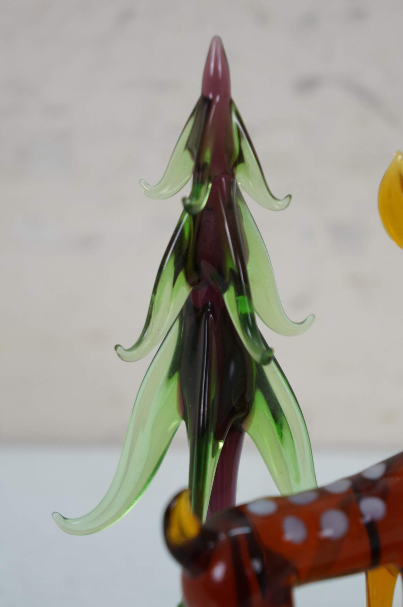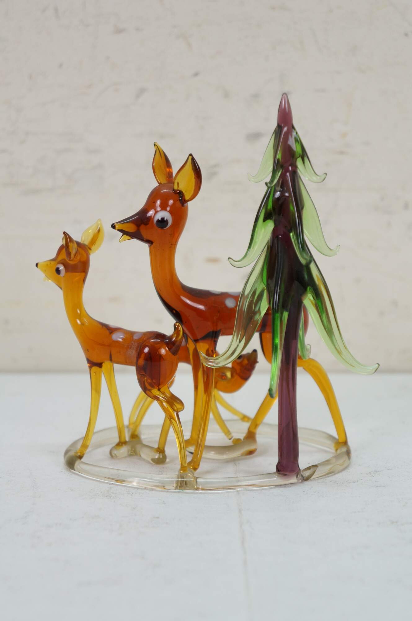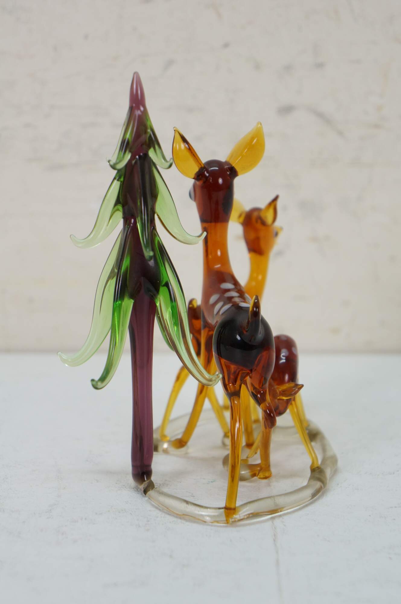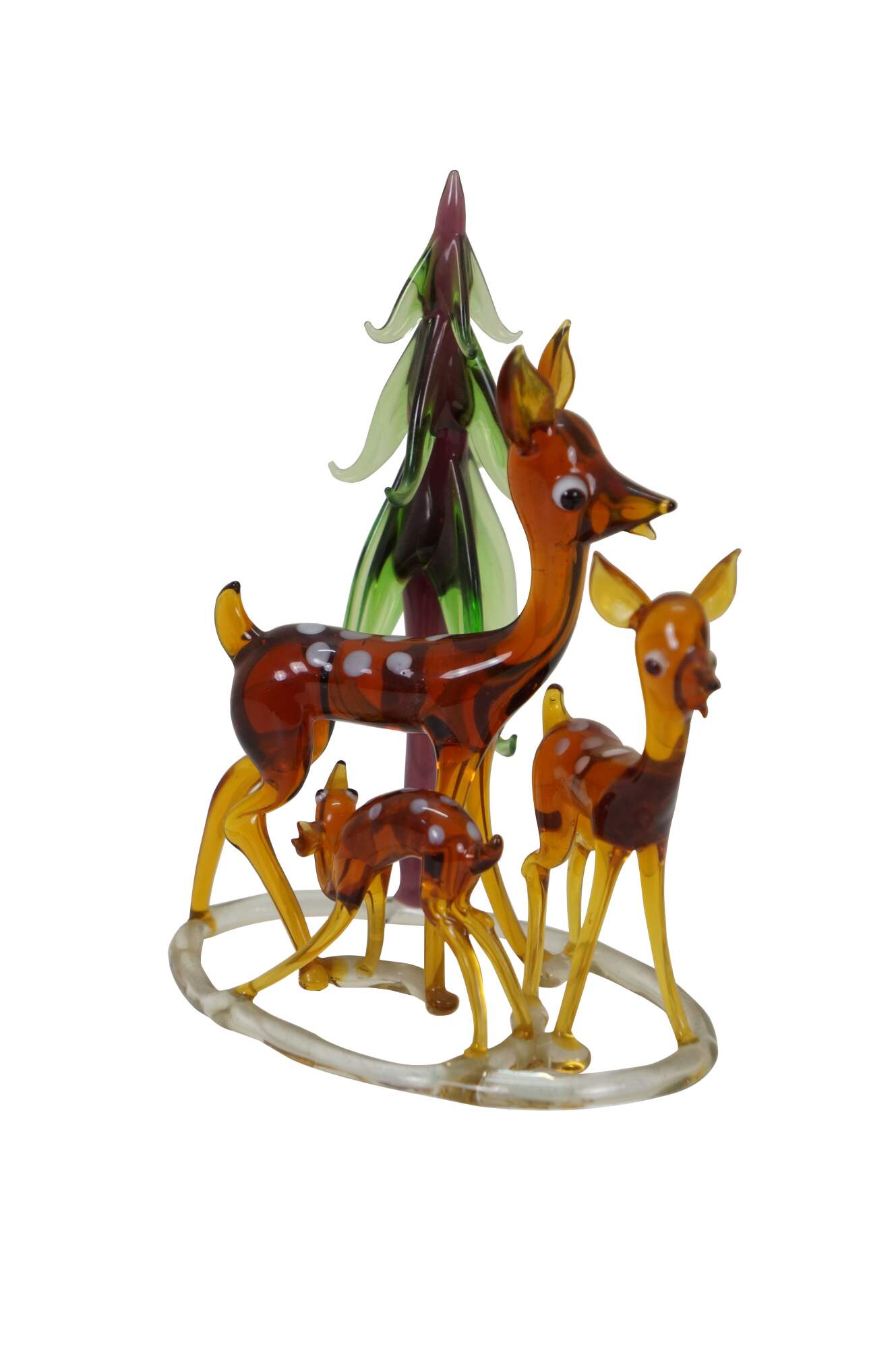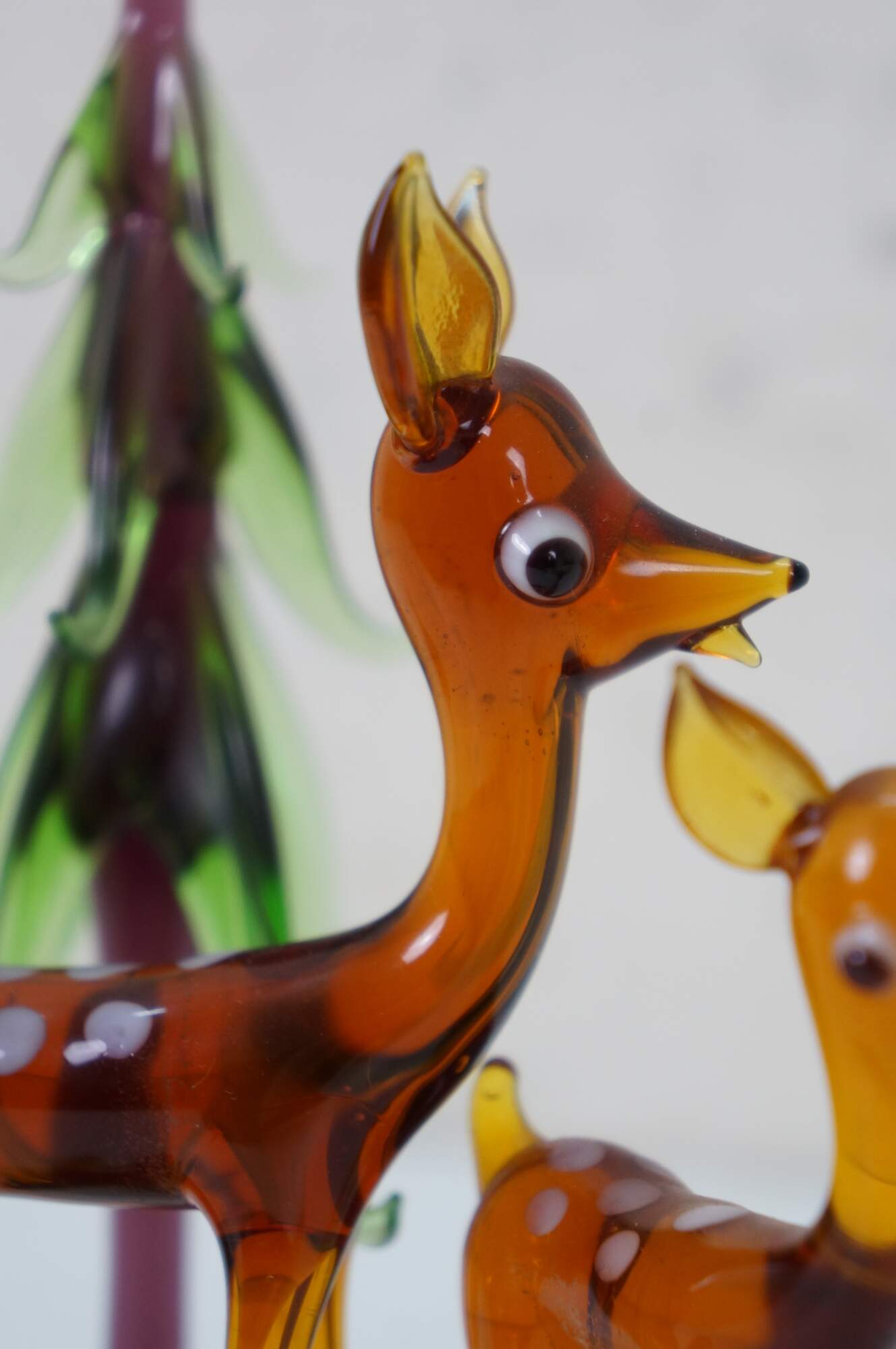 Mid to late 20th century hand blown art glass figurine in the shape of a mother deer and pair of fawns, standing next to a pine tree. Christmas. Bambi.