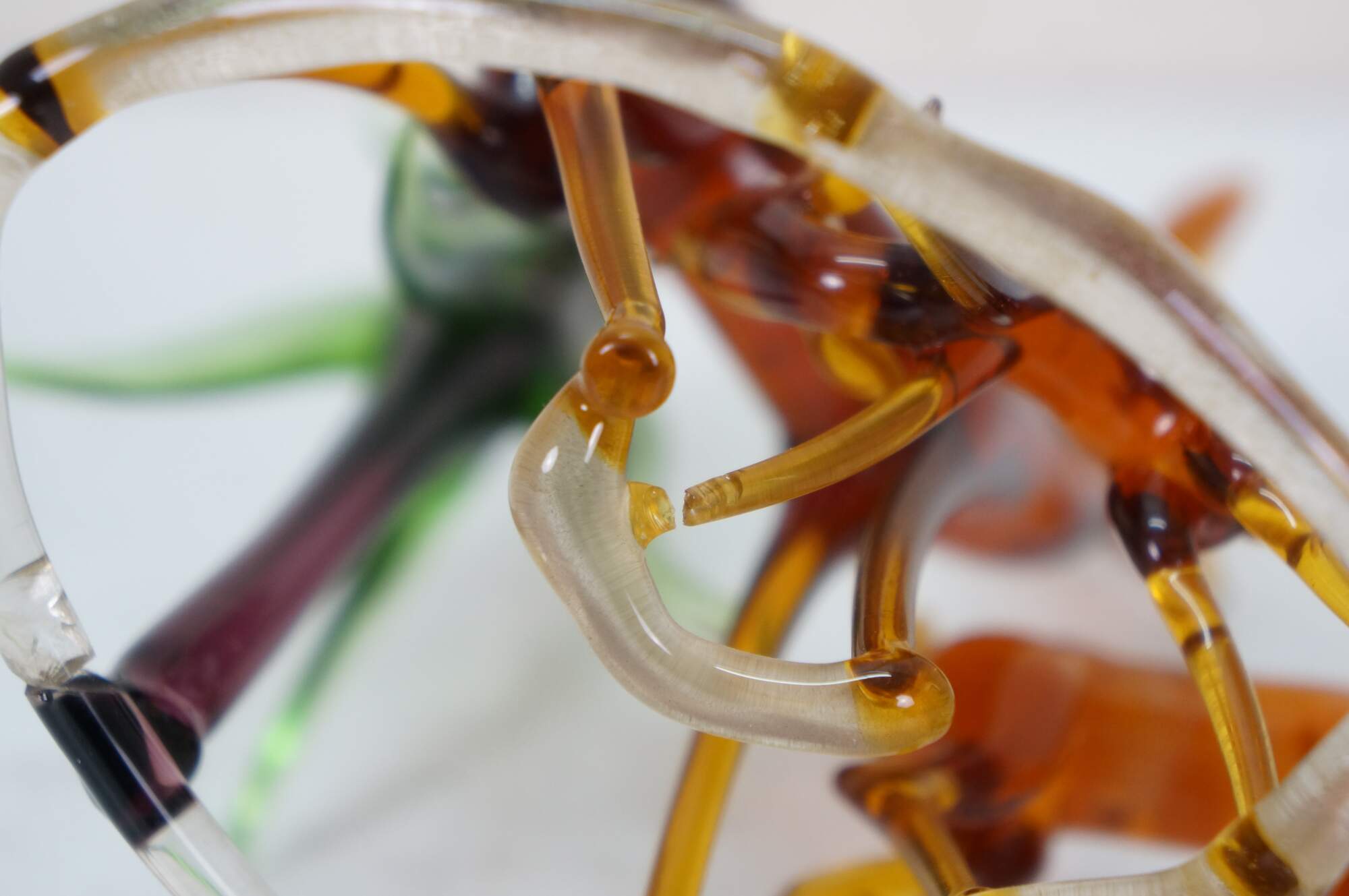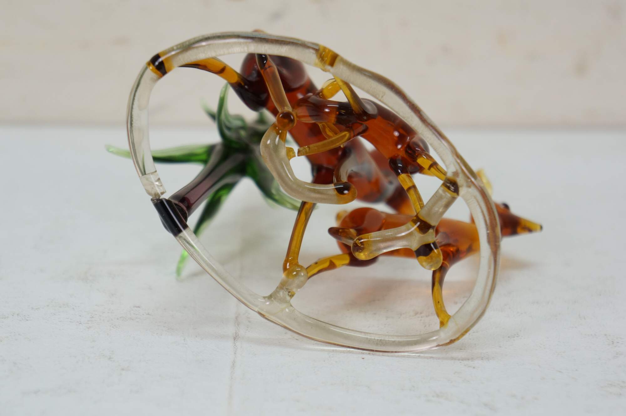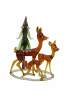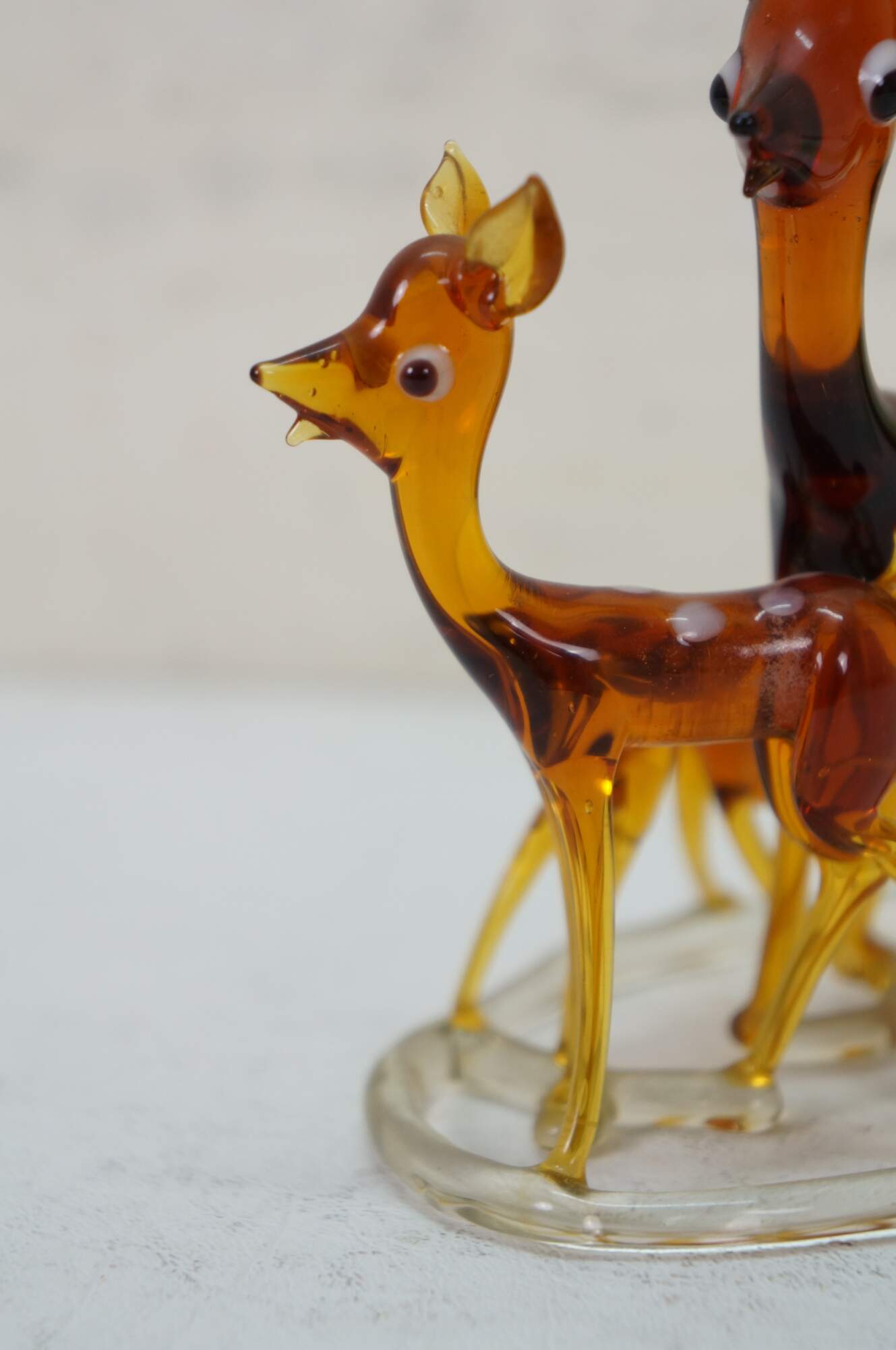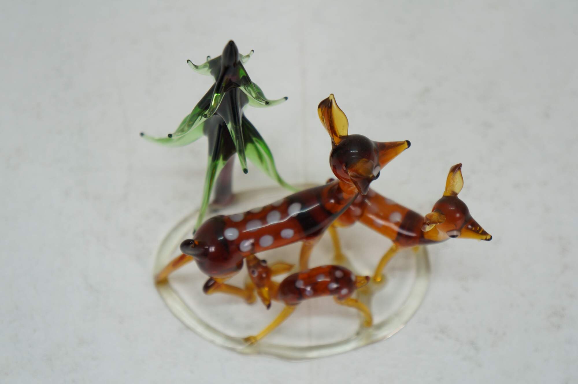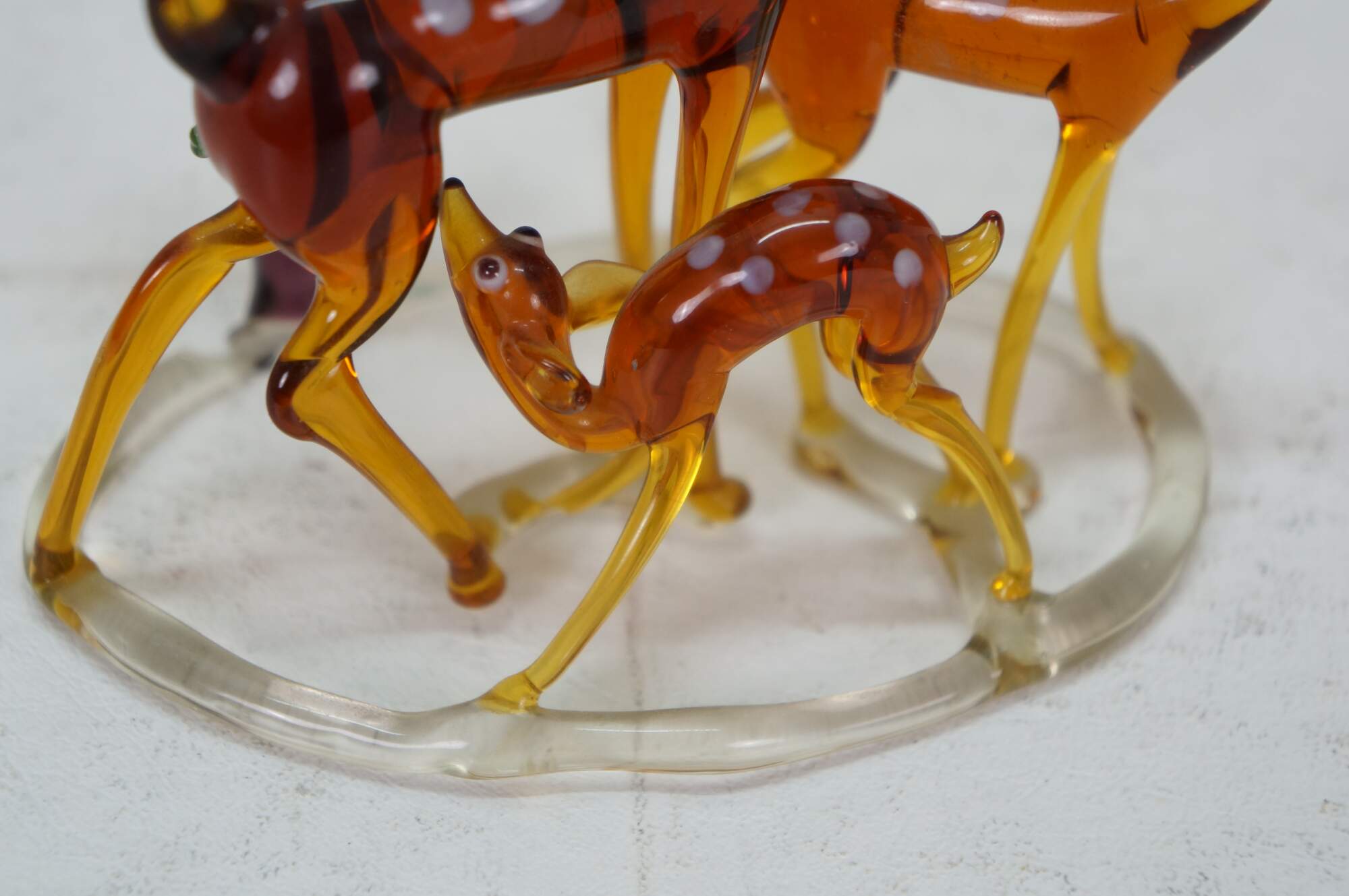 Mid to late 20th century hand blown art glass figurine in the shape of a mother deer and pair of fawns, standing next to a pine tree. Christmas. Bambi.
