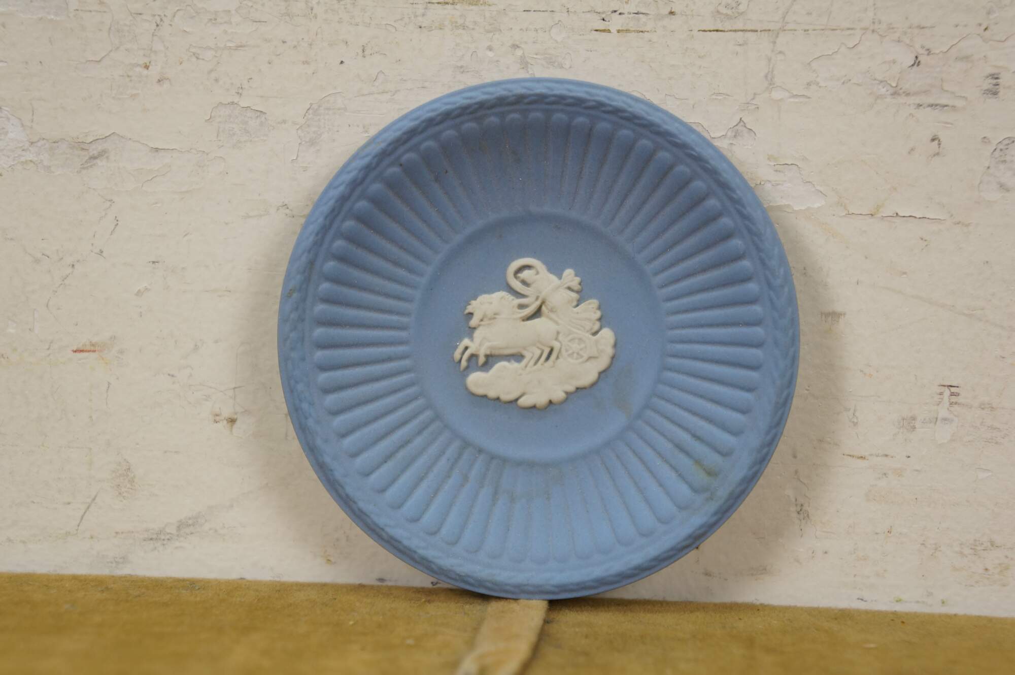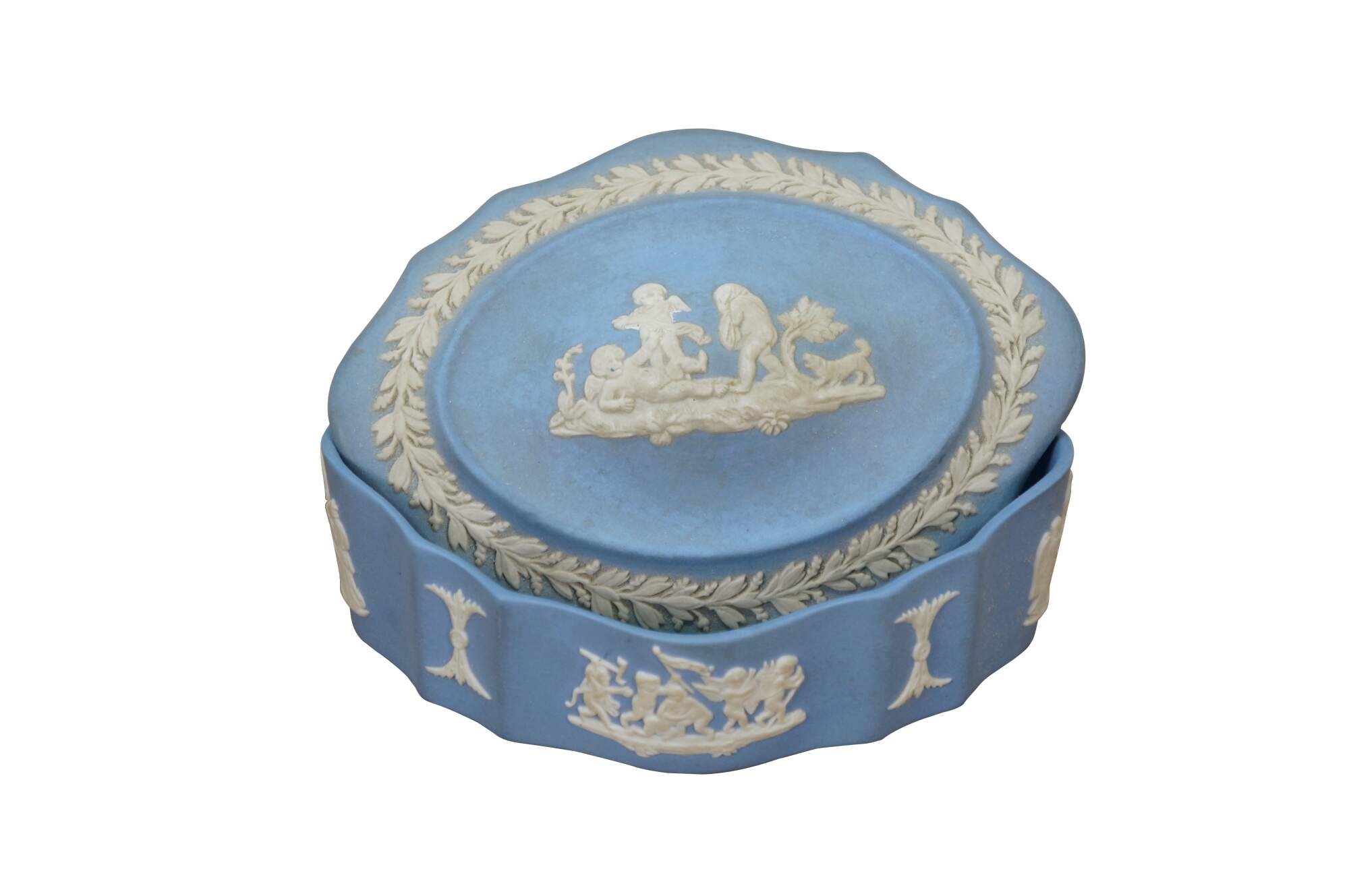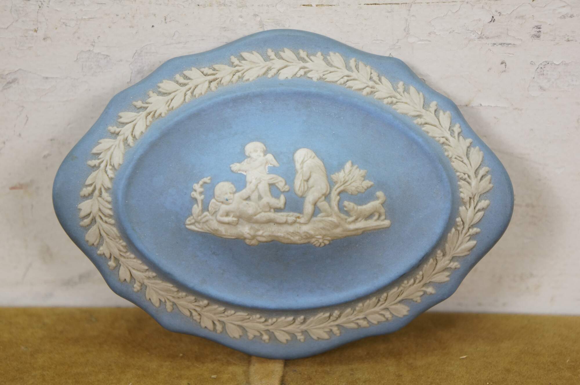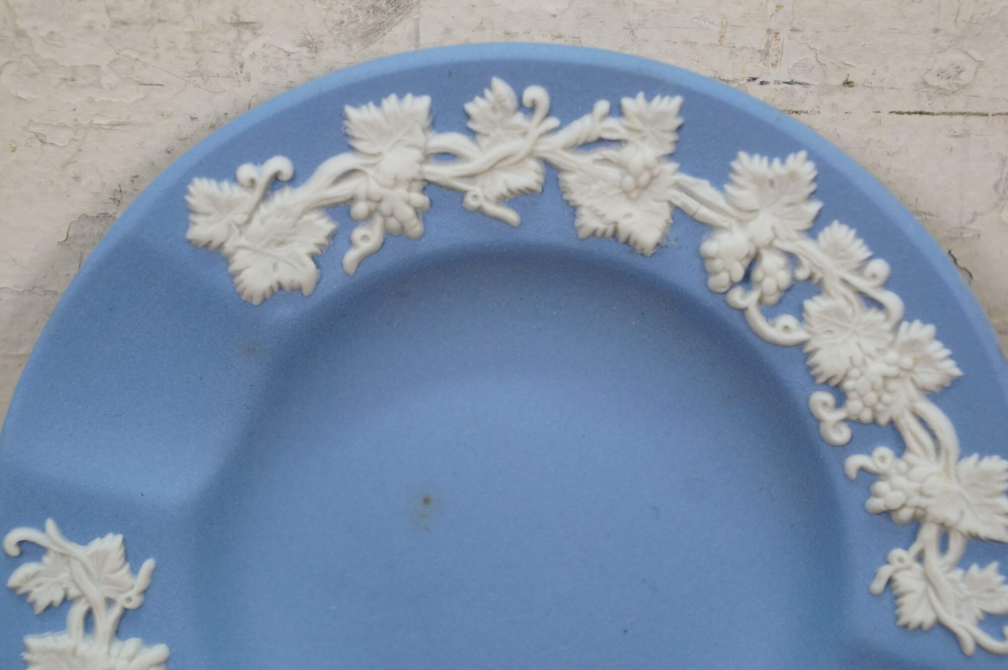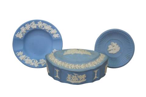 Three pieces of vintage 20th century Wedgwood lavender / blue and white jasperware. One dome topped oval trinket box with neoclassical cherubs and acanthus leaves, one personal ashtray trimmed in grapevine, and one miniature dish showing Helios on his chariot.