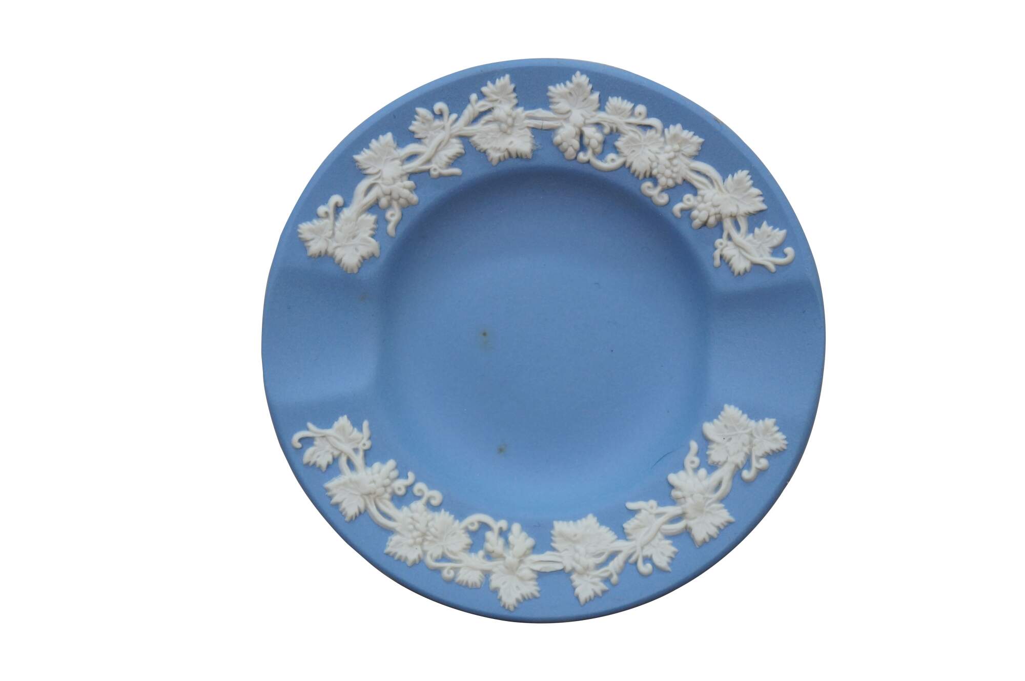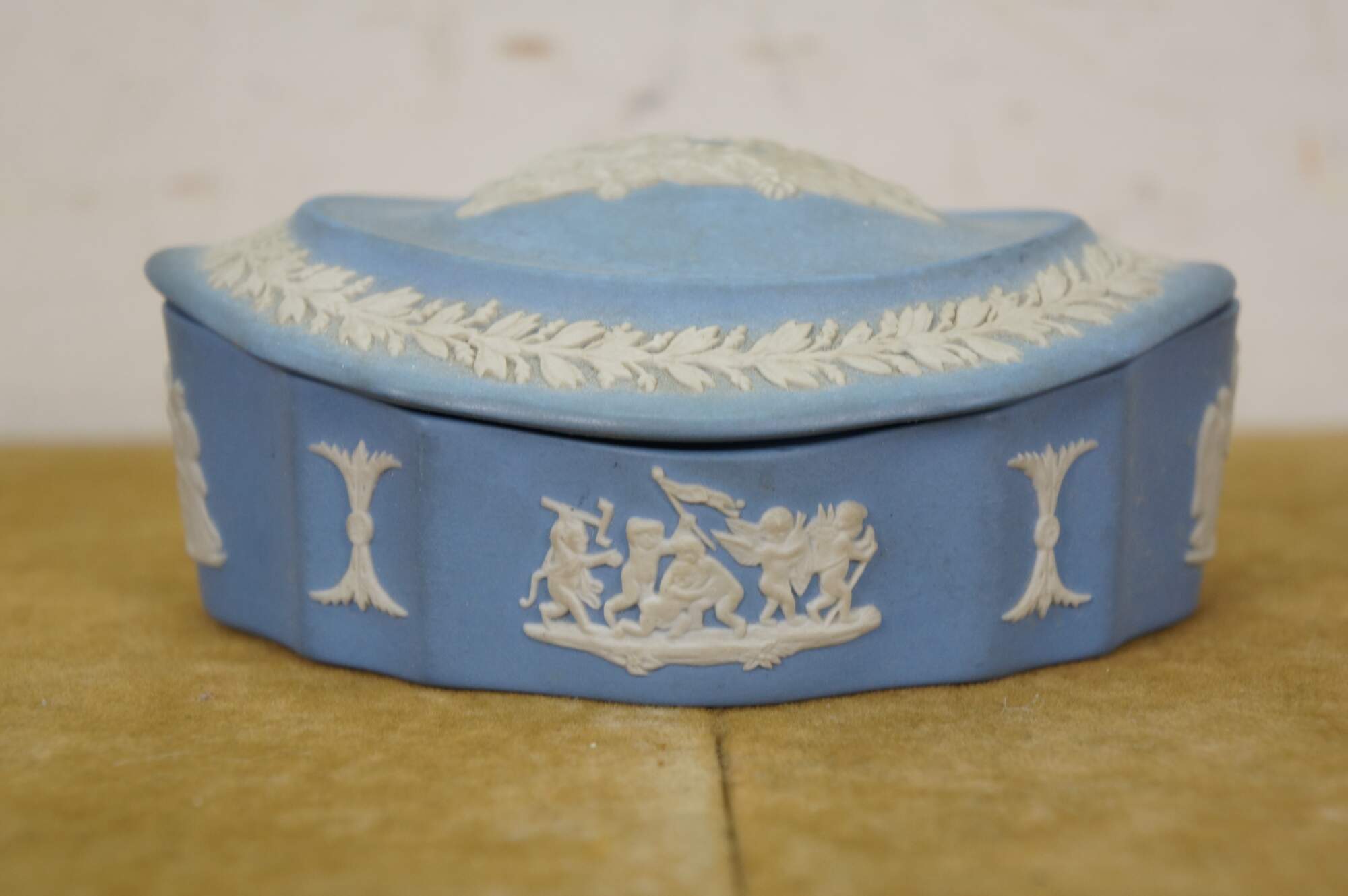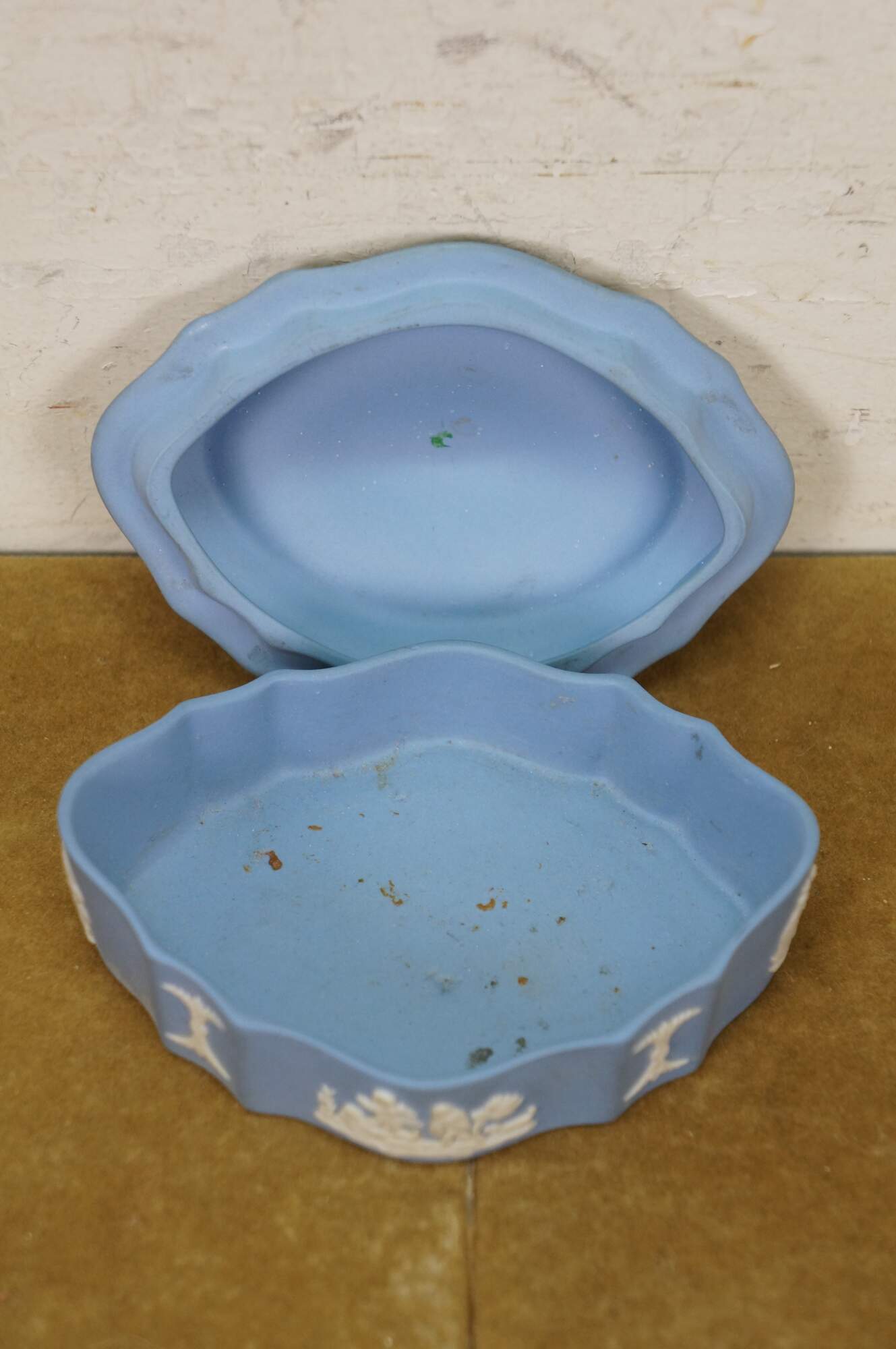 Three pieces of vintage 20th century Wedgwood lavender / blue and white jasperware. One dome topped oval trinket box with neoclassical cherubs and acanthus leaves, one personal ashtray trimmed in grapevine, and one miniature dish showing Helios on his chariot.