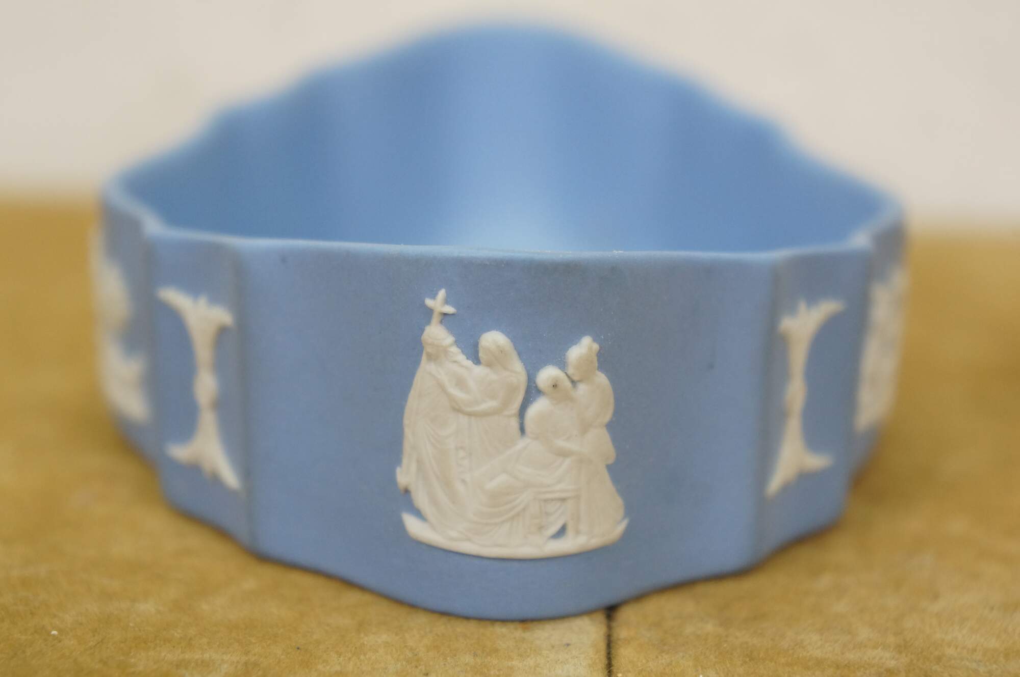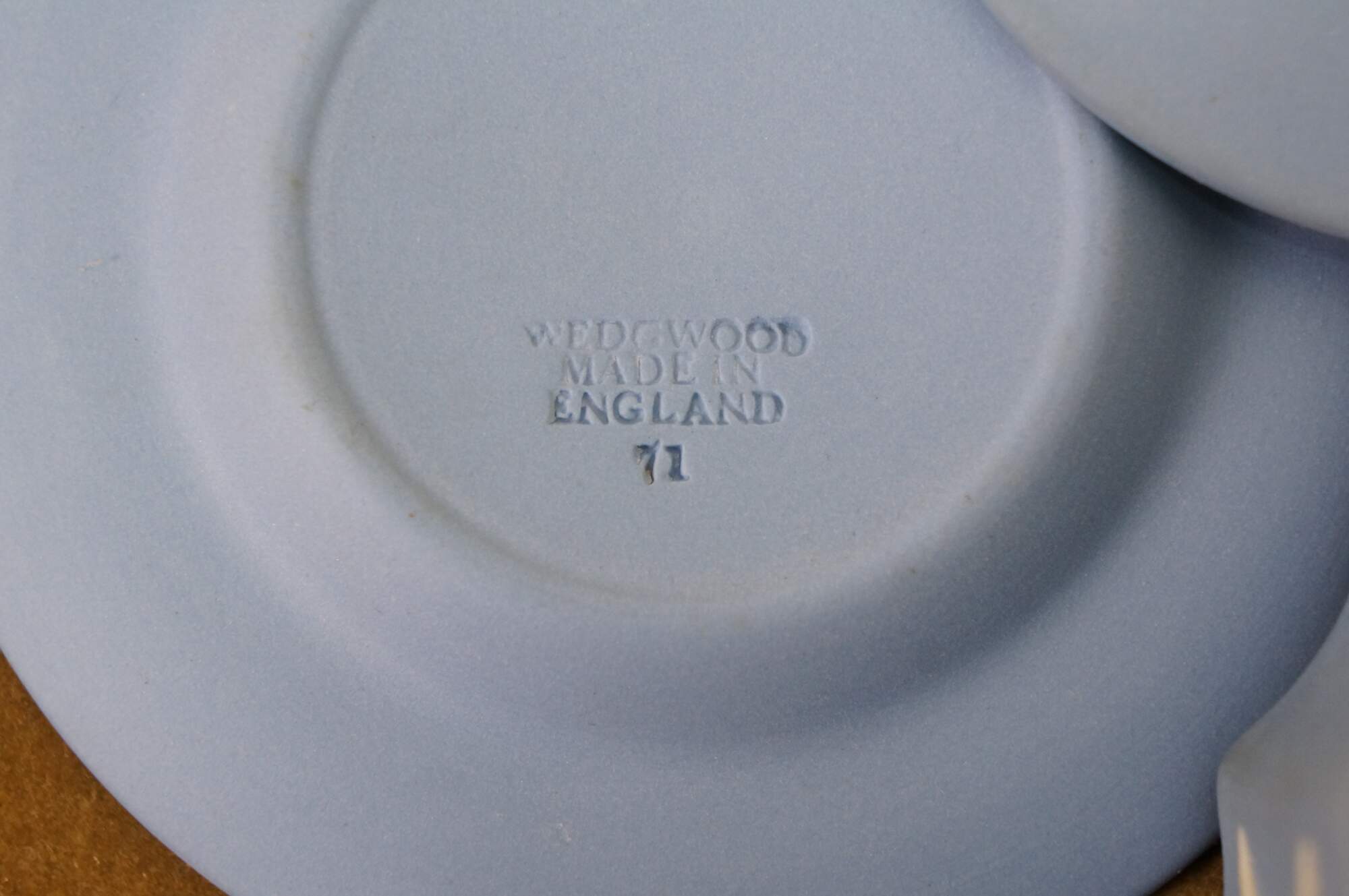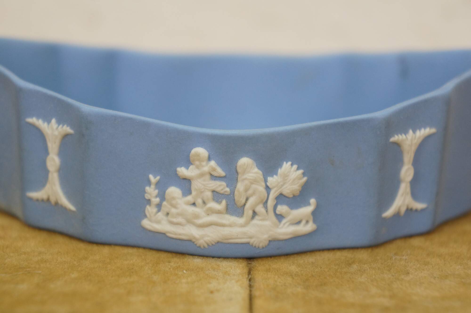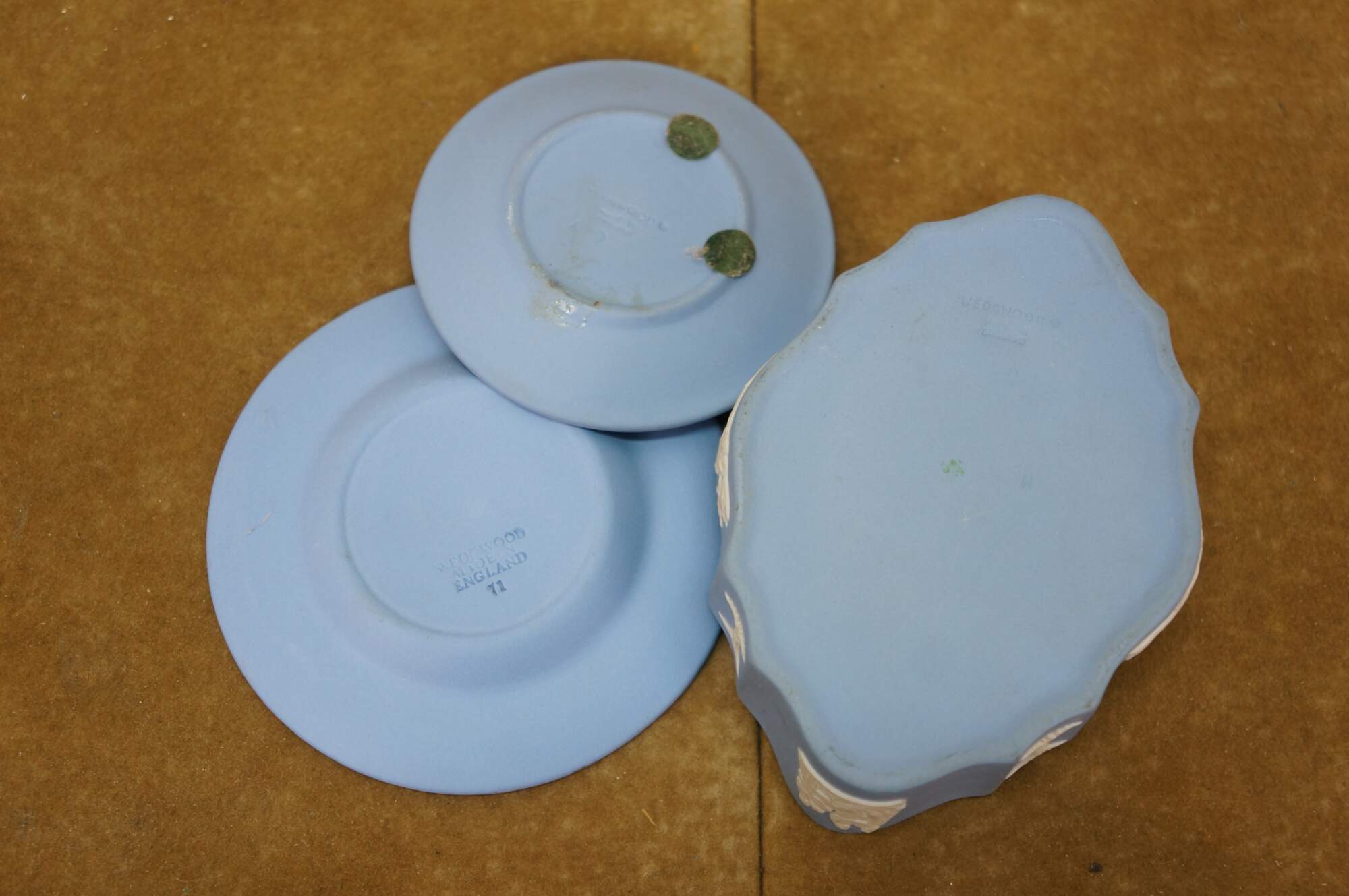 Three pieces of vintage 20th century Wedgwood lavender / blue and white jasperware. One dome topped oval trinket box with neoclassical cherubs and acanthus leaves, one personal ashtray trimmed in grapevine, and one miniature dish showing Helios on his chariot.