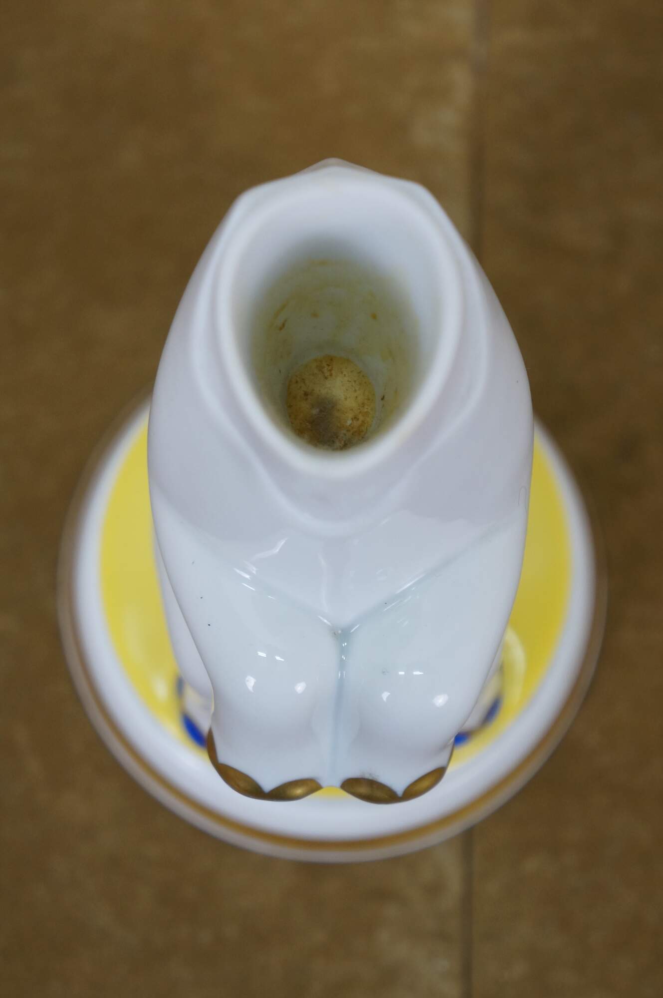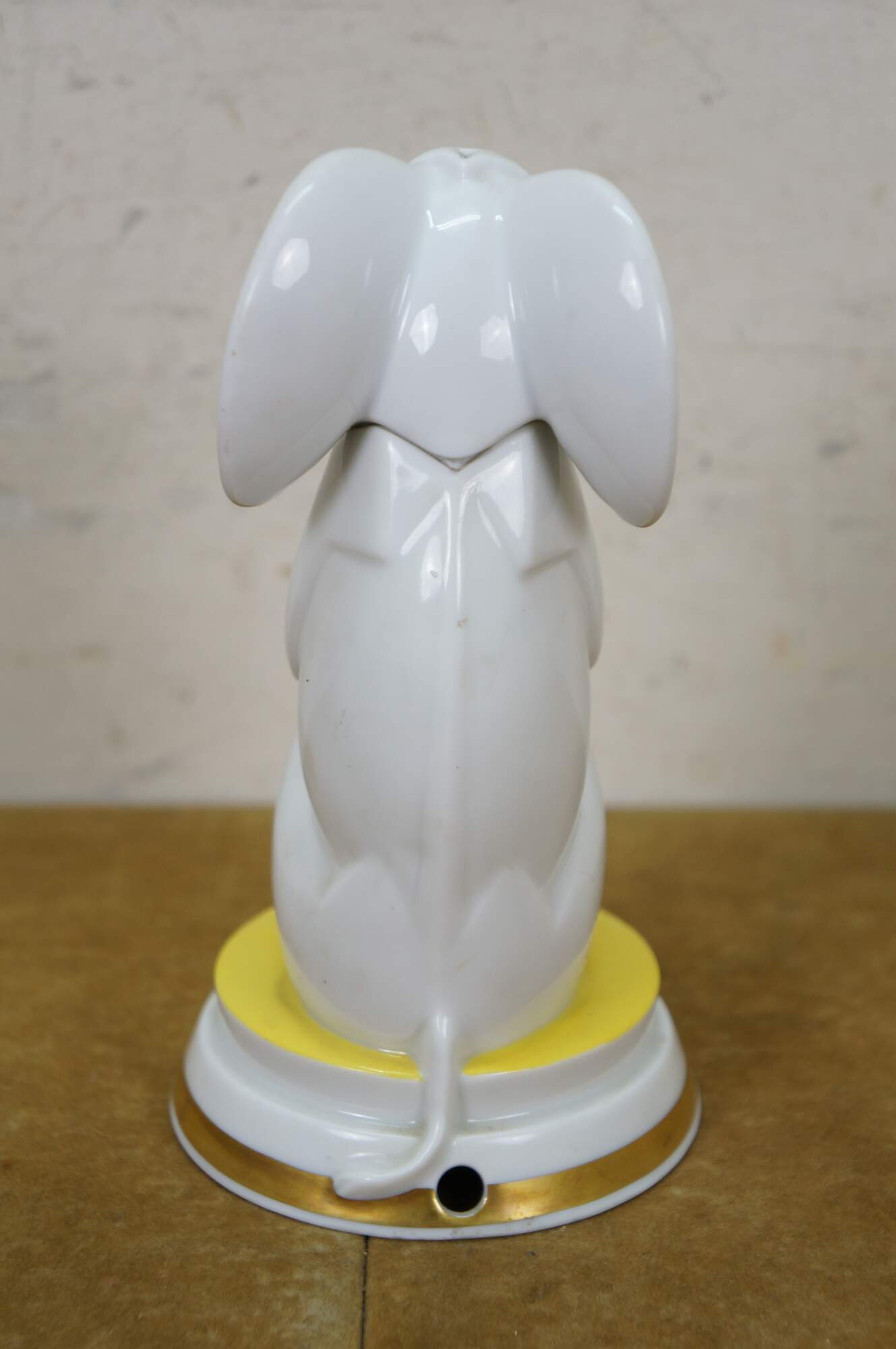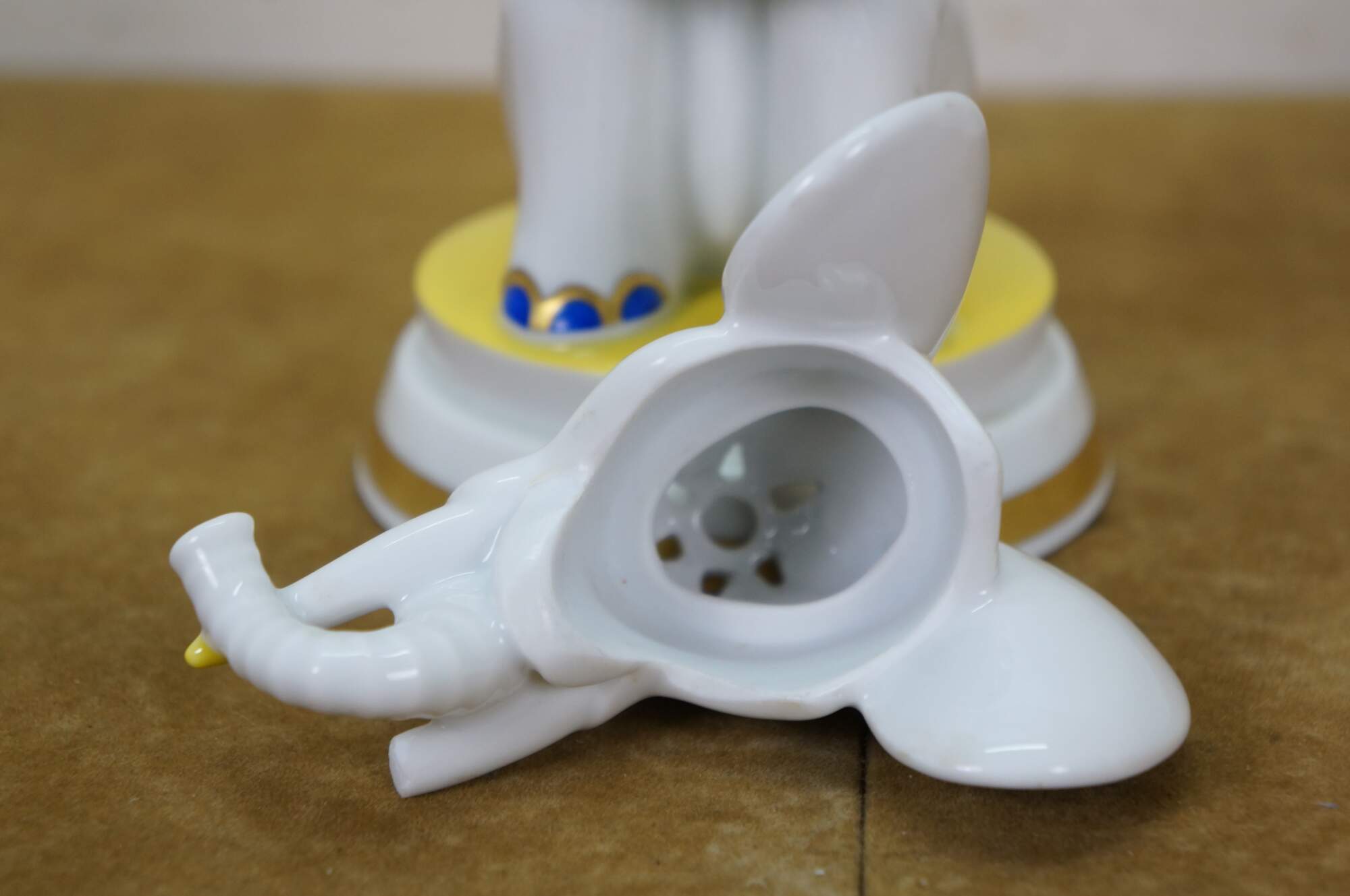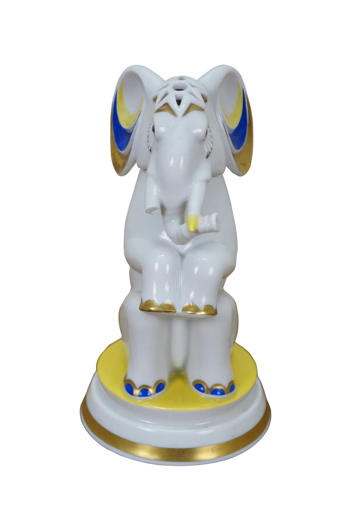 Rare antique Art Deco 1930 Rosenthal Grotesque Elephant Aroma diffuser figurine lamp designed by Hans Kuster. H1101. White porcelain circus / Indian style elephant seated upright on a round pedestal, painted with gold, blue, and yellow details, fringed eyes and pierced star on top of the head. Head removes to reveal a depression for inserting perfume oils, which are warmed by the bulb concealed inside the base.