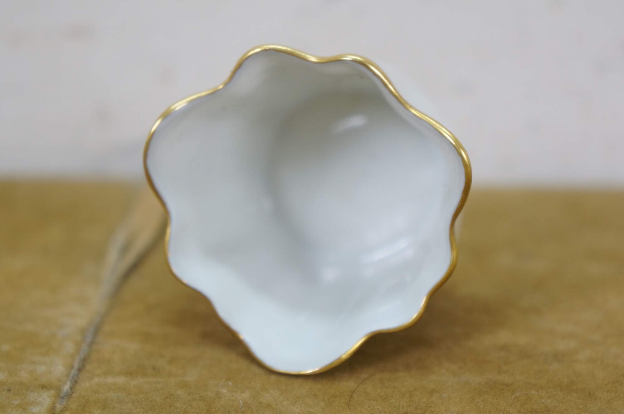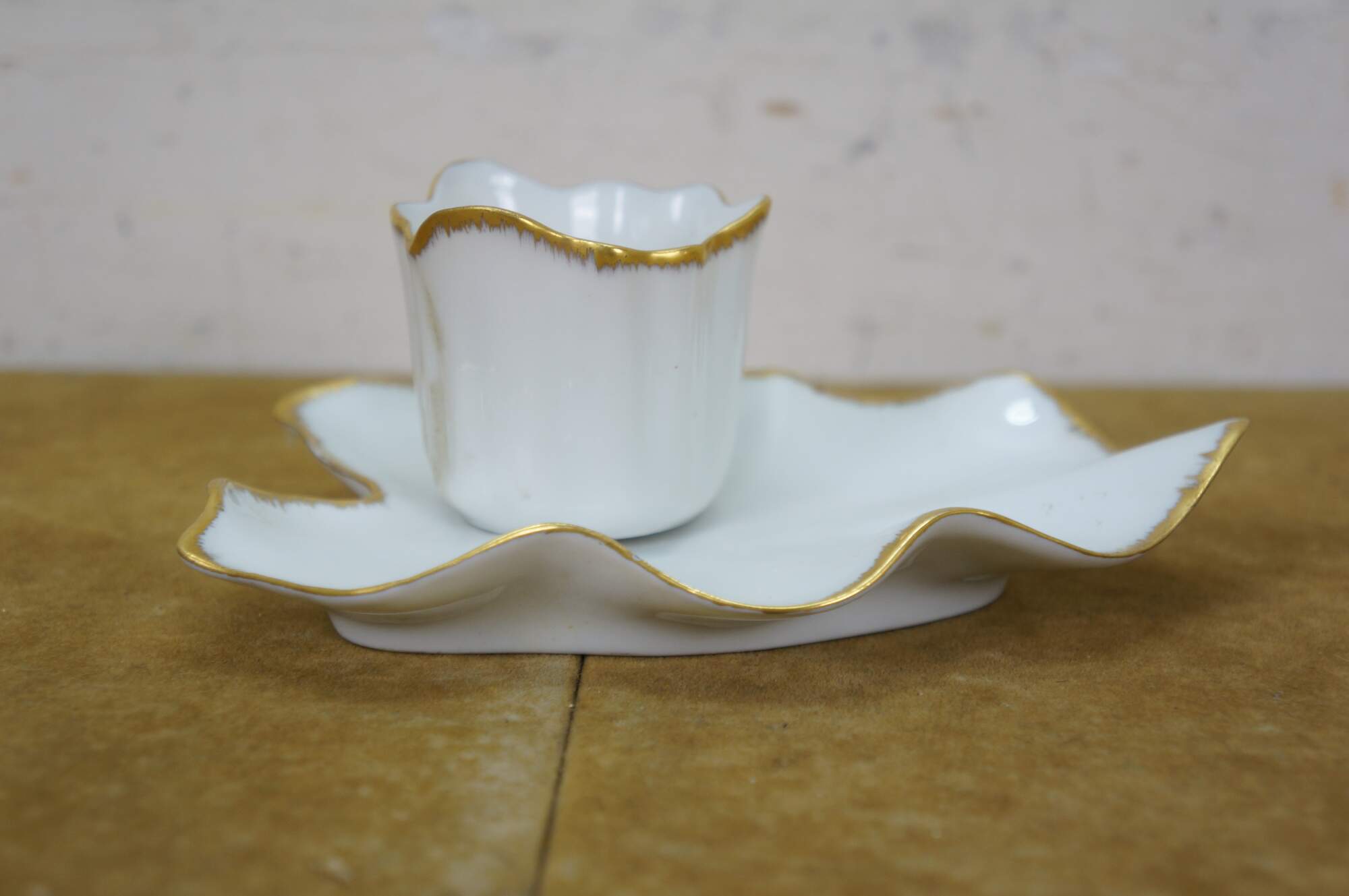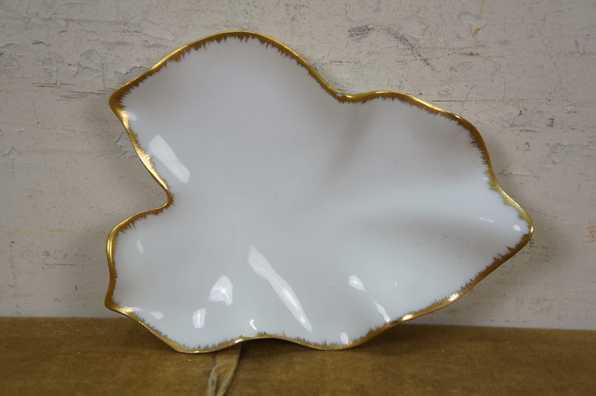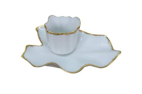 Vintage 20th century Limoges France white porcelain demitasse coffee cup and saucer in the shape of a flower blossom and a curling leaf, trimmed with gold.