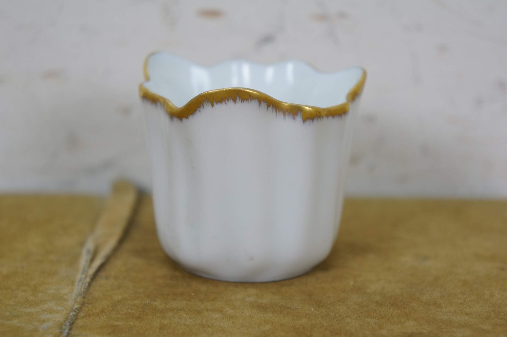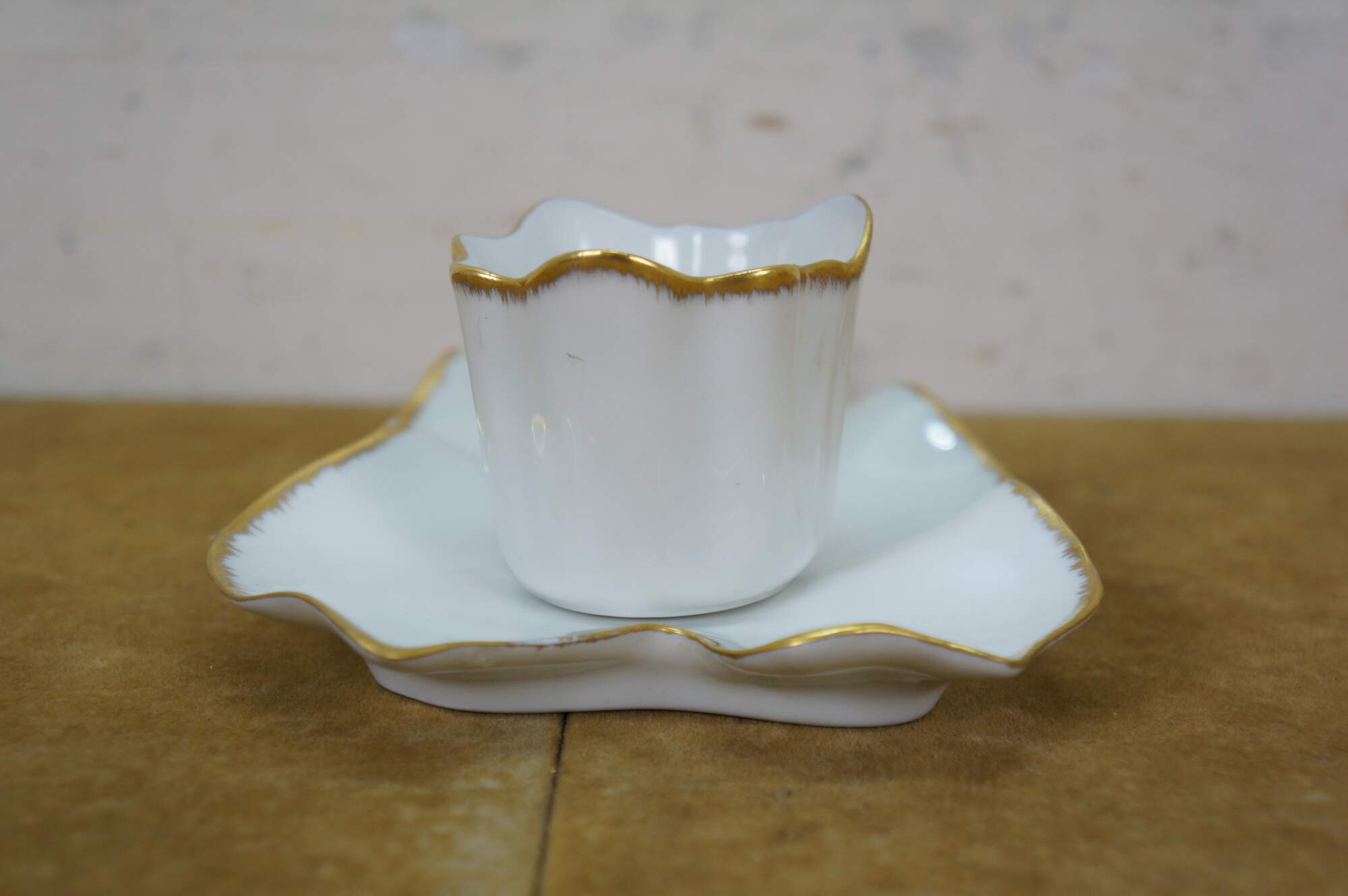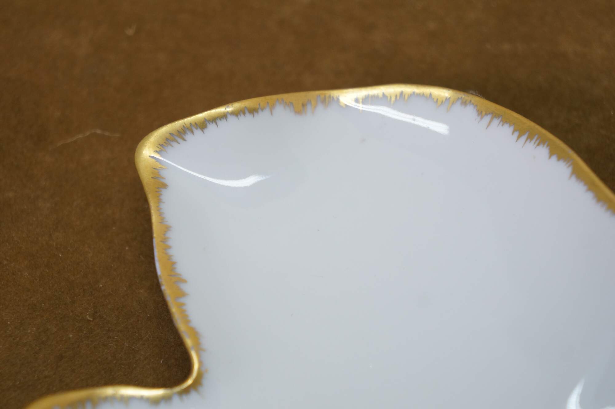 Vintage 20th century Limoges France white porcelain demitasse coffee cup and saucer in the shape of a flower blossom and a curling leaf, trimmed with gold.