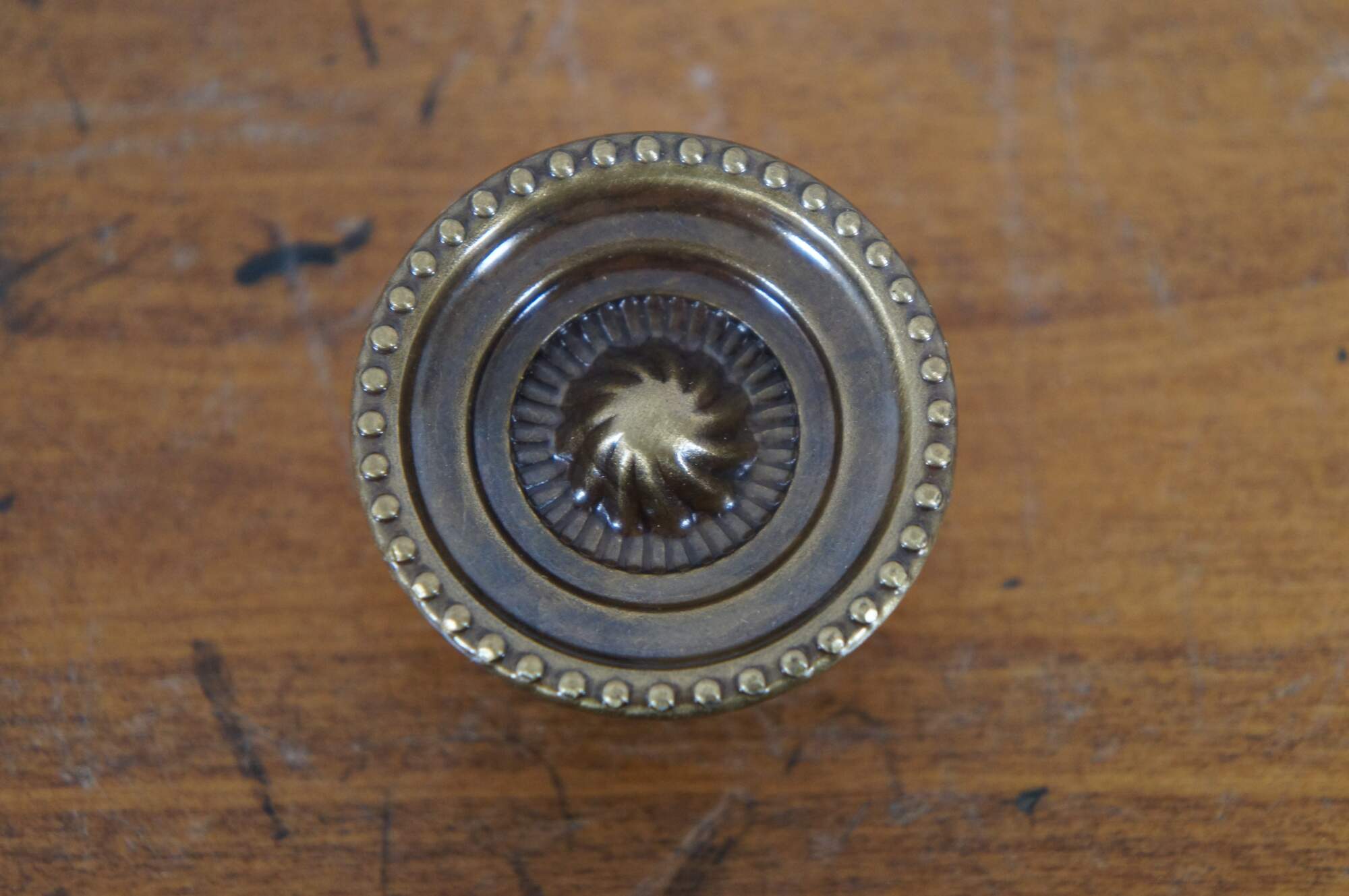 31 Available - Mid to late 20th century old-stock drawer / cabinet pulls. National Lock Company - Medalist, item number C606-4A Knob. Antique brass finish. Round / circular shape with spiral sunburst at center, framed in concentric grooves and beaded edge.