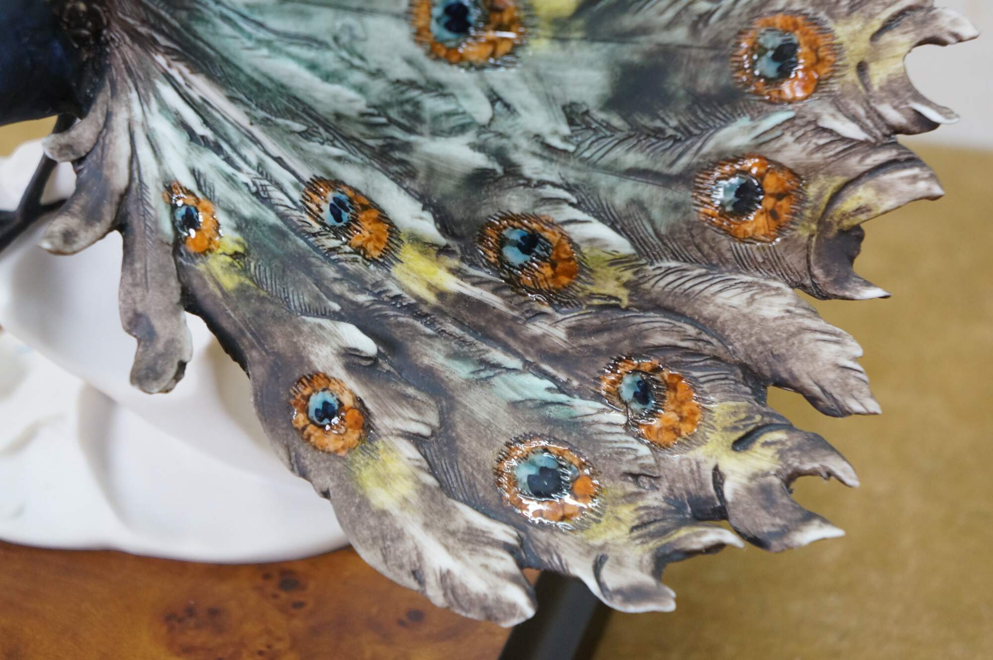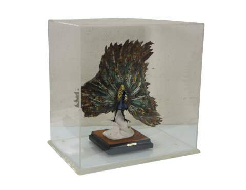 Rare vintage 1989 signed Italian Florentine Capodimonte ceramic sculpture number 0720 in the shape of a male peacock with tail feathers spread, designed by Giuseppe Armani and signed by the artist in 1991. Ceramic sculpture set on a black and burl square base. Florence Italy, copyright 1989, signed twice, and dated 11-16-91 on right signature. Includes acrylic display case.