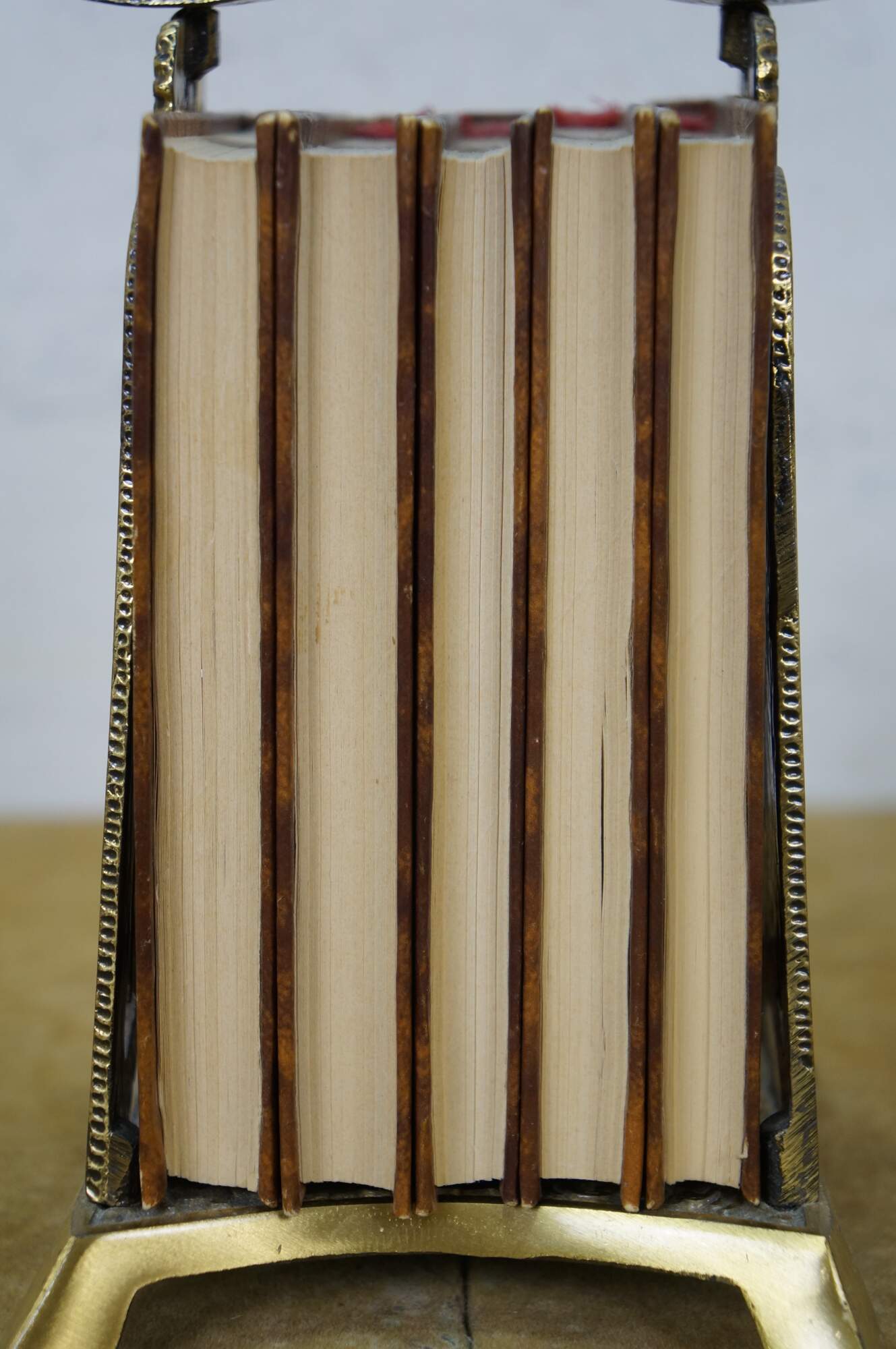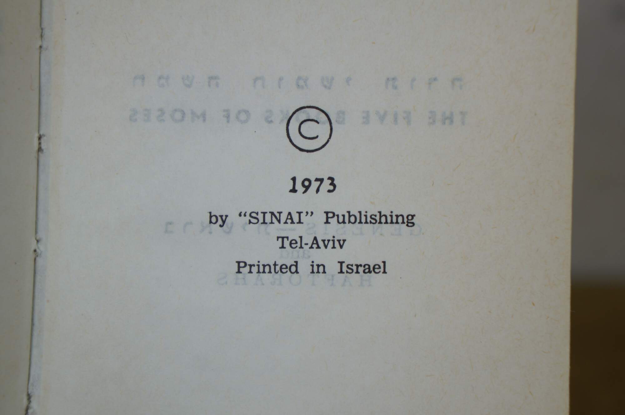 The Hebrew Bible with English Translation - The Five Books of Moses - Copyright 1973 by Sinai Publishing, Tel-Aviv - Printed in Israel. A parallel text set of of the Five Books of Moses / Pentateuch in Hebrew and English. Brown leatherette hard back / hard cover with enameled brass display stand featuring the Ten Commandments. Bar / Bat Mitzvah Torah Gift.
