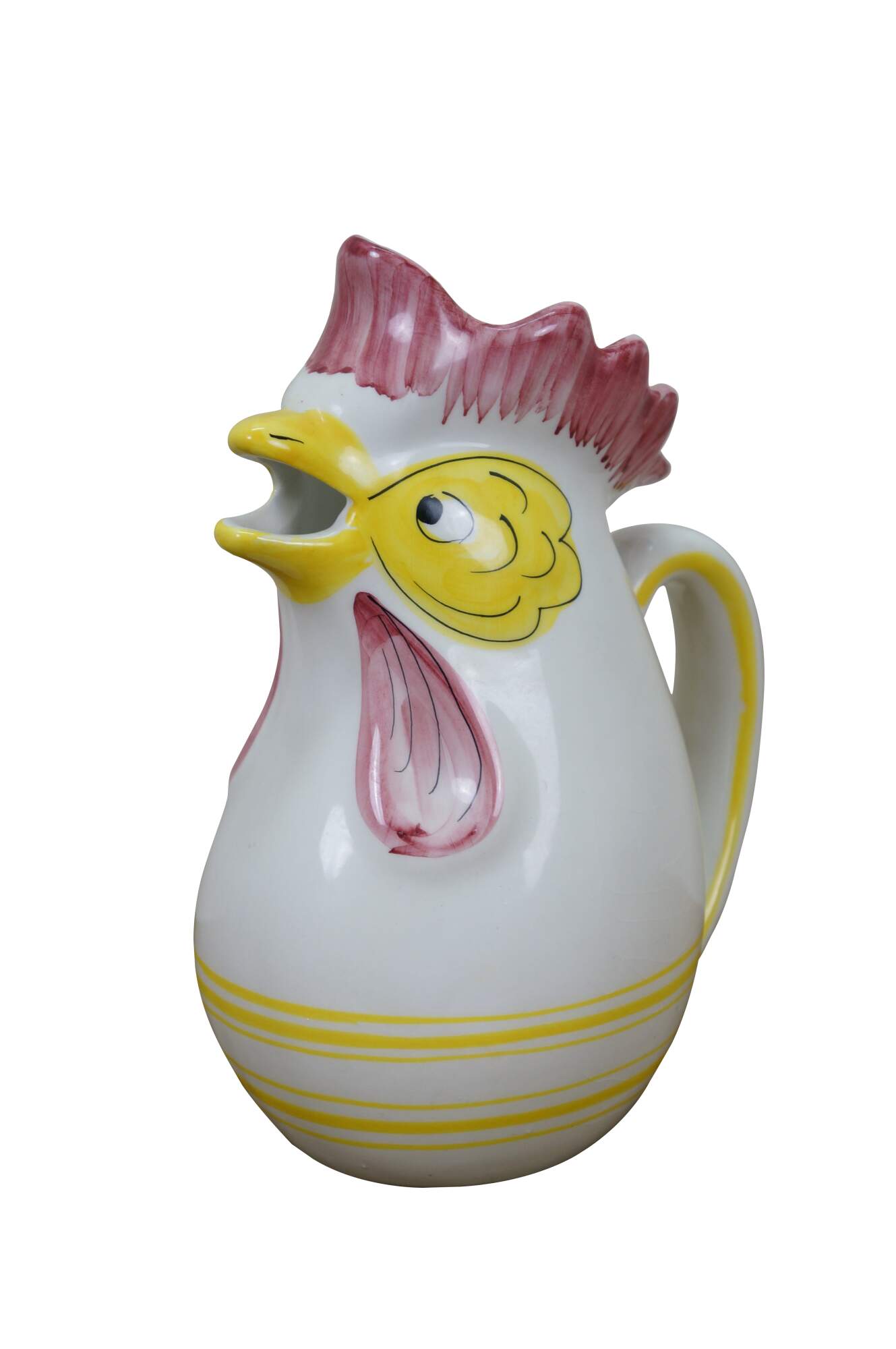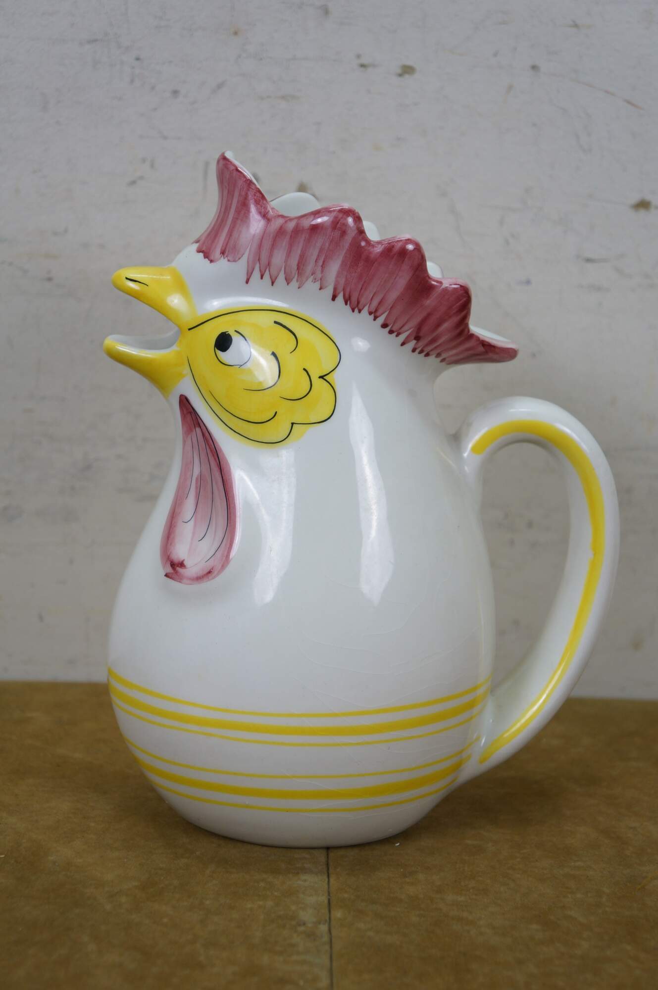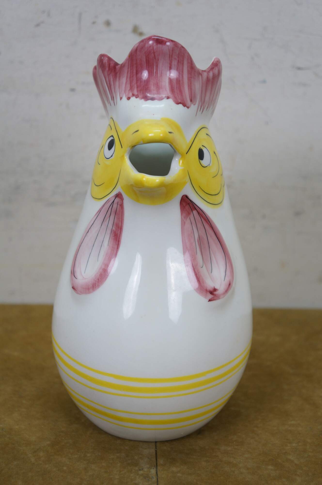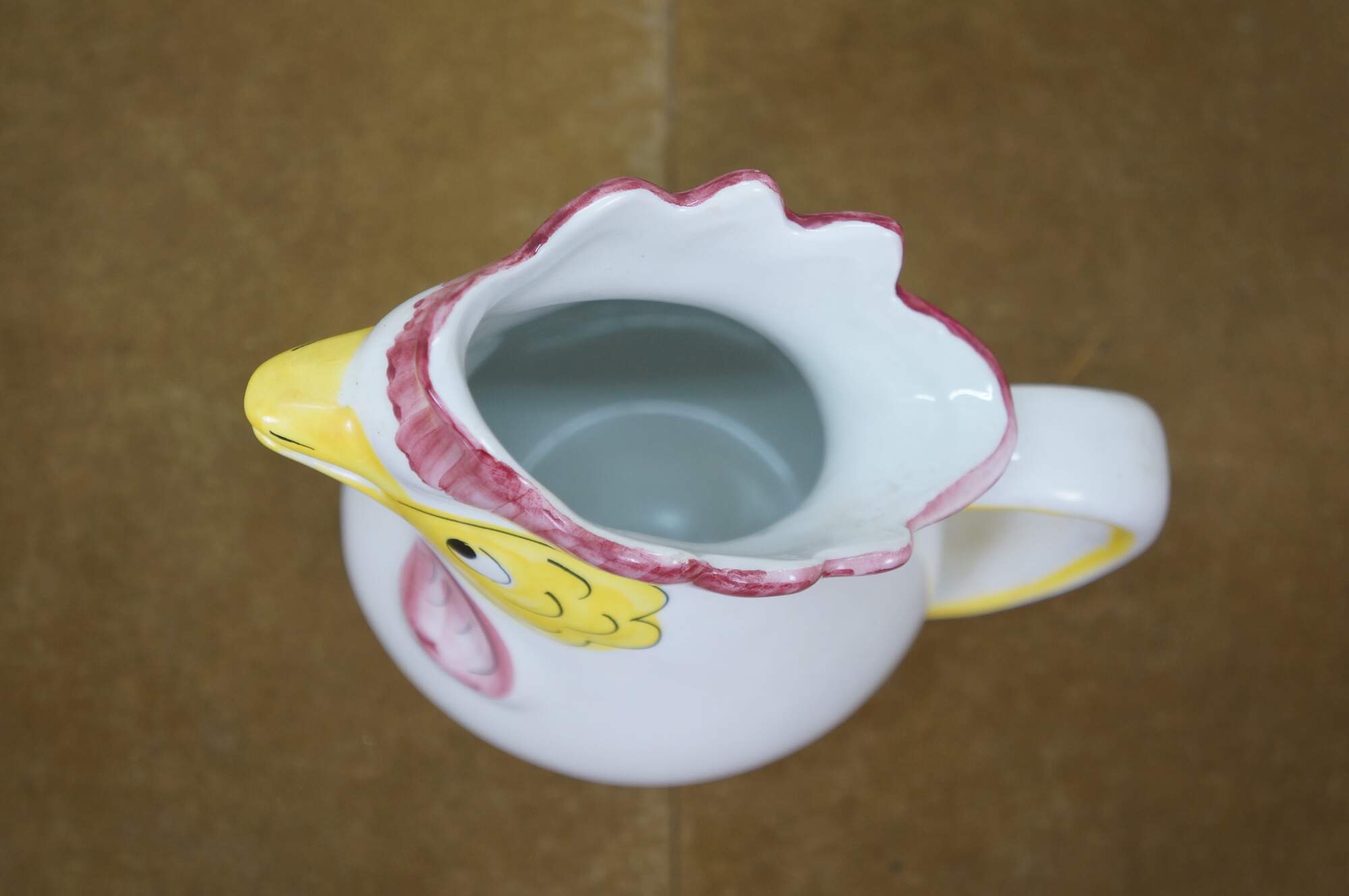Vintage 20th century porcelain water pitcher in the shape of a yellow and red chicken / rooster with open beak spout and striped base. Made in Italy. 64/1.