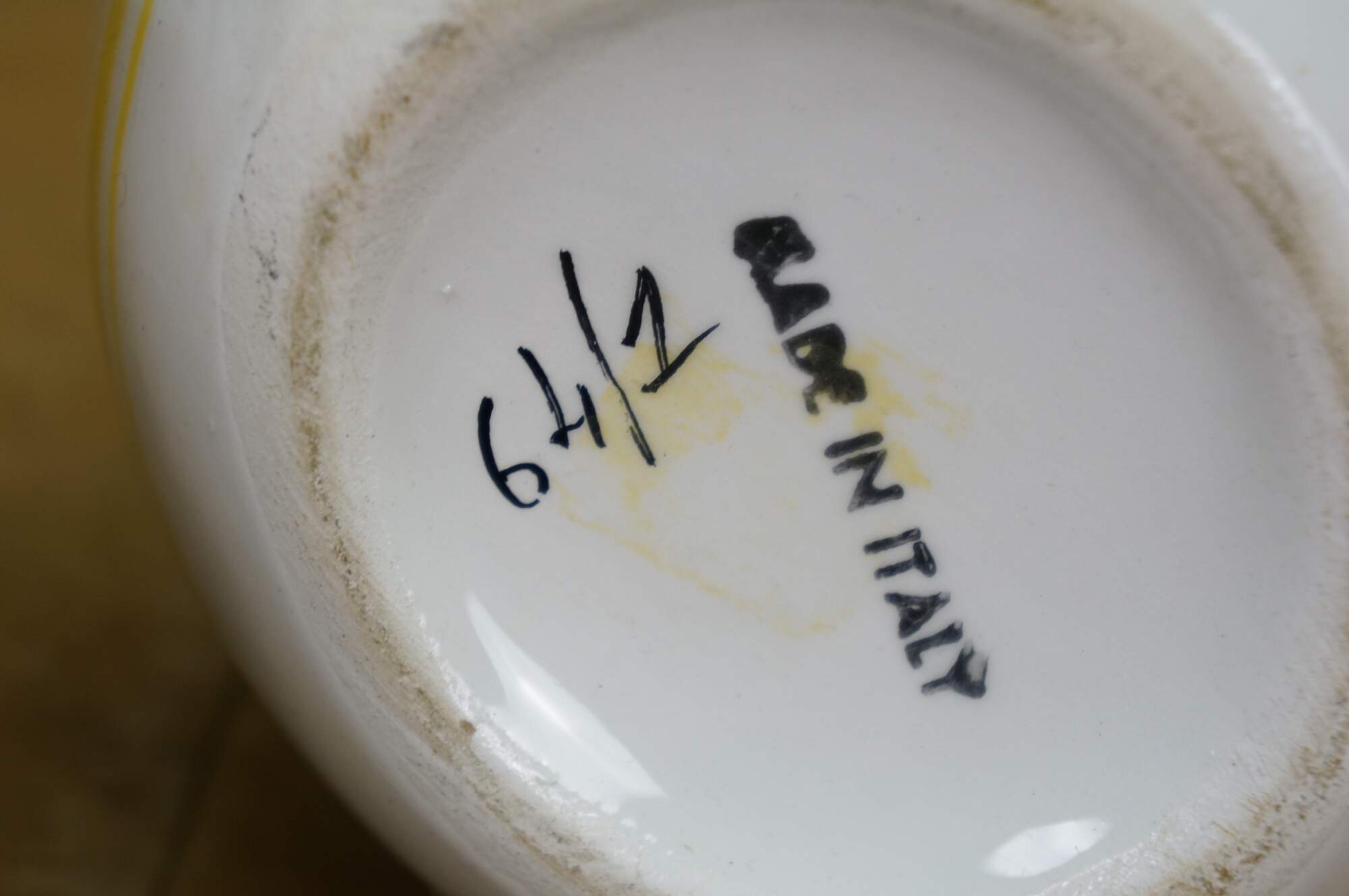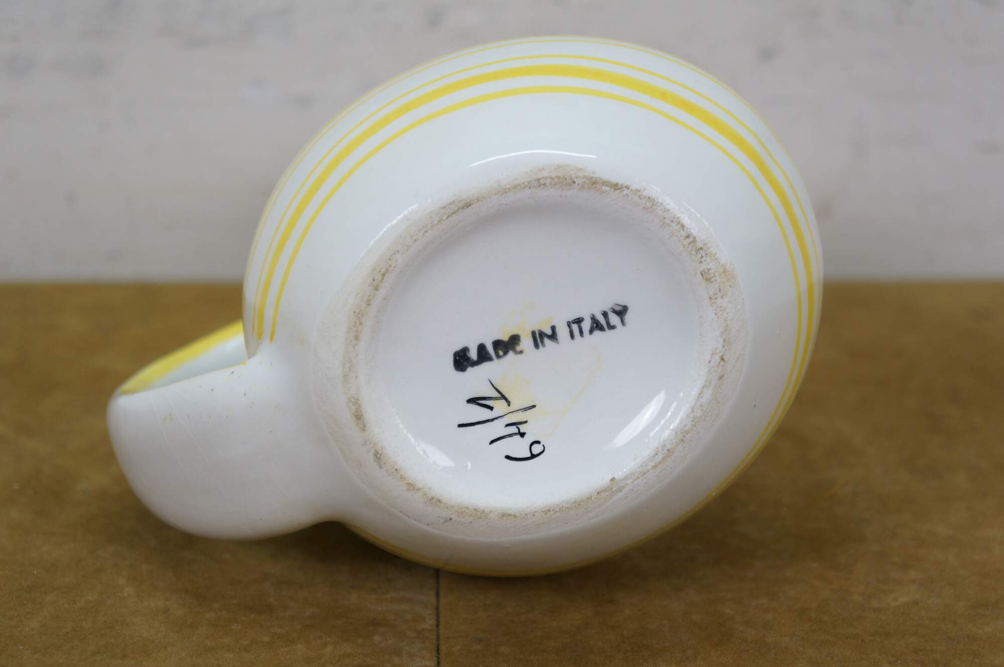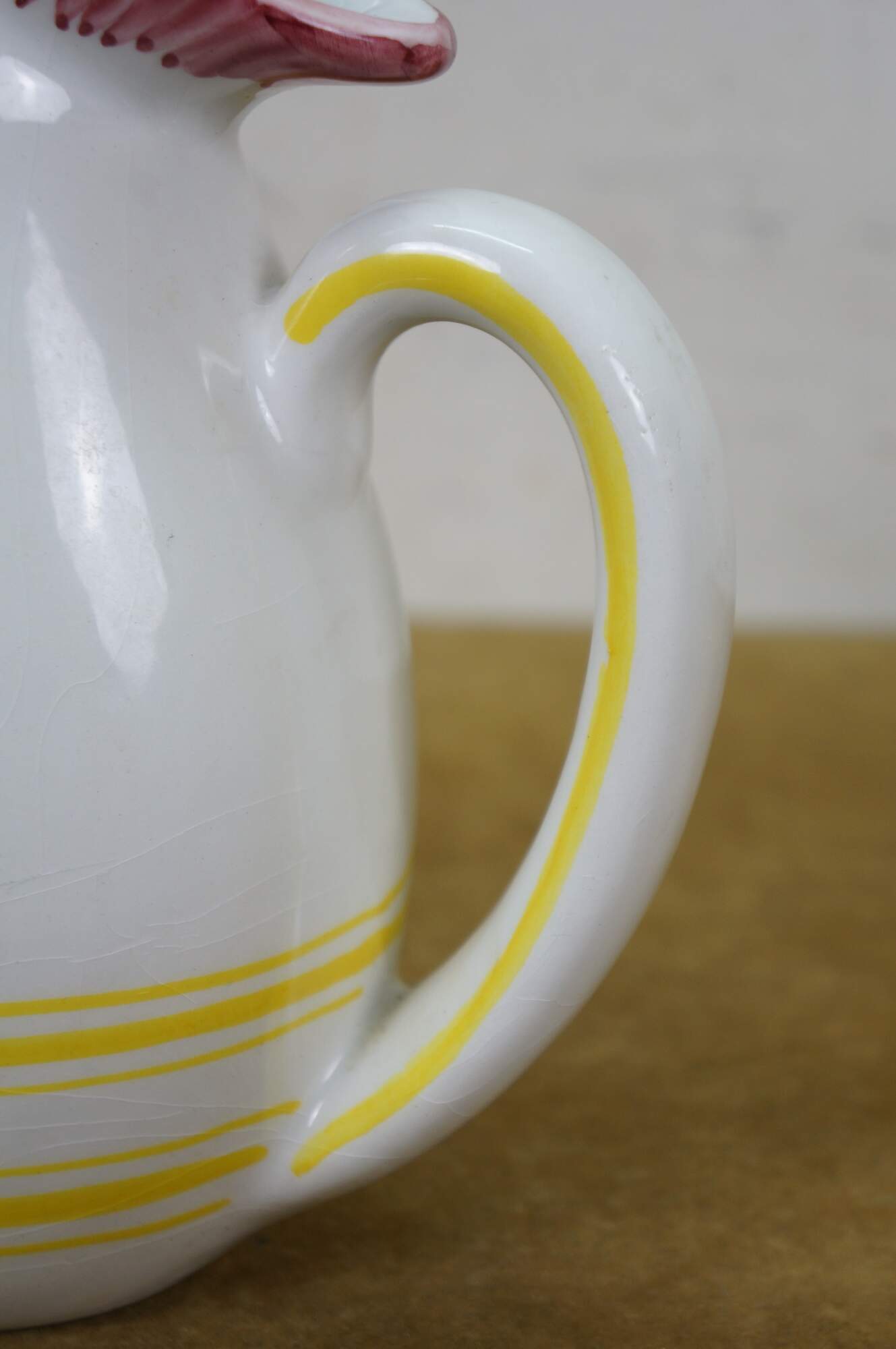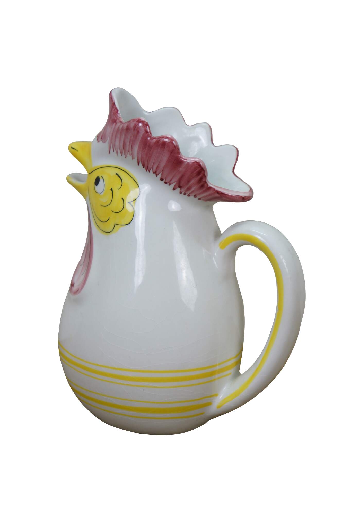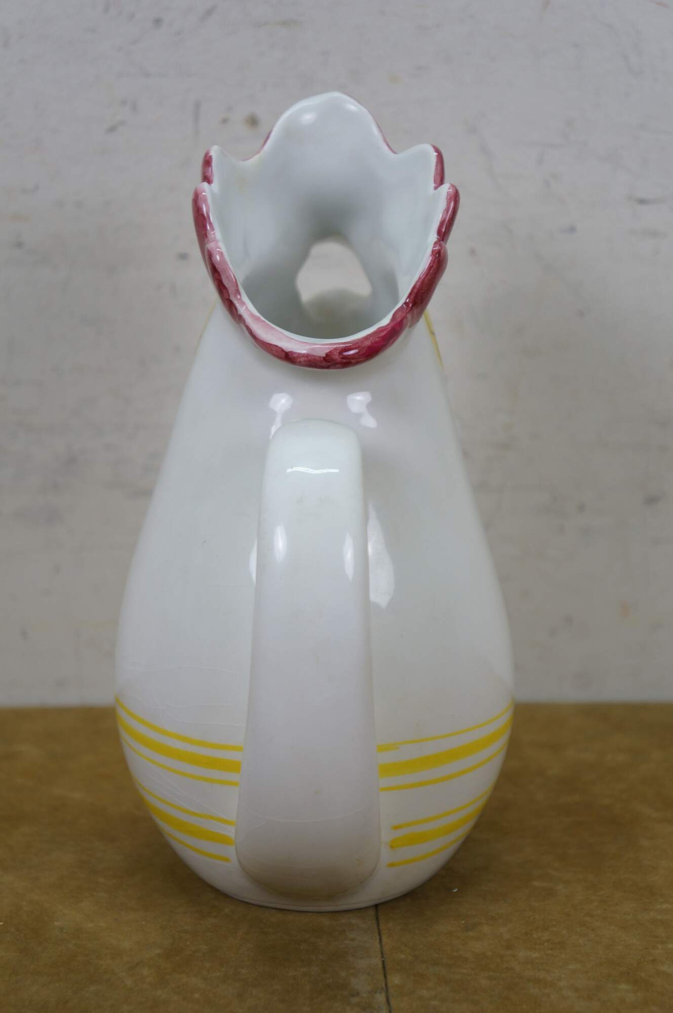 Vintage 20th century porcelain water pitcher in the shape of a yellow and red chicken / rooster with open beak spout and striped base. Made in Italy. 64/1.