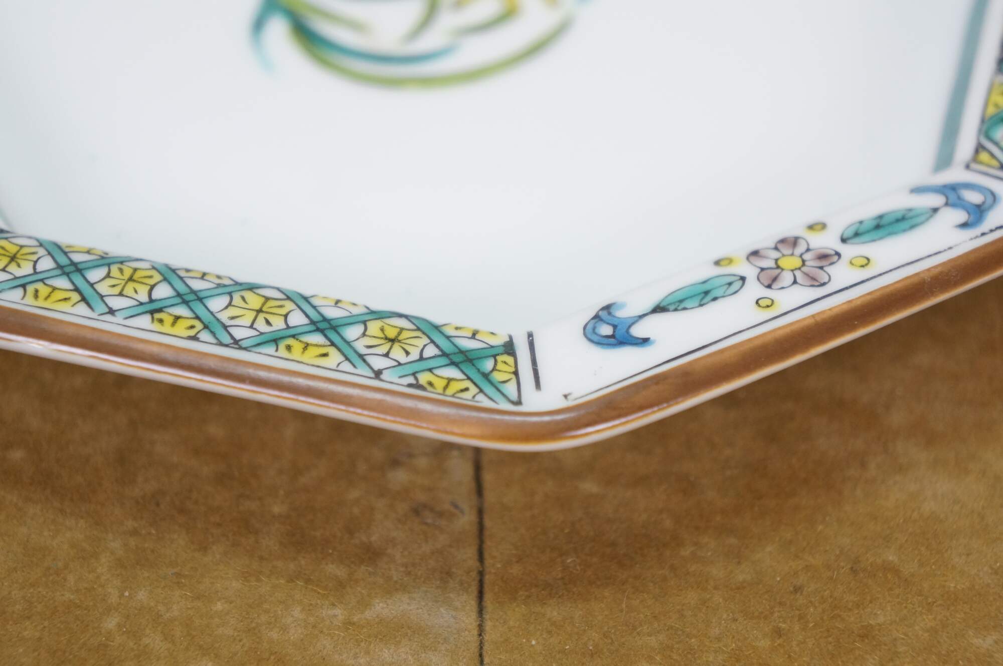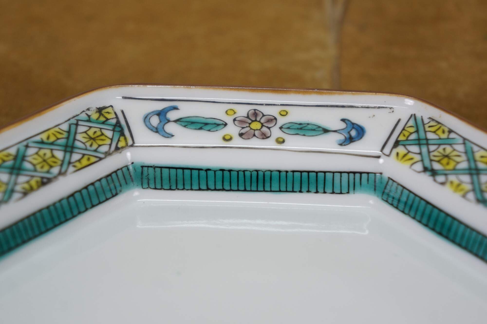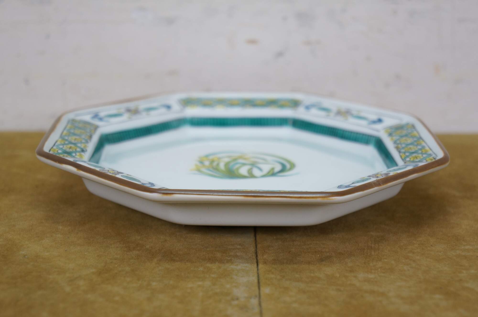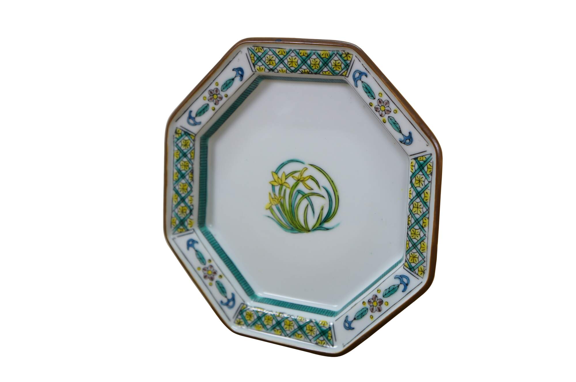 Vintage 20th century octagonal bread plate / dish hand painted in green and yellow with lattice patterns and flowers around the edge and a central motif of lilies. Signed on reverse.