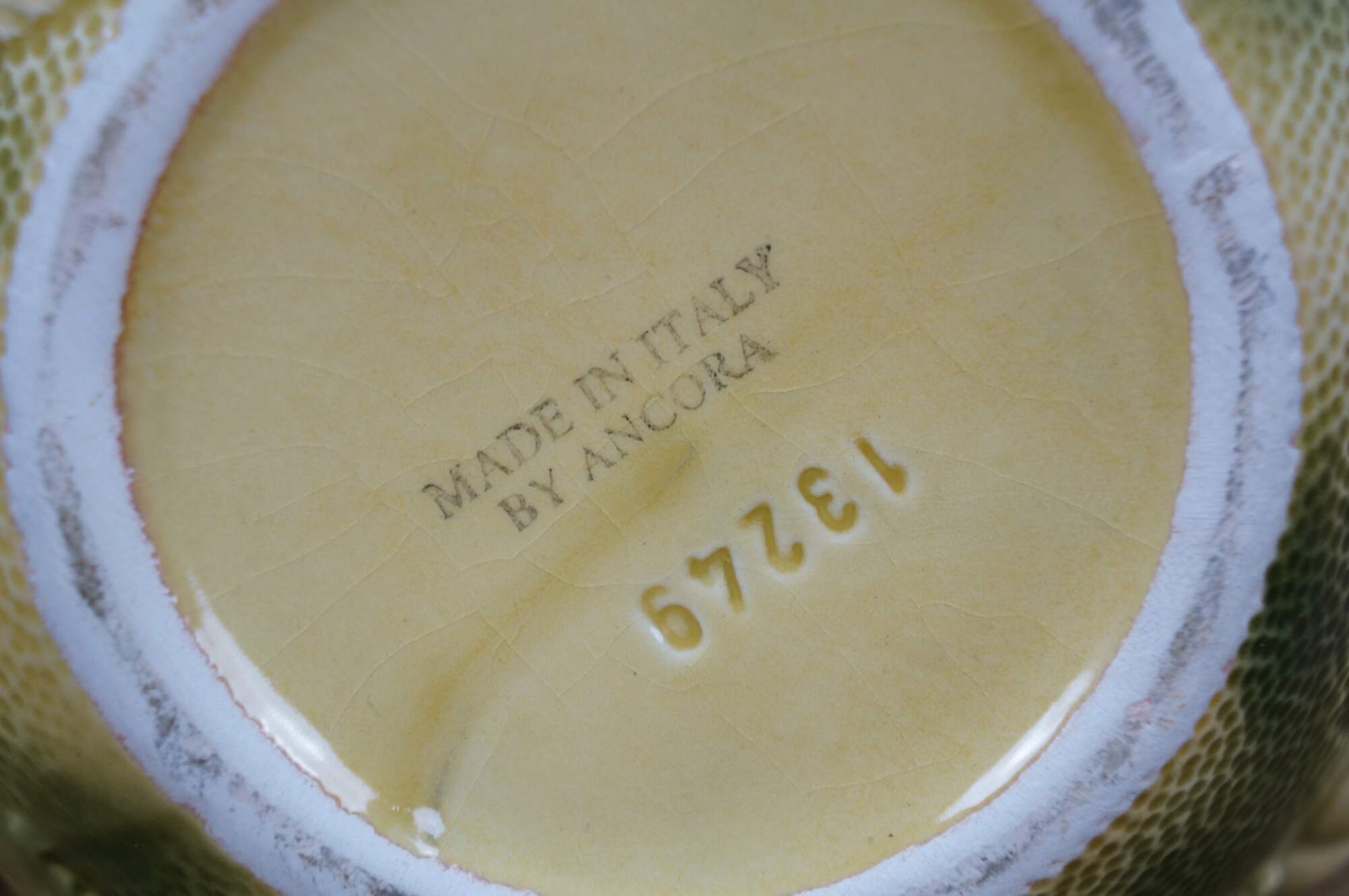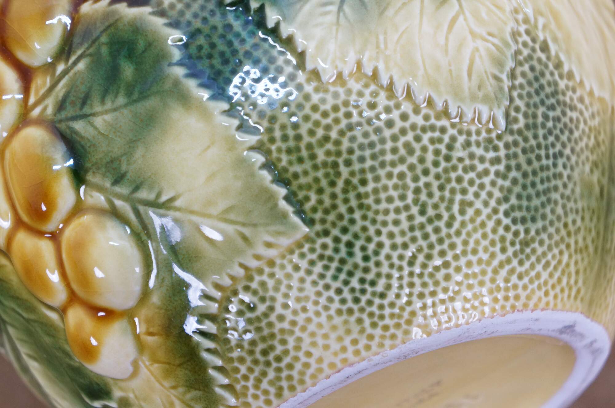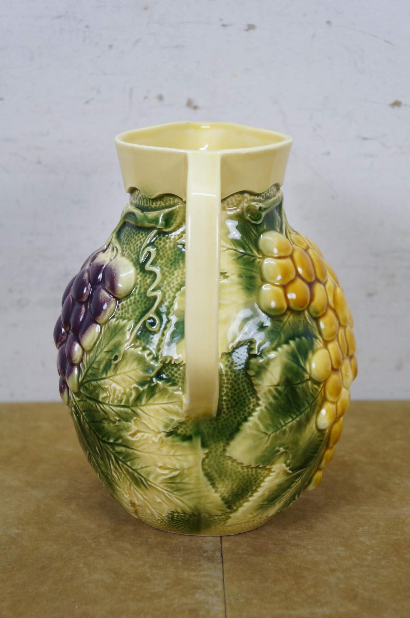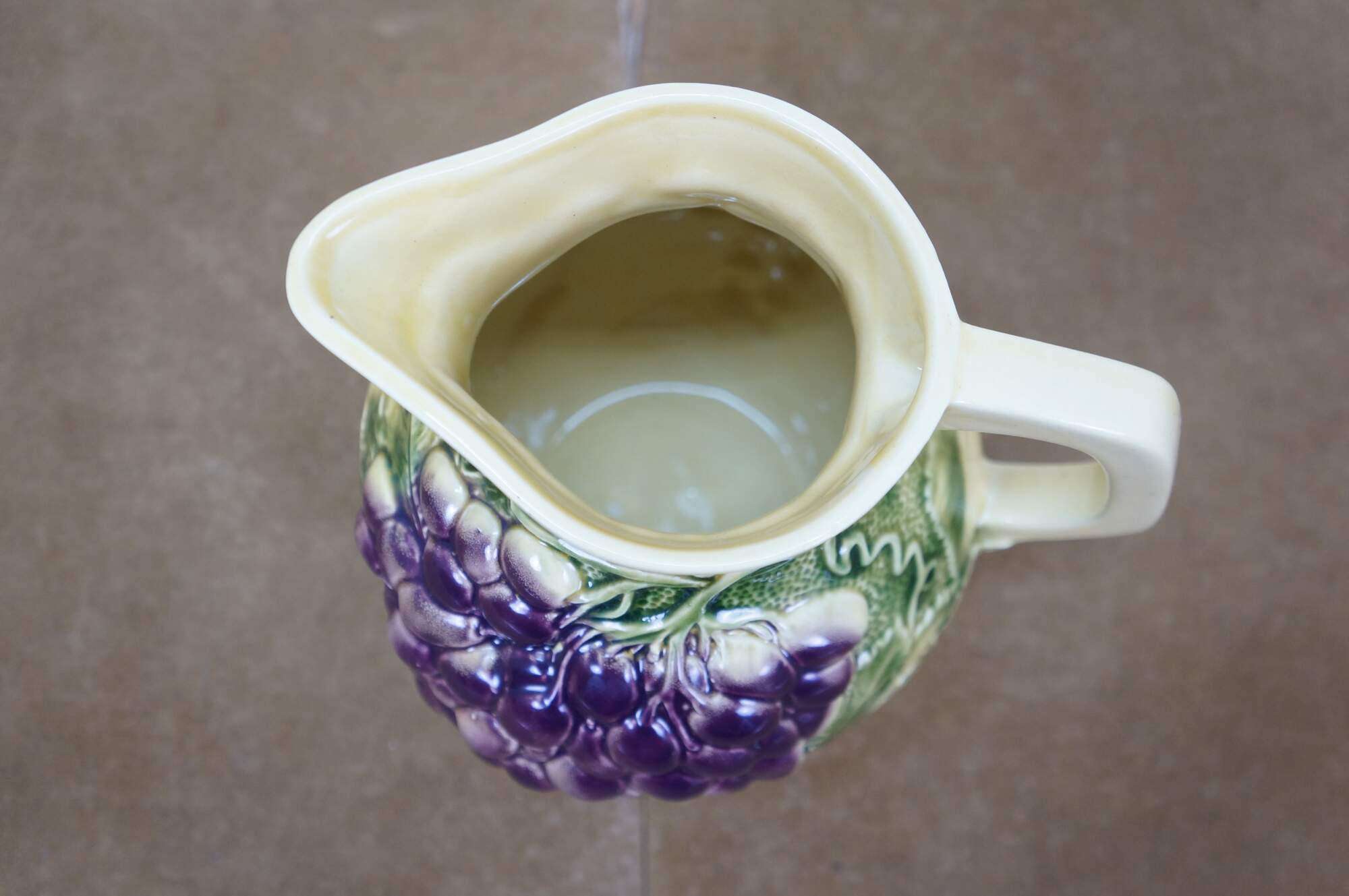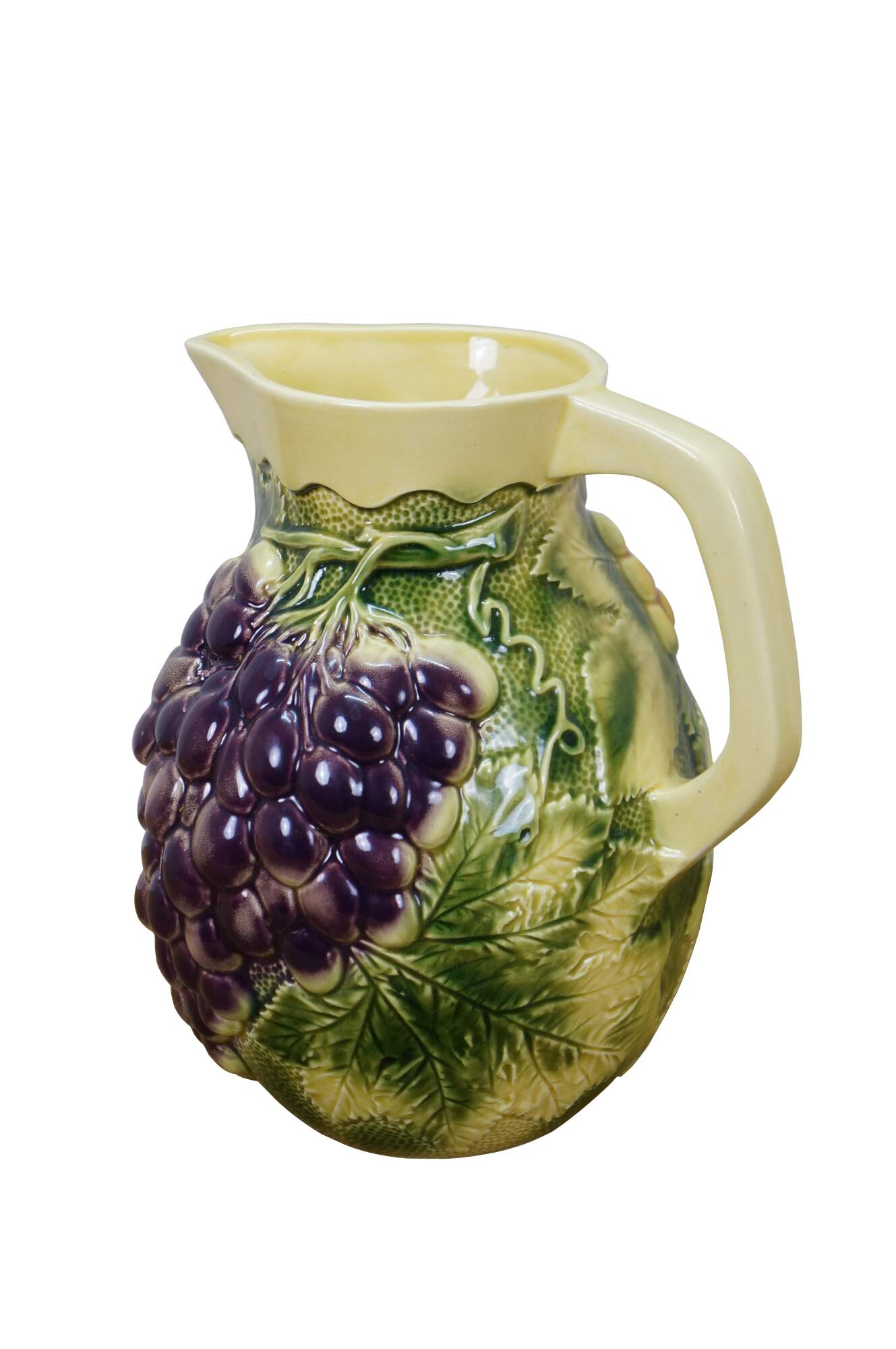 Late 20th century Italian majolica porcelain water pitcher - pale yellow in color molded with bunches of purple and gold grapes backed with green leaves. Number 13249. Made in Italy by Ancora.