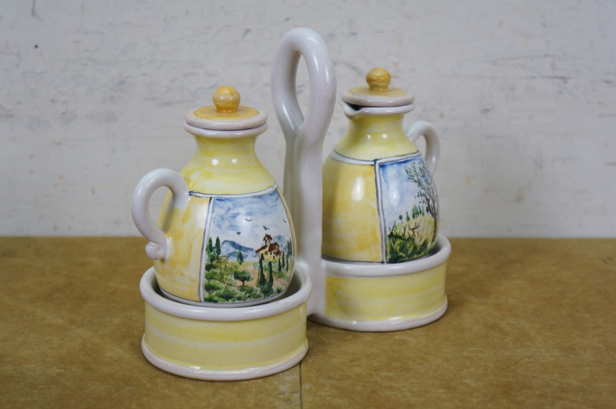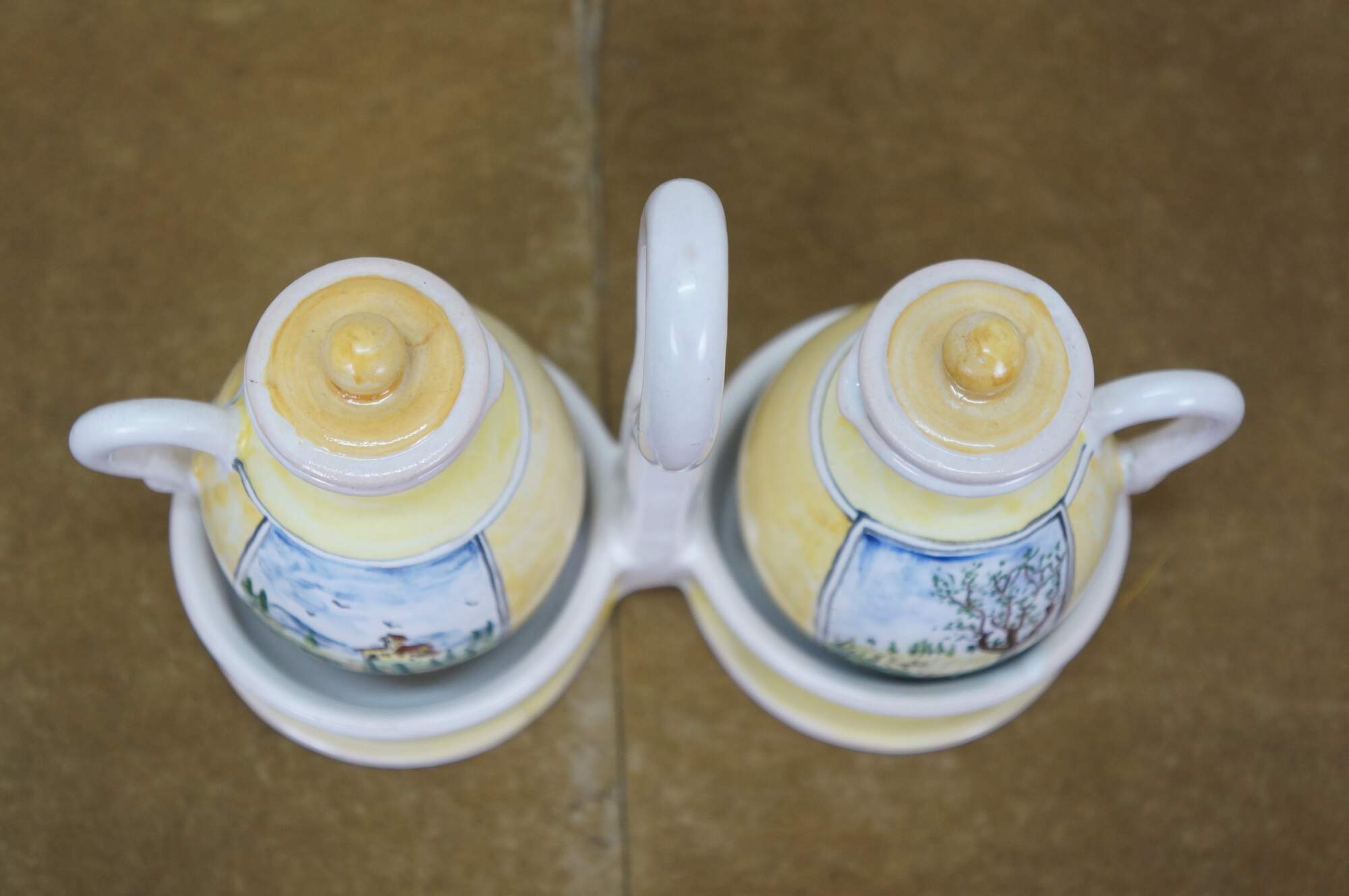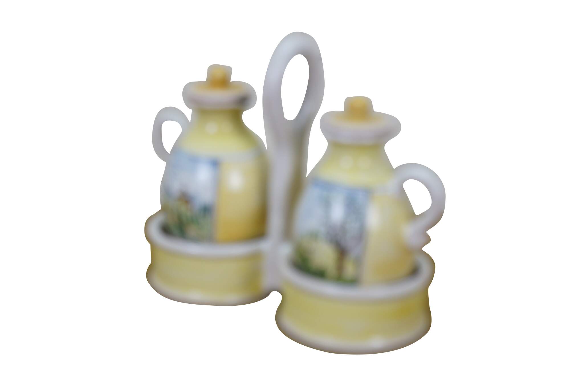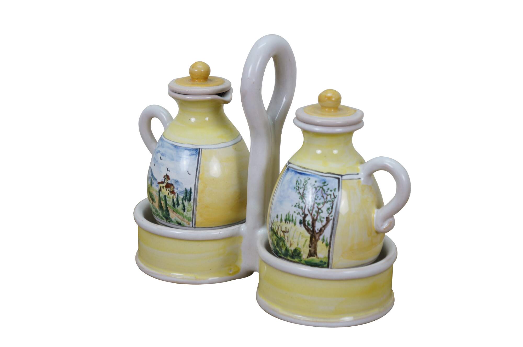 Late 20th century Italian porcelain set of oil and vinegar bottles and caddy stand, glazed in yellow and white with hand painted Tuscan landscapes. Signed F.G.