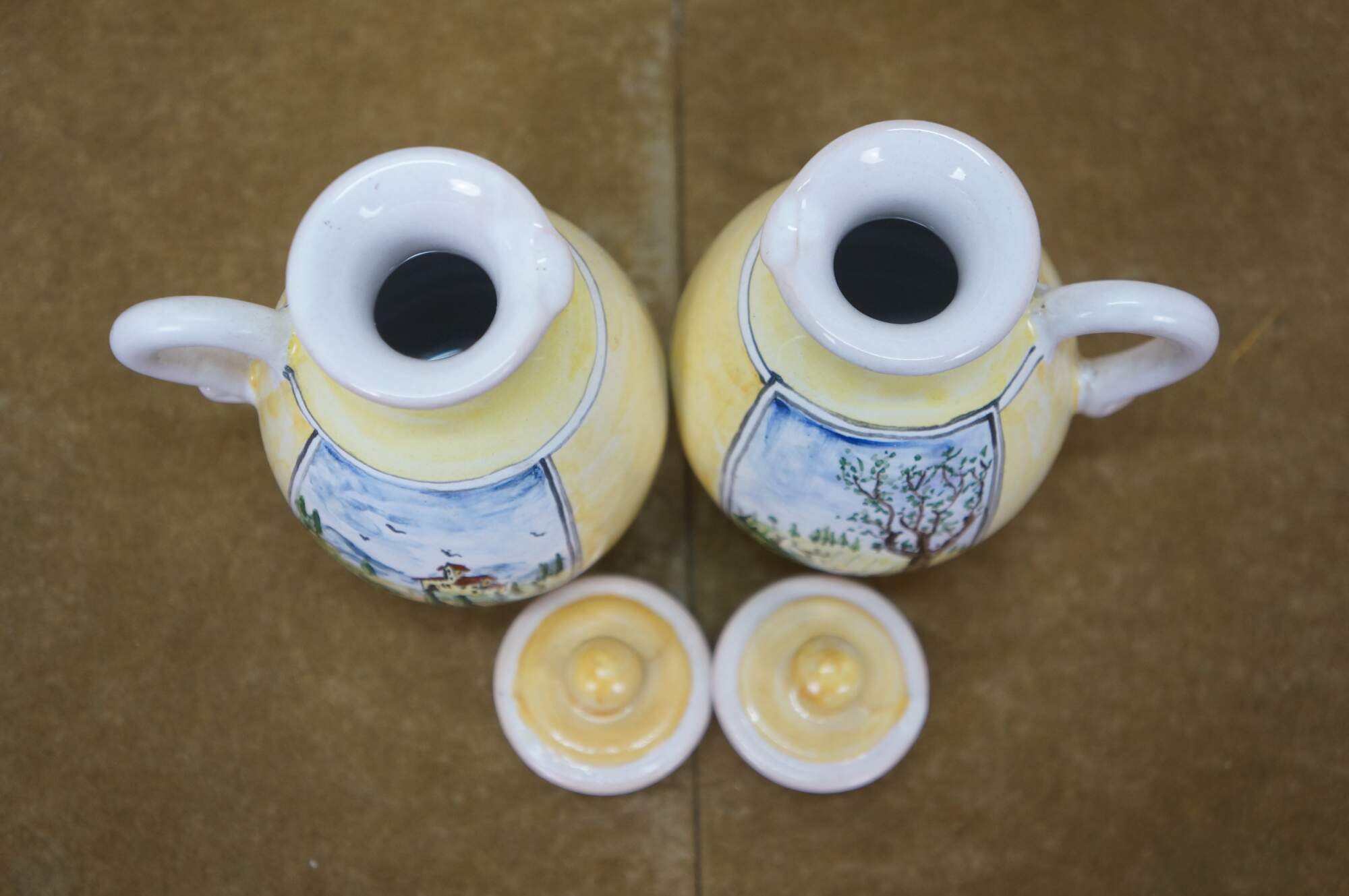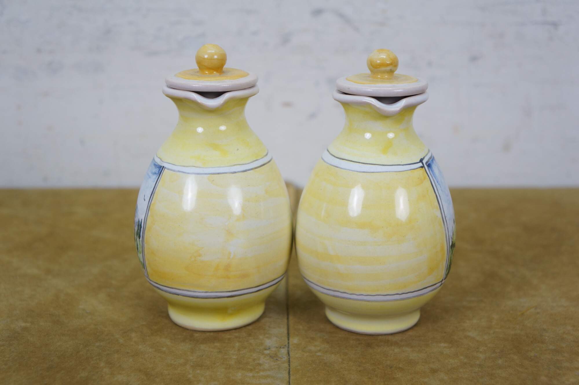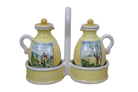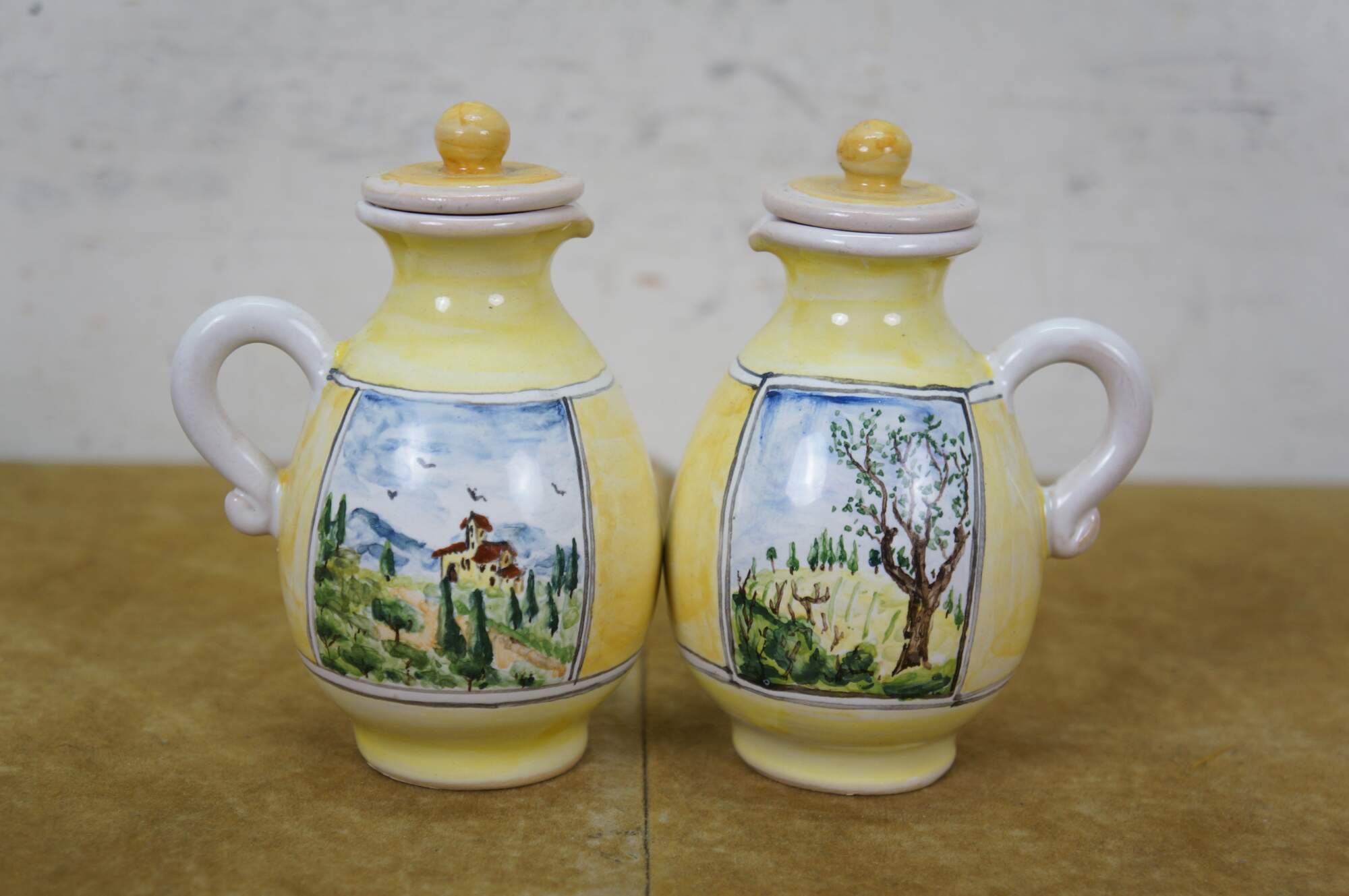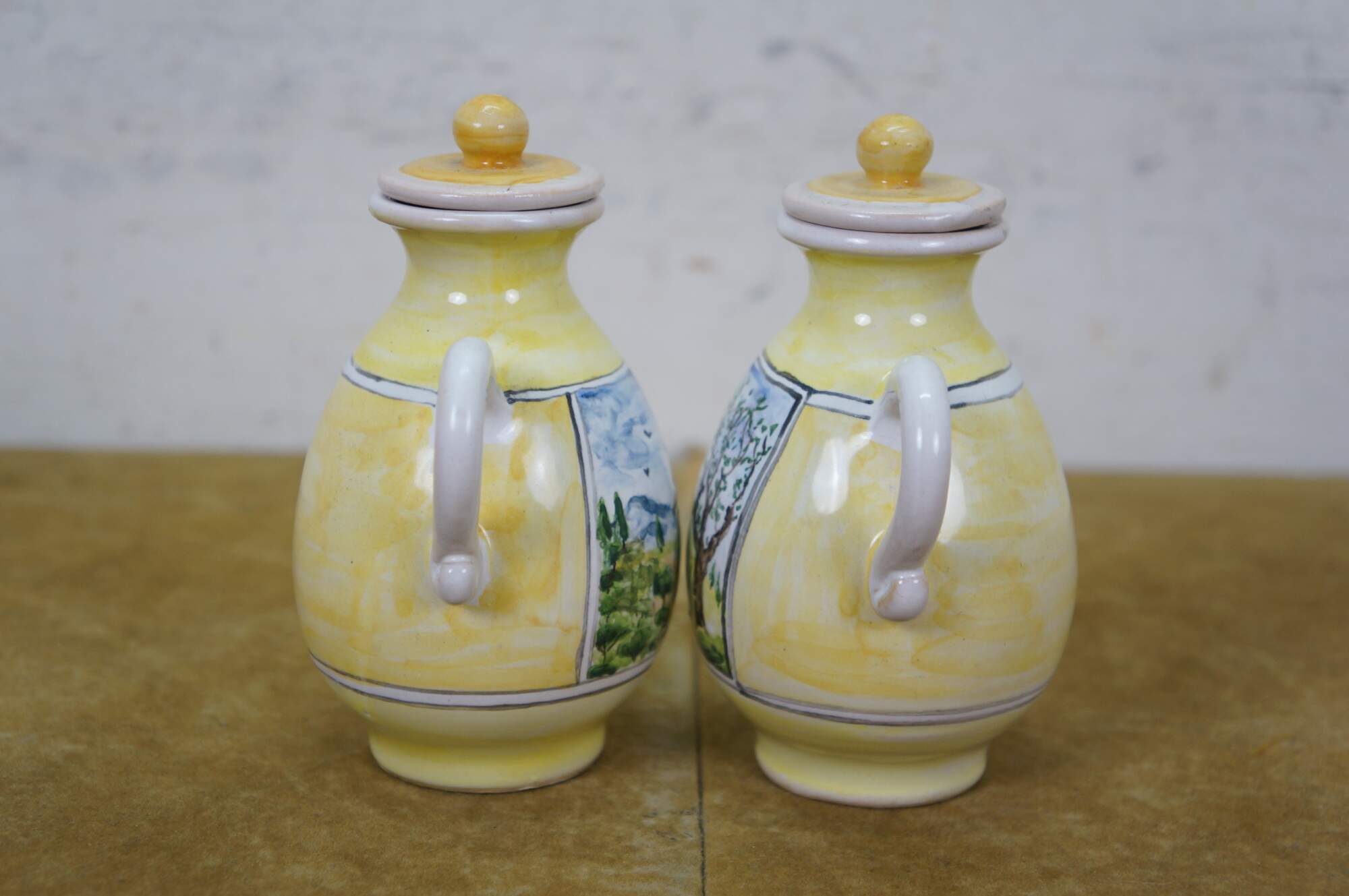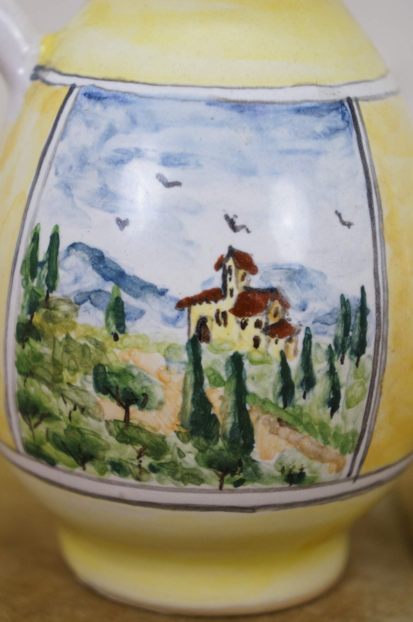 Late 20th century Italian porcelain set of oil and vinegar bottles and caddy stand, glazed in yellow and white with hand painted Tuscan landscapes. Signed F.G.