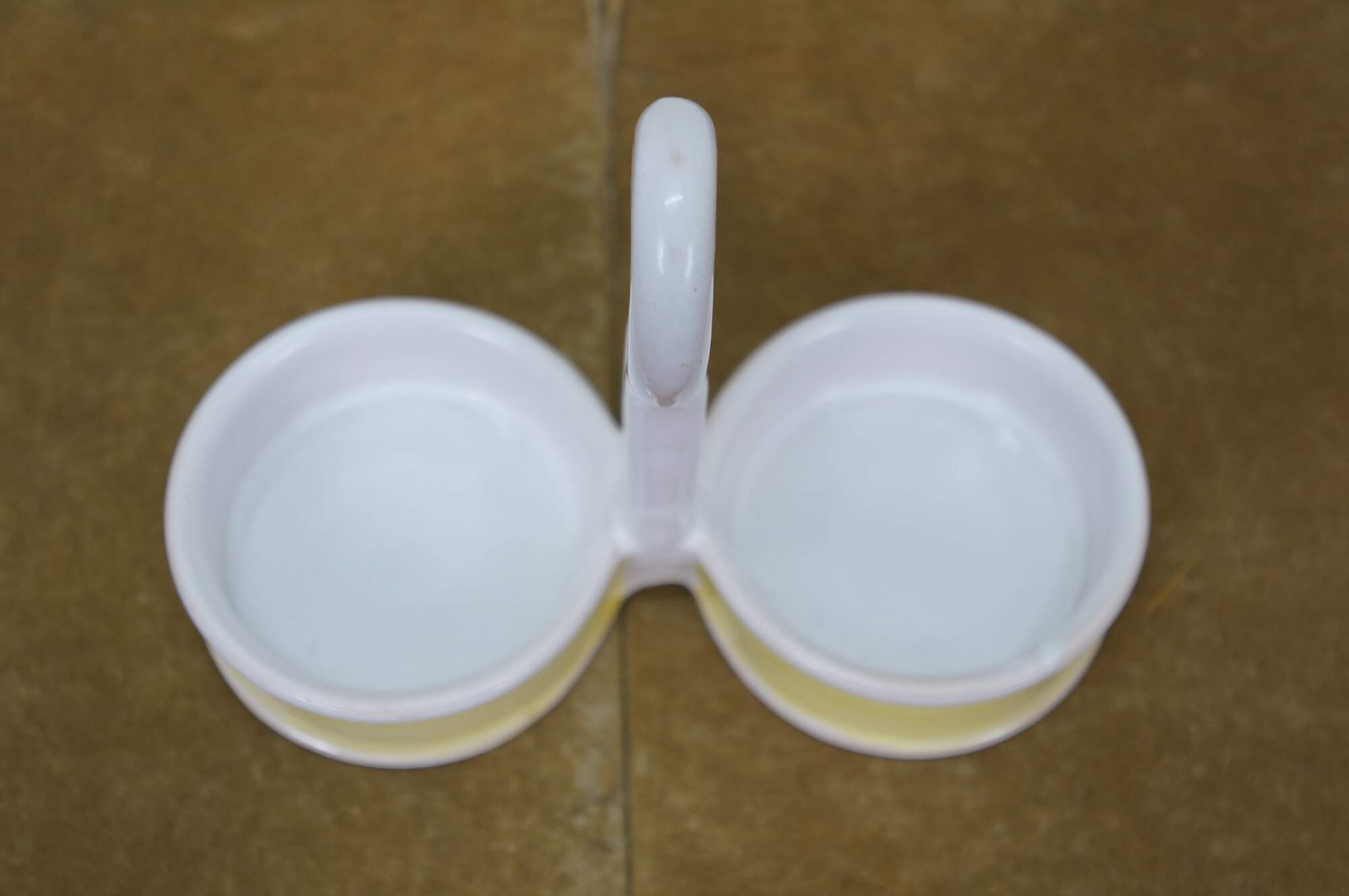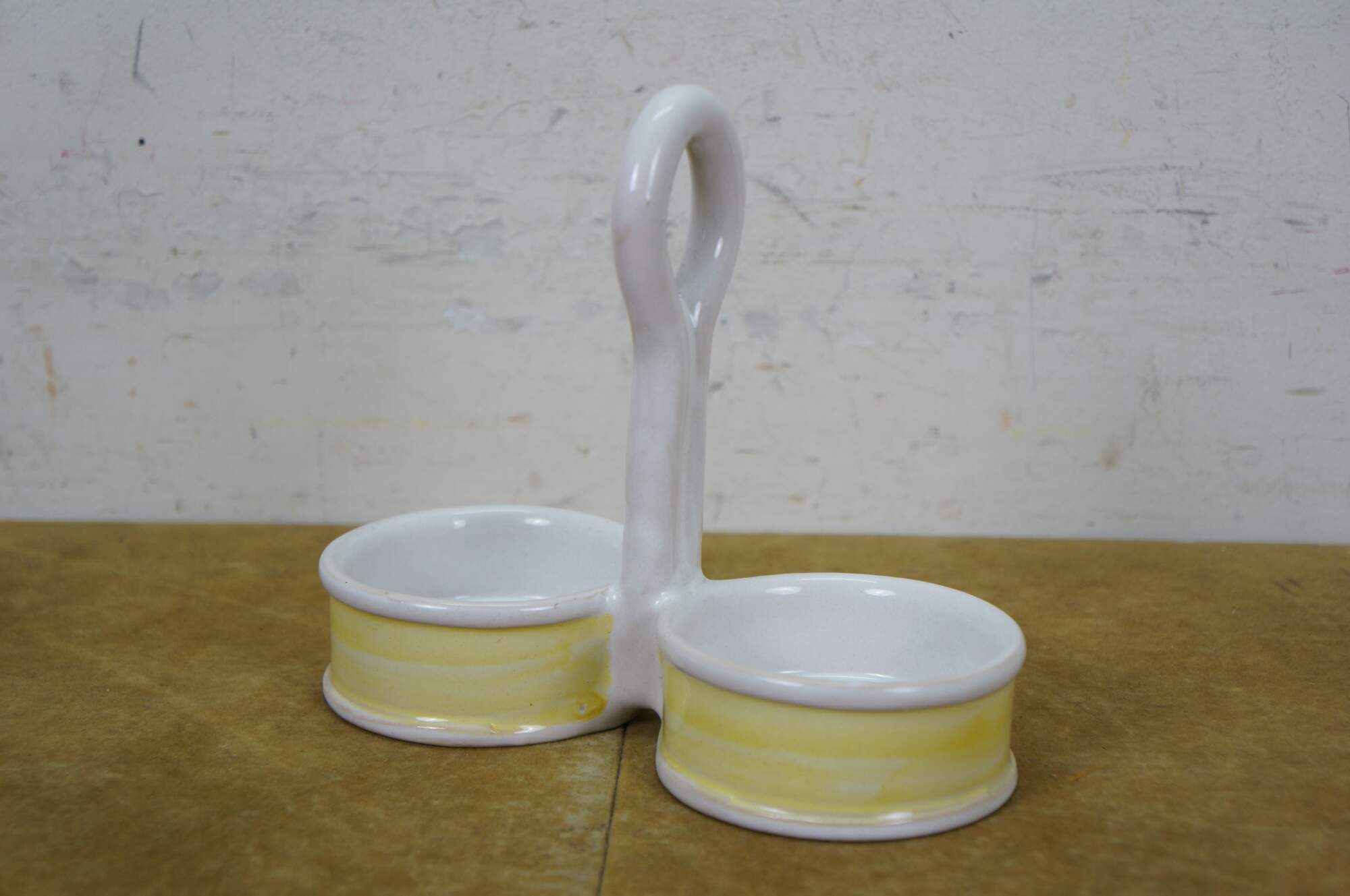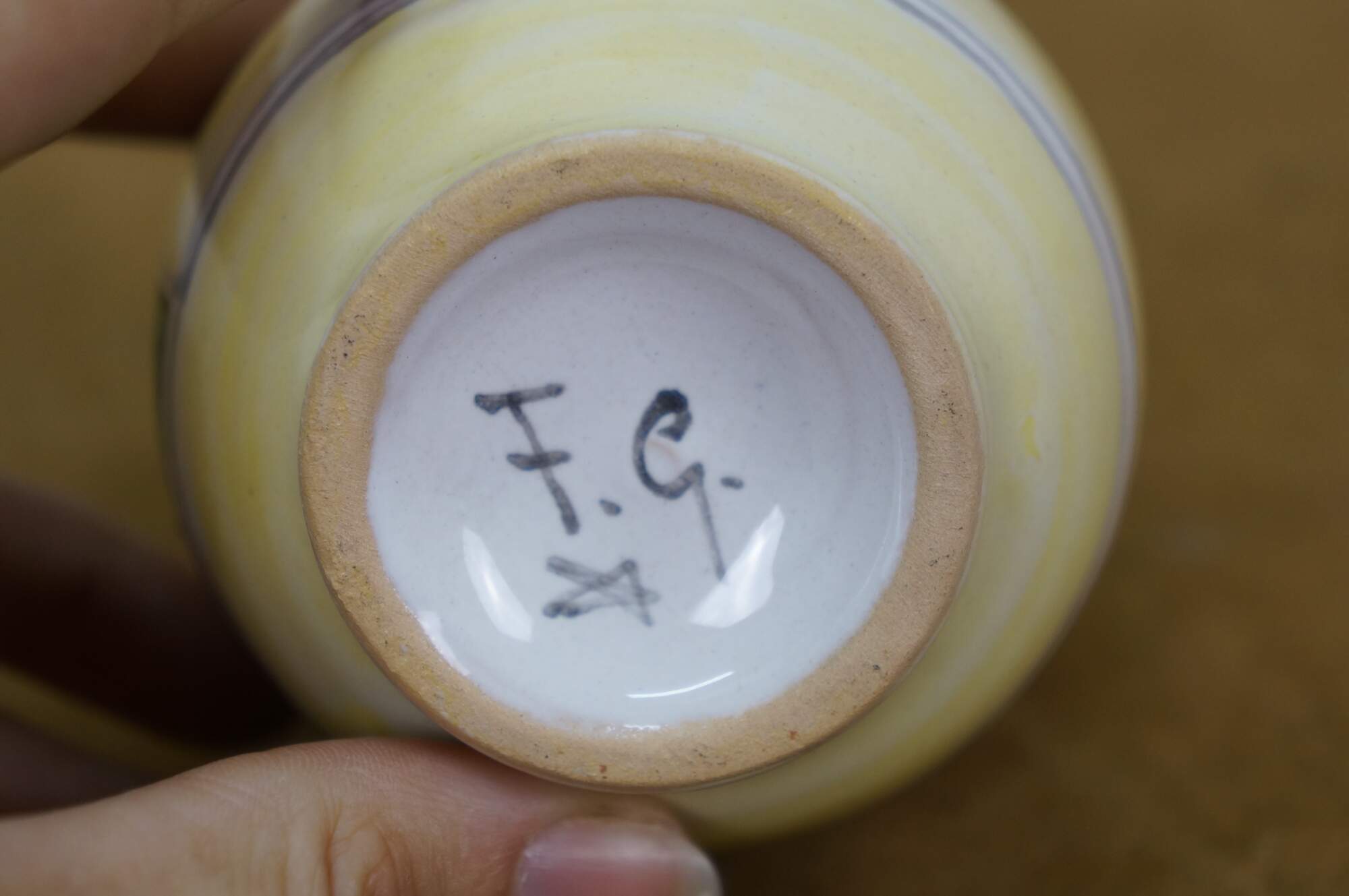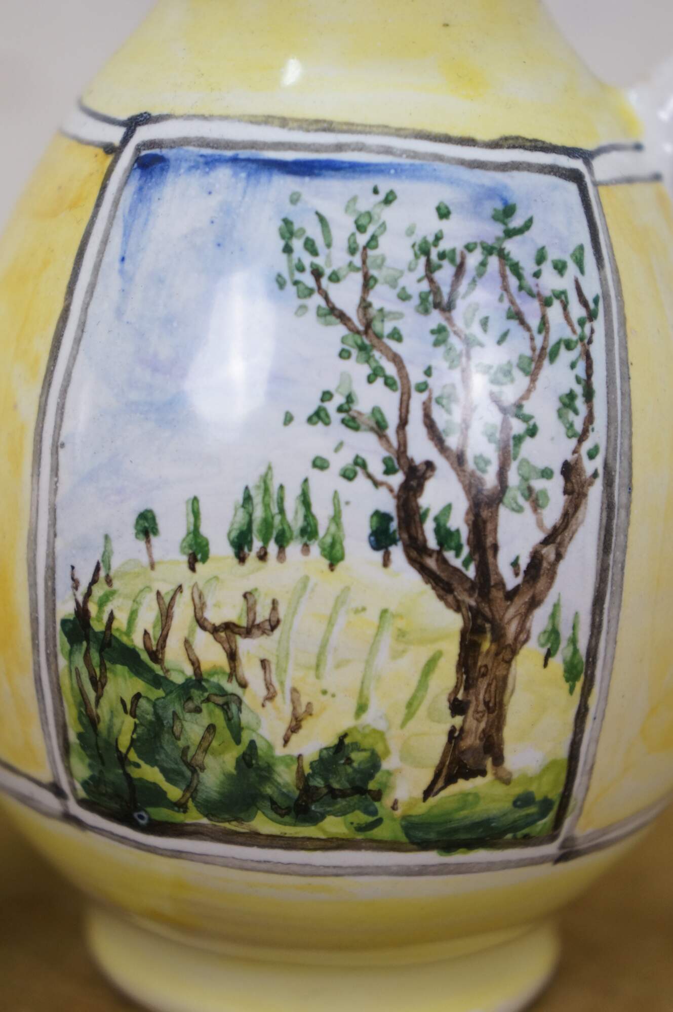 Late 20th century Italian porcelain set of oil and vinegar bottles and caddy stand, glazed in yellow and white with hand painted Tuscan landscapes. Signed F.G.