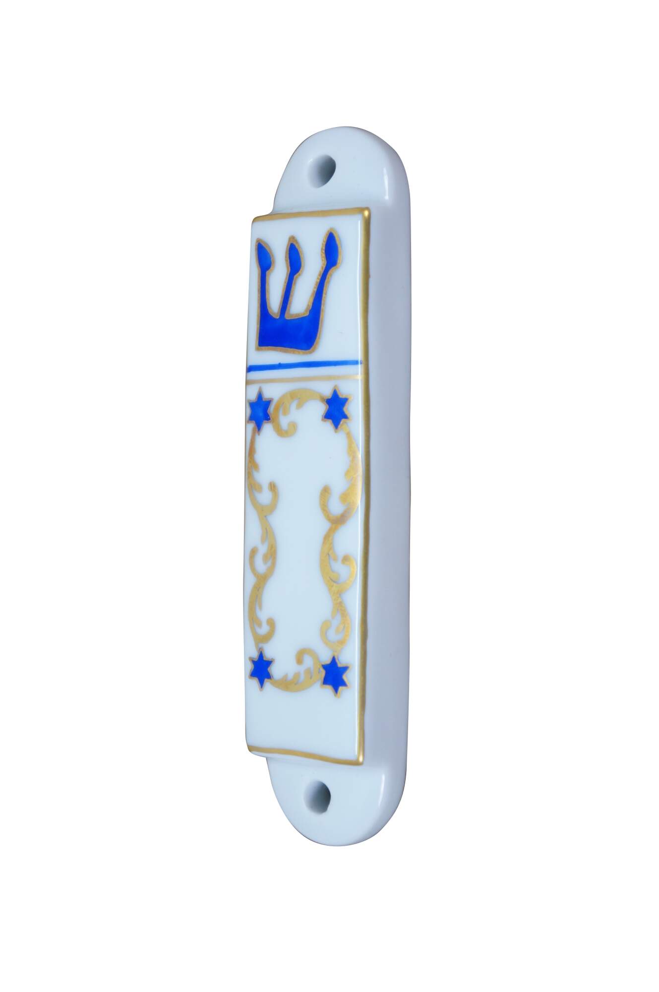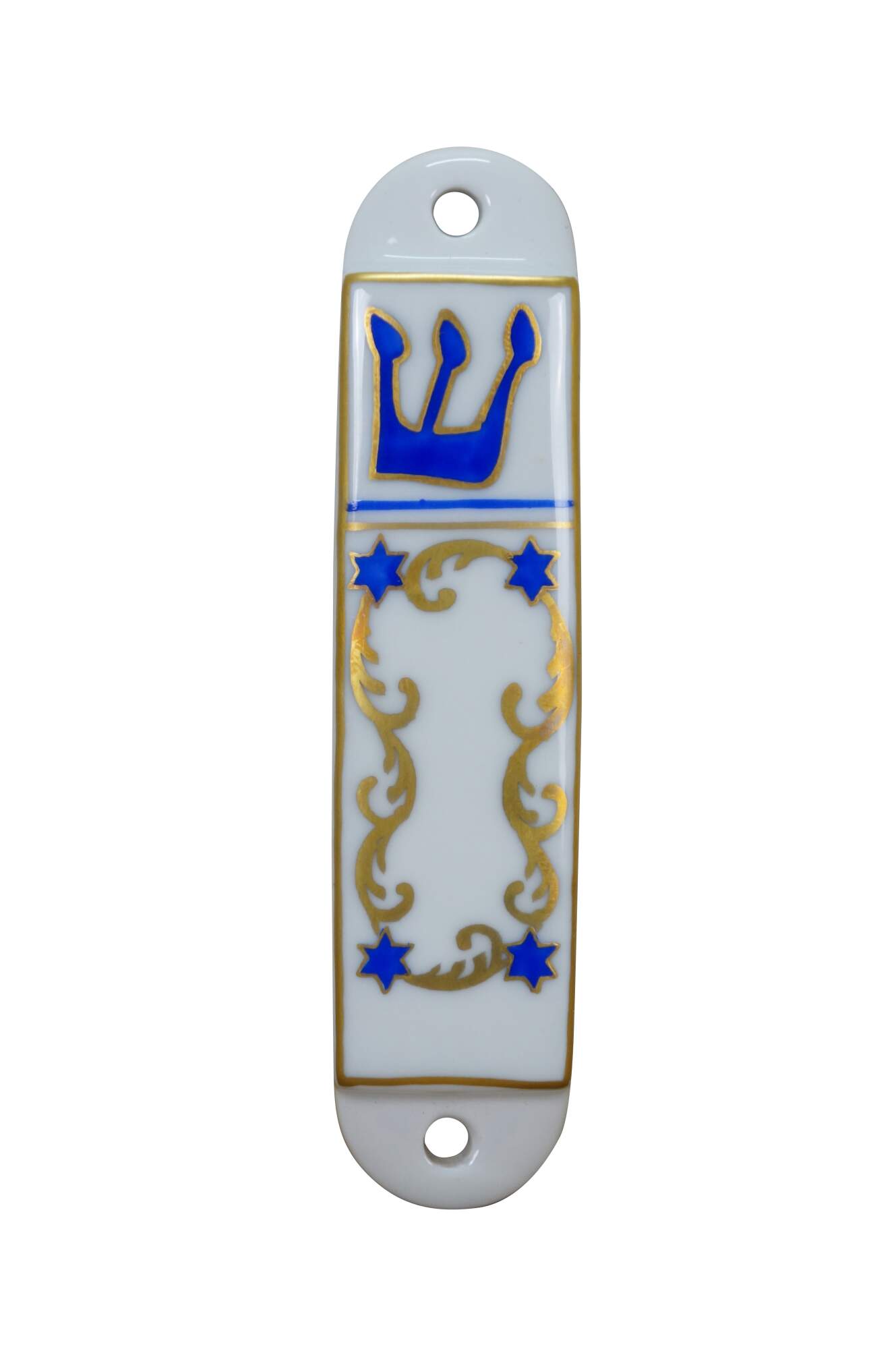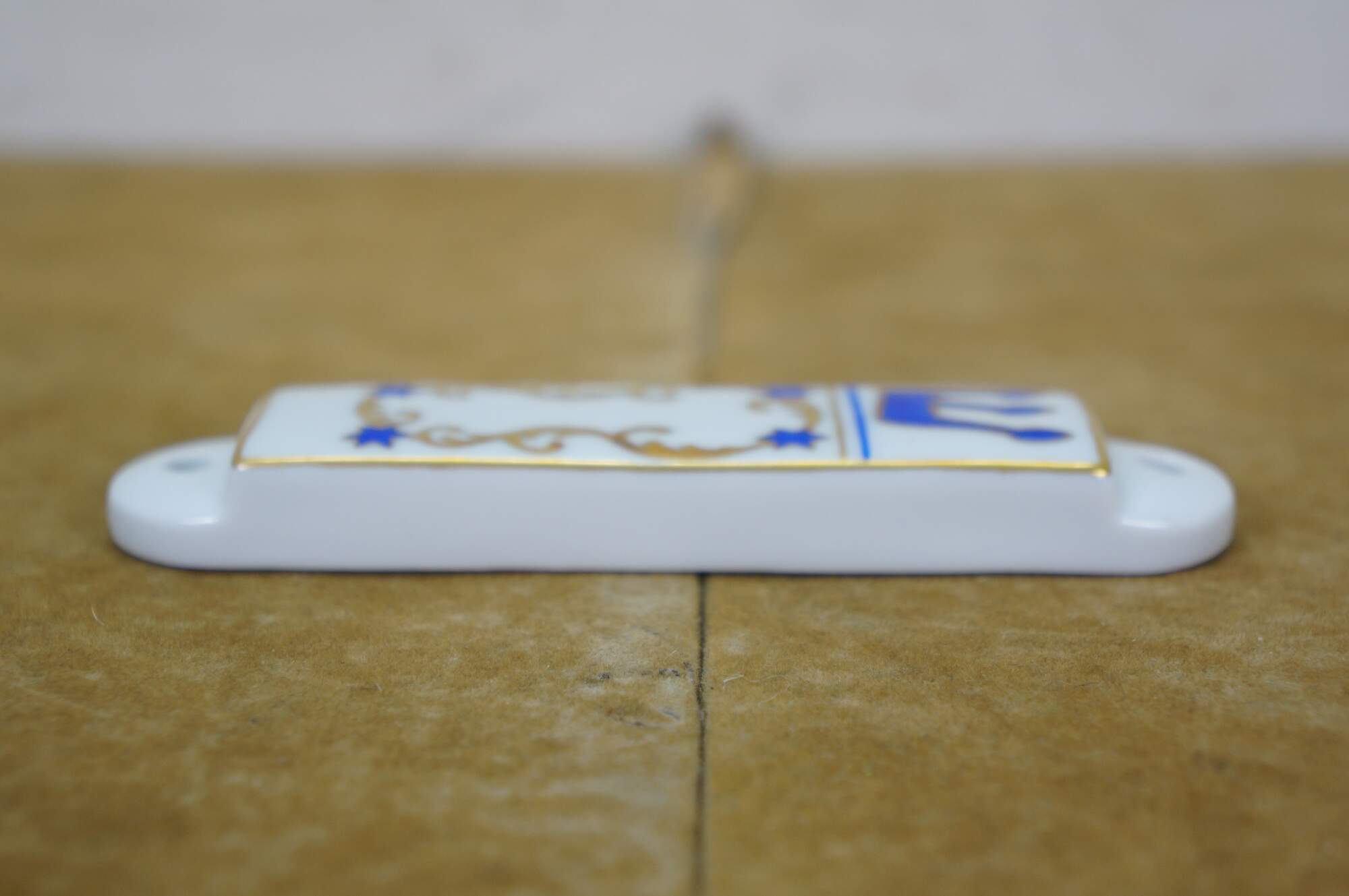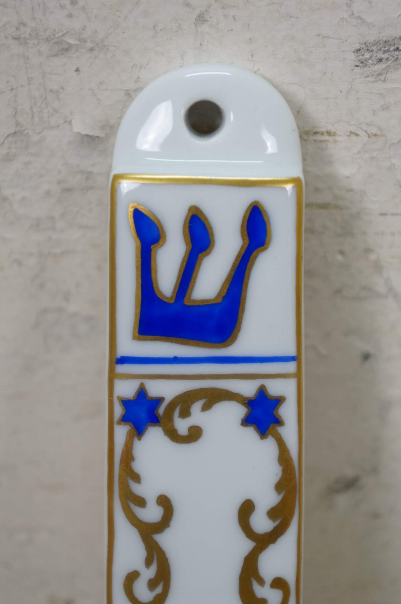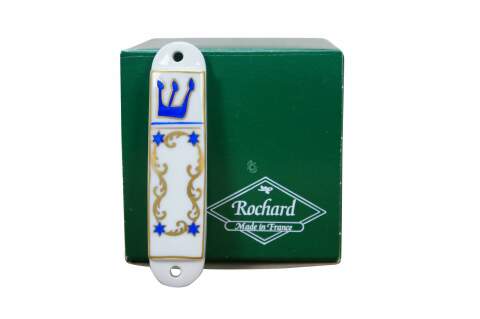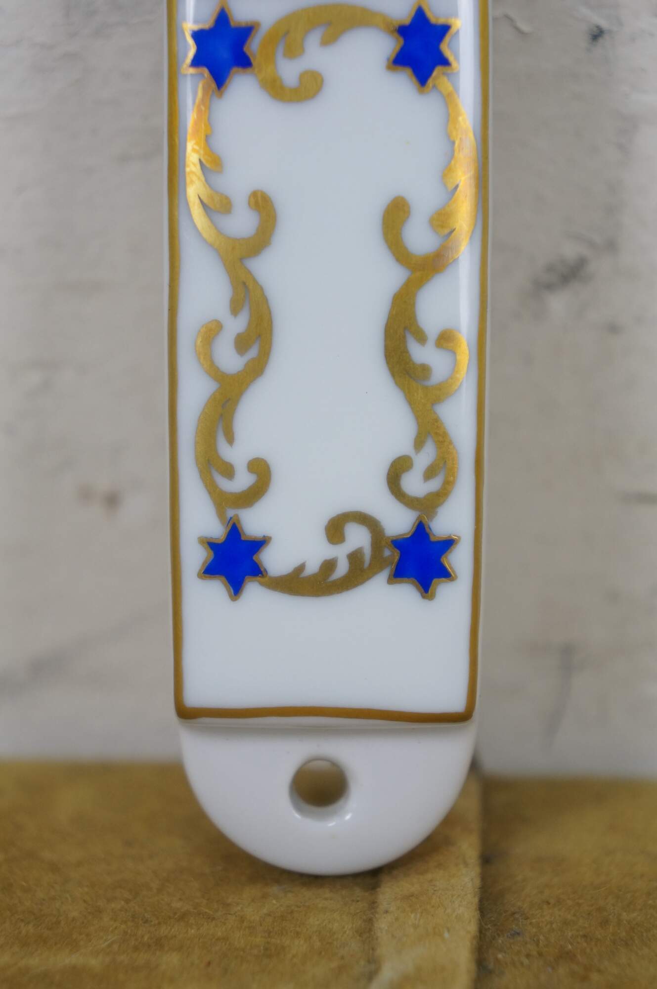 Vintage Rochard Limoges France white porcelain mezuzah case, hand painted in blue and gold. Includes prayer scroll.
