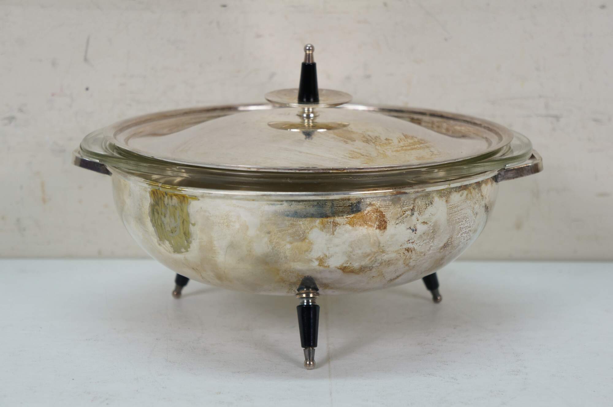 Mid 20th century silverplate chafing dish / buffet server by W&S Blackinton. Round form with mid century modern styling, black and silver peg feet and finial on the lid. Includes 024 2 Qt PYREX borosilicate glass insert, Made in USA, G-16.