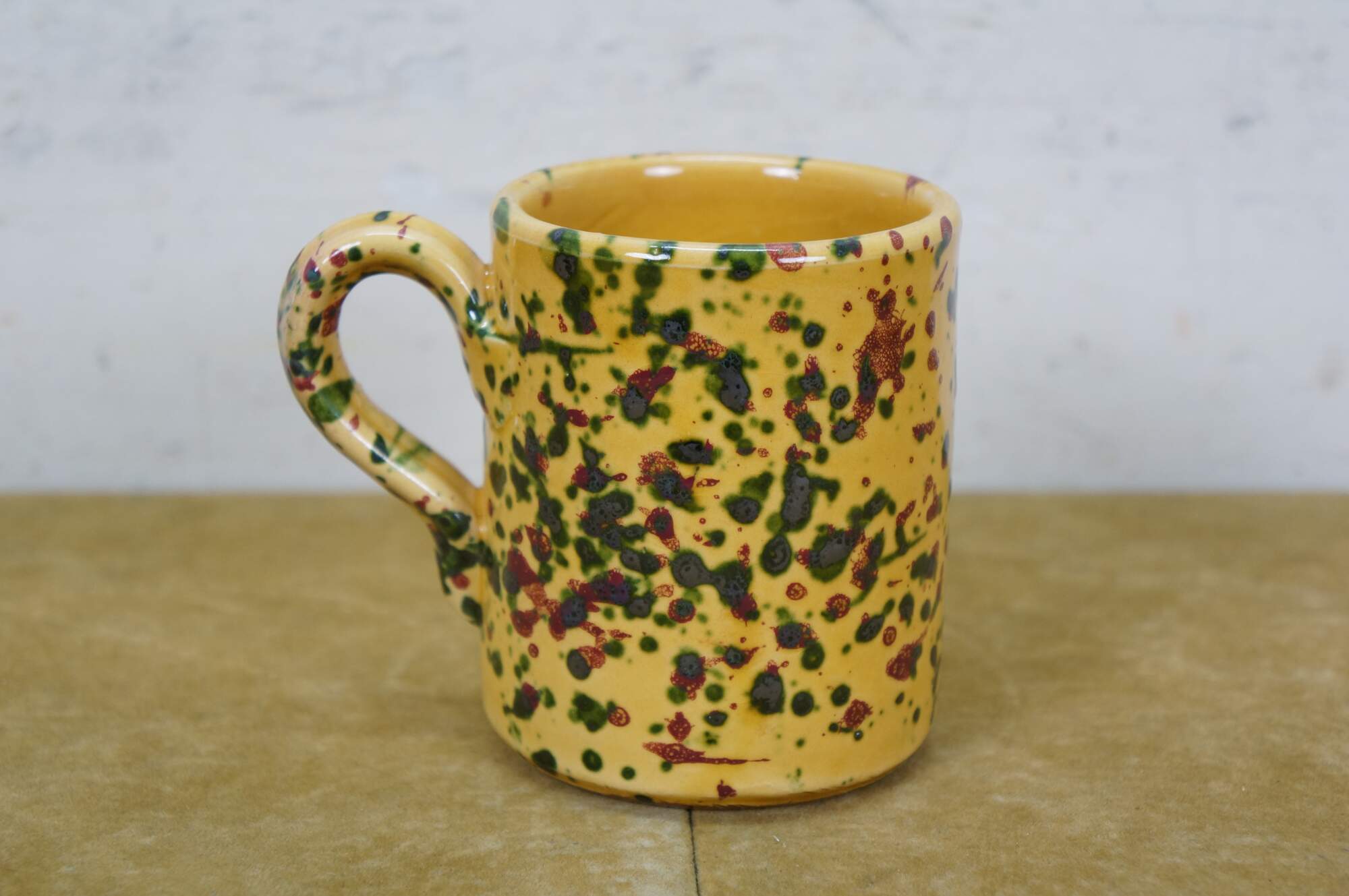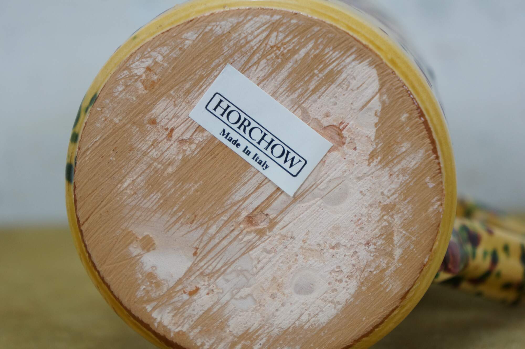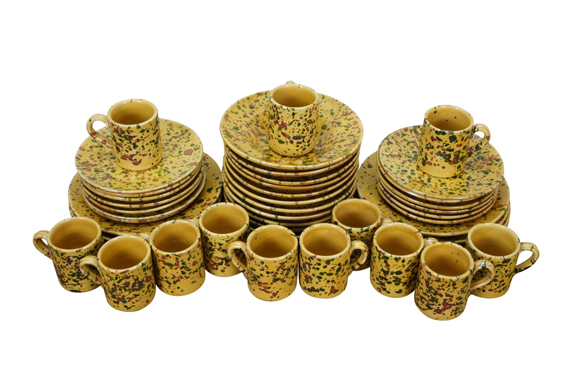 Vintage 45 piece set of Horchow Italian earthenware pottery dinnerware. Glazed in yellow and speckled with red and green spots. Set includes: 8 Dinner Plates, 13 Bread Plates, 11 Soup Bowls, 13 Mugs / Cups. Made in Italy.
