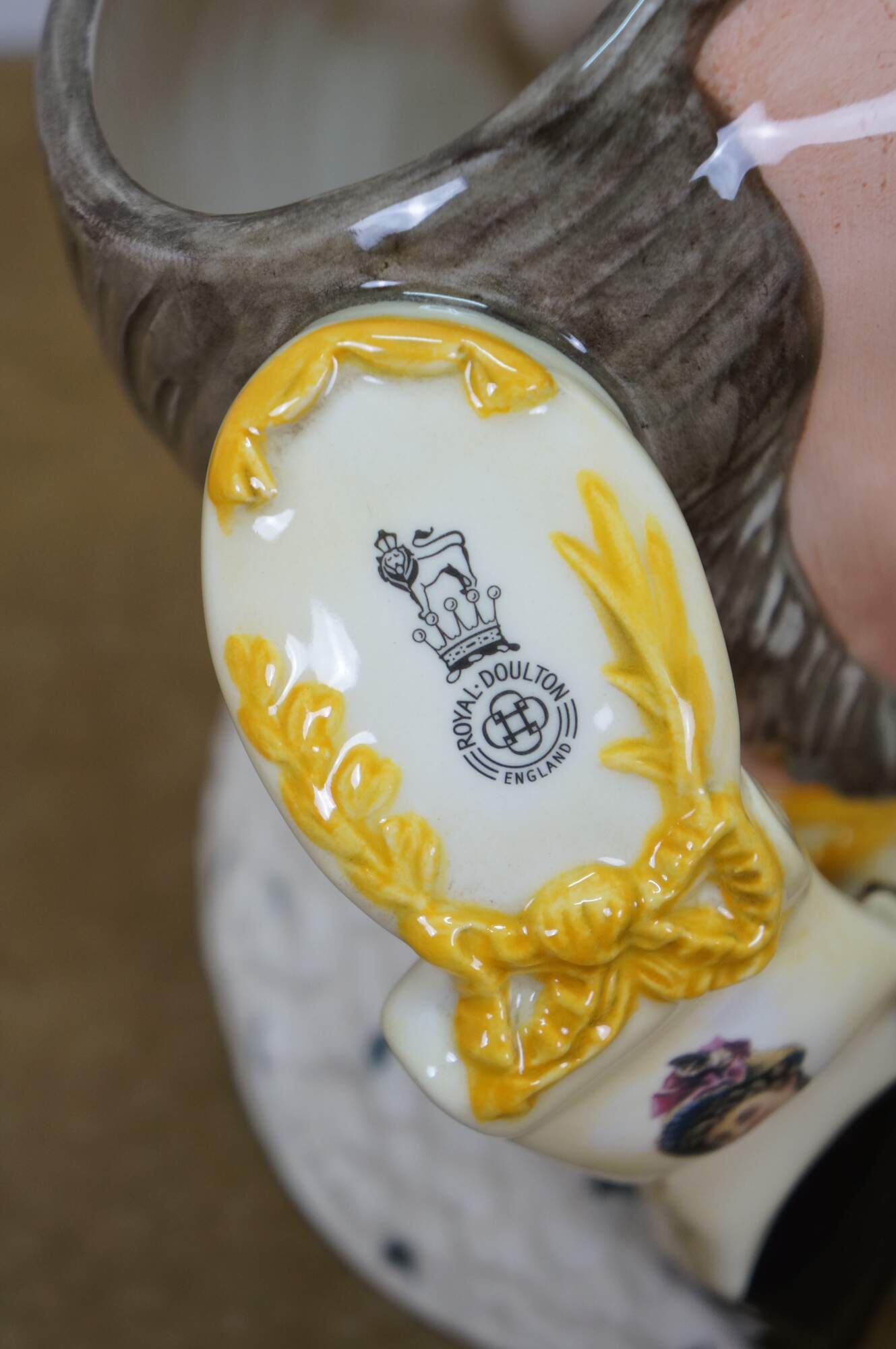 "Starting on the bank of the River Thames in 1815, Martha Jones, John Watts and John Doulton joined forces to become Doulton & Watts Pottery. The factory specialized in manufacturing salt-glaze and stoneware ceramics, jars, bottles, and flasks. In 1835 Henry Doulton joined the firm and business boomed in 1846 due to his role in the 'sanitary revolution' - pioneering the general use of stoneware drain pipes and water filters to improve living conditions. In 1854 John Watts retired from the business and it became known as Doulton & Company. In 1860, the business started working with pupils from the neighboring Lambeth School of Art. In 1882 they opened a factory on Nile Street in Burslem, Stoke-onTrent, a region known as 'The Potteries'. By 1885, Doulton was producing world-class wares for an international clientele. Doulton won honors at major international exhibitions and was producing a tremendous variety of figurines, character jugs, vases and other decorative pieces in vibrant colors and using both under- and on-glaze enameling techniques. Doulton products also came to the attention of the British Royal family. Queen Victoria was so impressed with his wares that she knighted Henry Doulton in 1887 for his innovative contributions to ceramic art. When Sir Henry died in 1897, Henry's son Henry Lewis Doulton took over control of the company. In 1901, Edward VII granted Doulton a Royal Warrant to add the 'Royal' to the start of the company name. The company continued to add products during the first half of the 20th century while retaining its reputation as a prime manufacturer of fashionable and high-quality bone china, despite pauses in production during each World War. In 1955, new city regulations prohibited salt glaze production, forcing the Lambeth factory to close and transfer all production to Stoke-on-Trent. In 2015 Royal Doulton became part of the Fiskars family of brands." (Source: Royal Doulton / Dalton Databank)