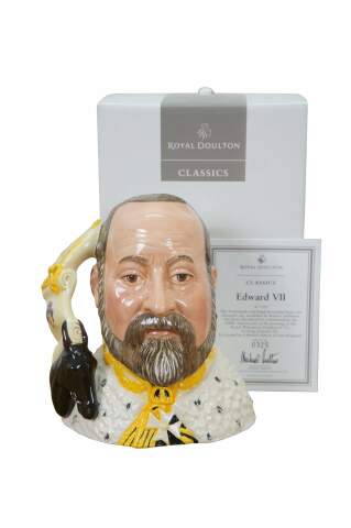 Vintage 2000 Royal Doulton Classics porcelain character jug number D7154, "Edward VII." Modelled by Robert Tabbenor. Limited Edition number 325/1000. Made in England. To Commemorate the 100th Anniversary of the Granting of the Royal Warrant to Doulton & Co. by King Edward VII. Includes original box and Certificate of Authenticity.