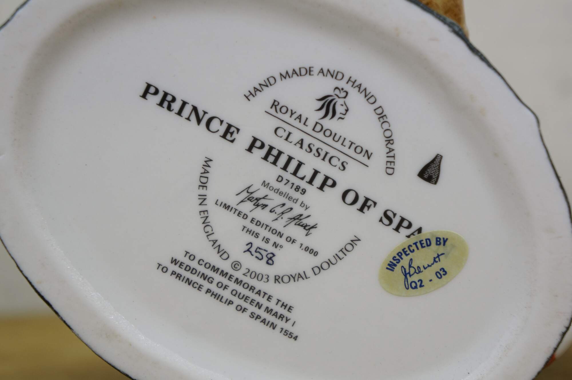 2003 Royal Doulton Classics porcelain character jug number D7189, "Prince Philip of Spain." Modelled by Martyn C.R. Alcock. Limited Edition number 258/1000. Made in England. To Commemorate the Wedding of Queen Mary I to Prince Philip of Spain 1554. Includes original box and Certificate of Authenticity.
