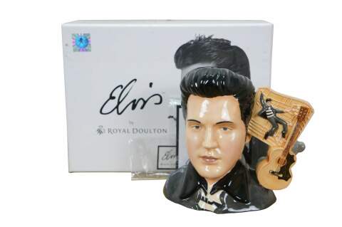 2006 Royal Doulton porcelain character jug number EP4, "Jailhouse Rock" depicting Elvis Presley. World Wide Limited Edition number 639/2000. Made in Thailand. Includes original box and Certificate of Authenticity.