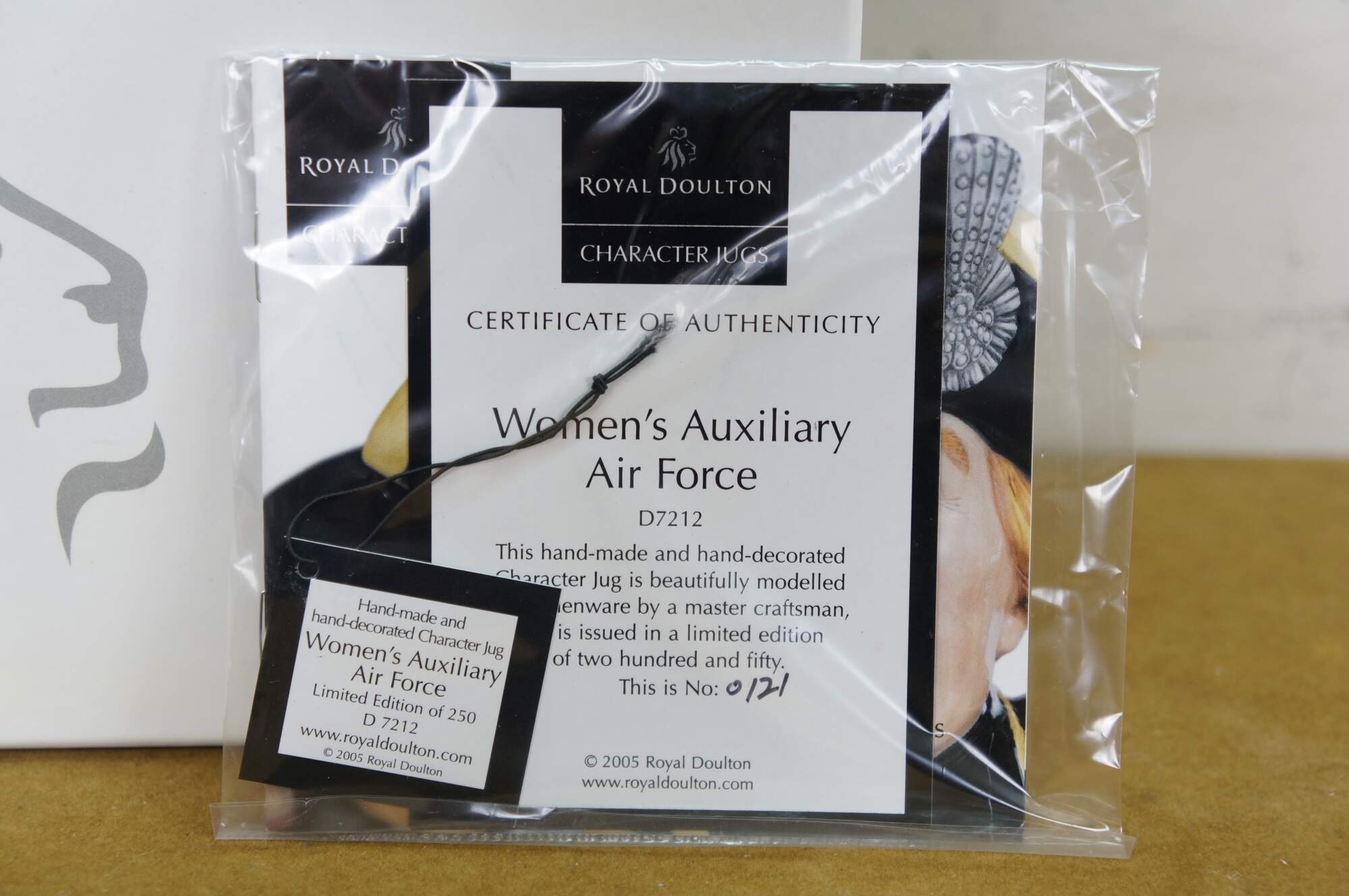 2005 Royal Doulton porcelain character jug number D7212, "Women's Auxiliary Air Force." Limited Edition number 121/250. Made in China. Includes original box and Certificate of Authenticity.