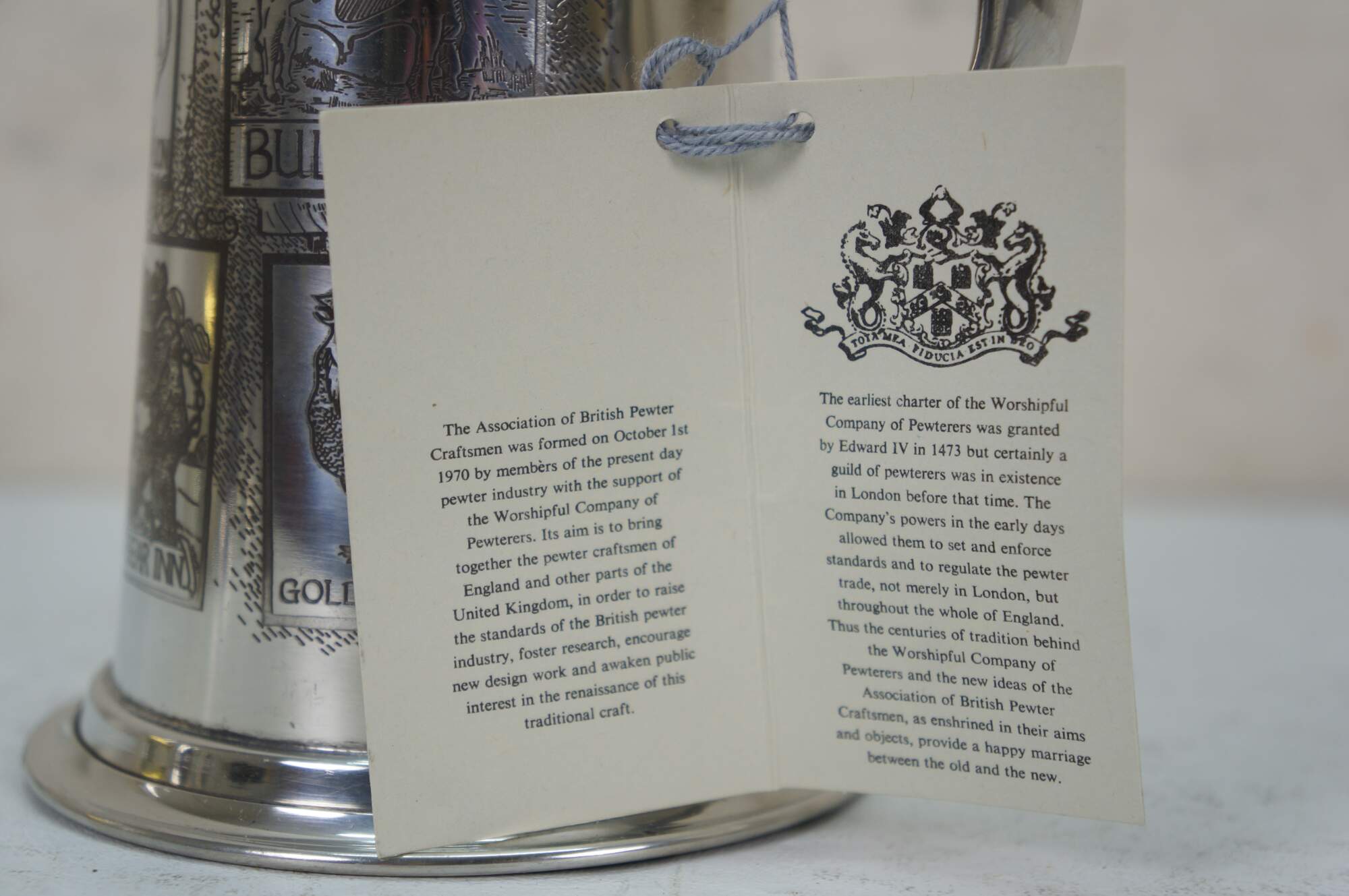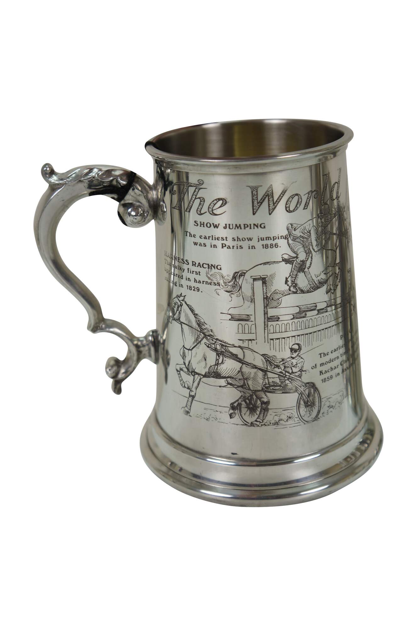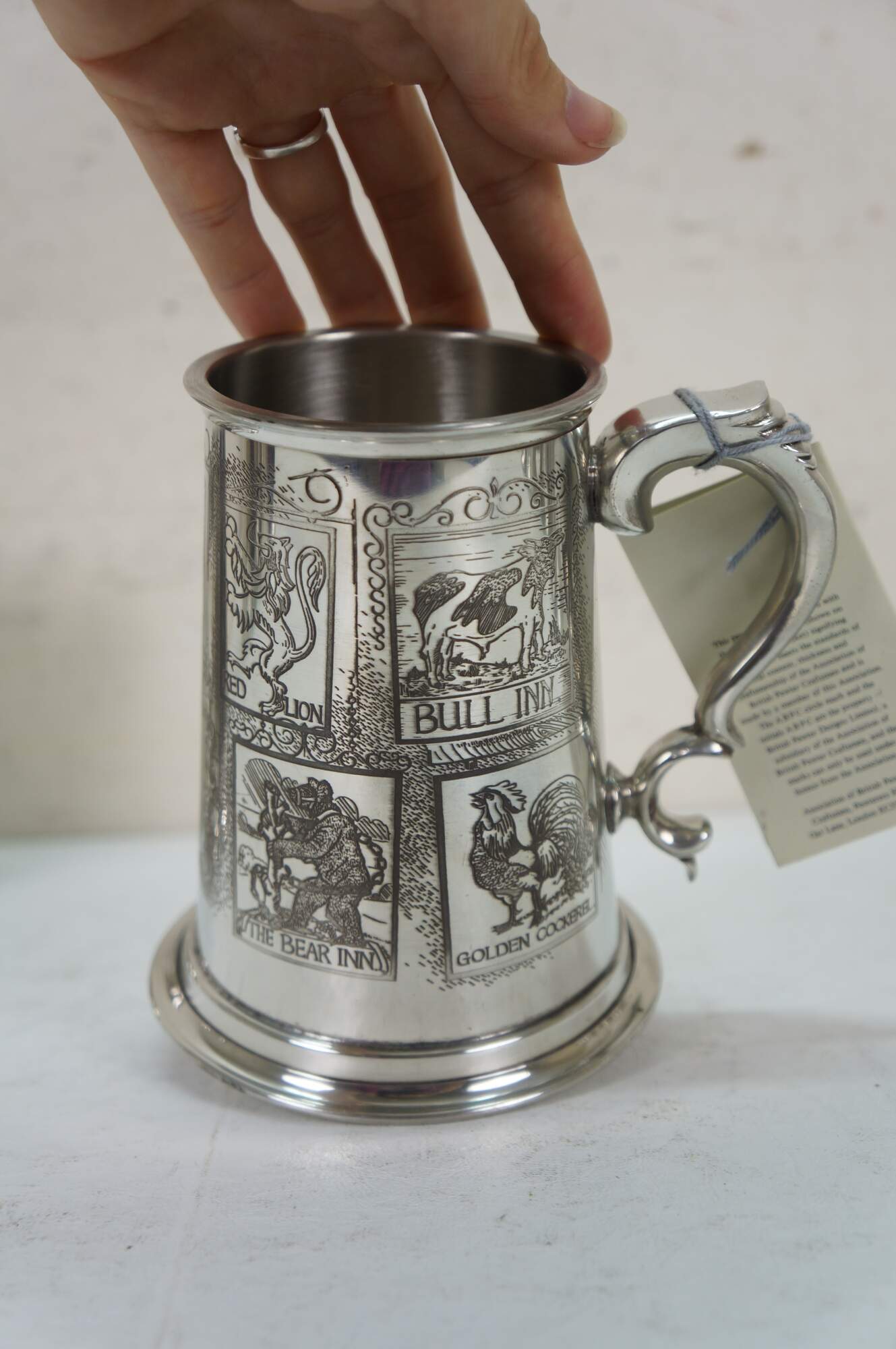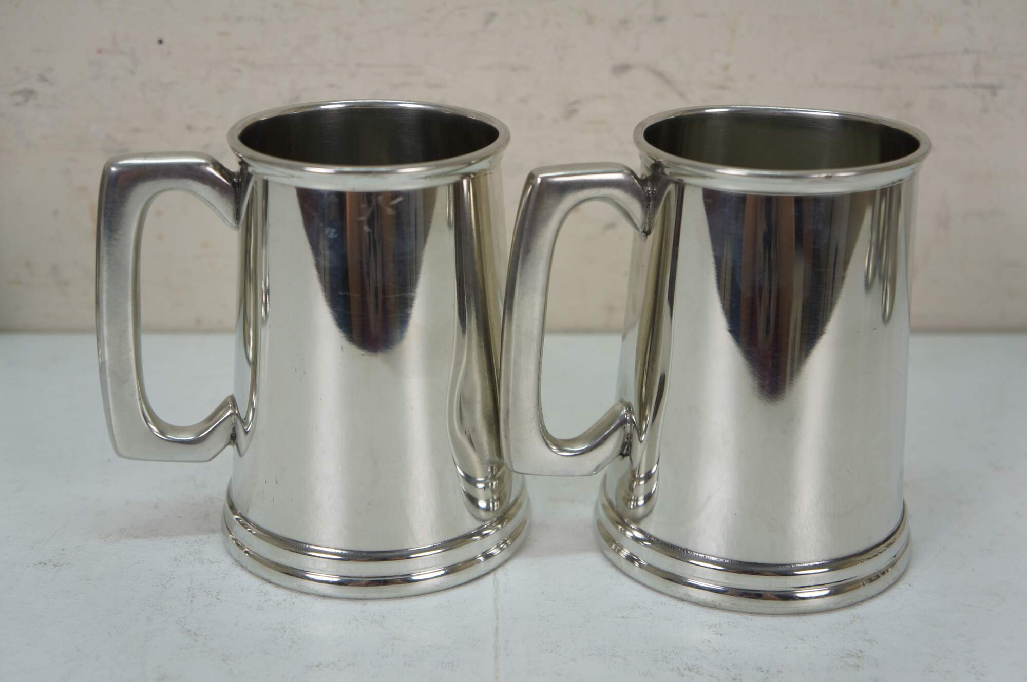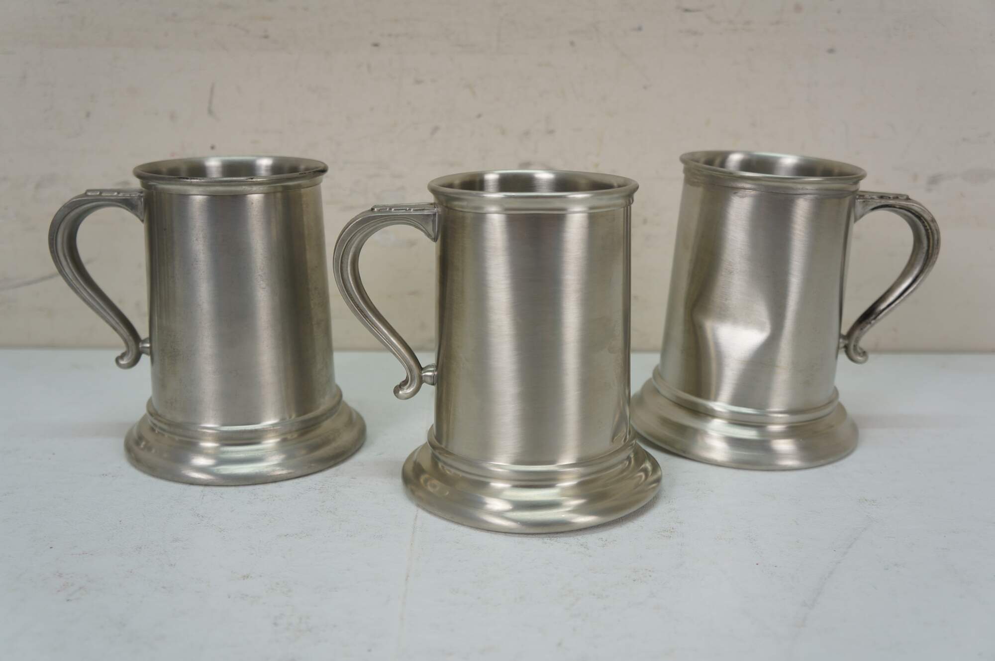 Lot of seven circa 1970's pewter drinking mugs. Two by International Pewter, two by Hahne & Company, one by Pinder Bros, and one by Arcadia Pewter