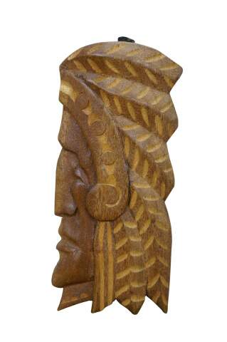 Vintage late 20th century hand carved wooden wall hanging folk art style mask / face depicting a native tribal figure in silhouette profile wearing an elaborate feathered headdress. Made in Ecuador.