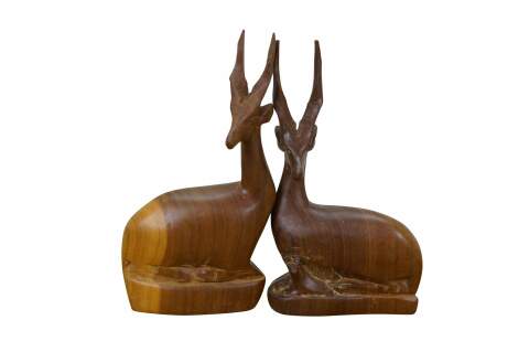 Pair of mid to late 20th century hand-carved mahogany wood figurines depicting a family of gazelles, impalas, or antelopes lying on the ground, one alone and one with a calf.