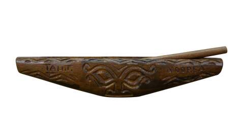 Vintage 20th century souvenir sized toere / wooden slit drum, a traditional Polynesian instrument. Hand carved boat shaped piece of wood with a slit along the top, sides featuring folk art designs and the words Tahiti and Moorea. Includes stick.
