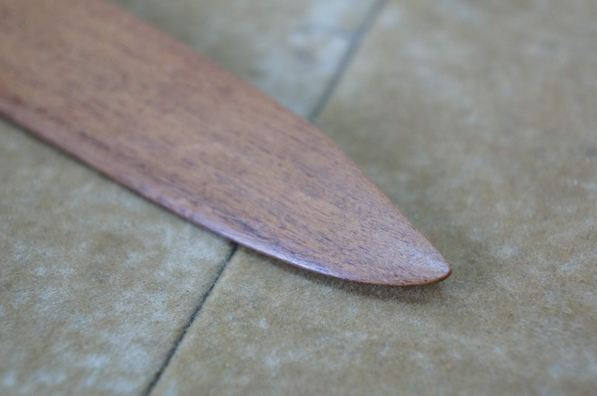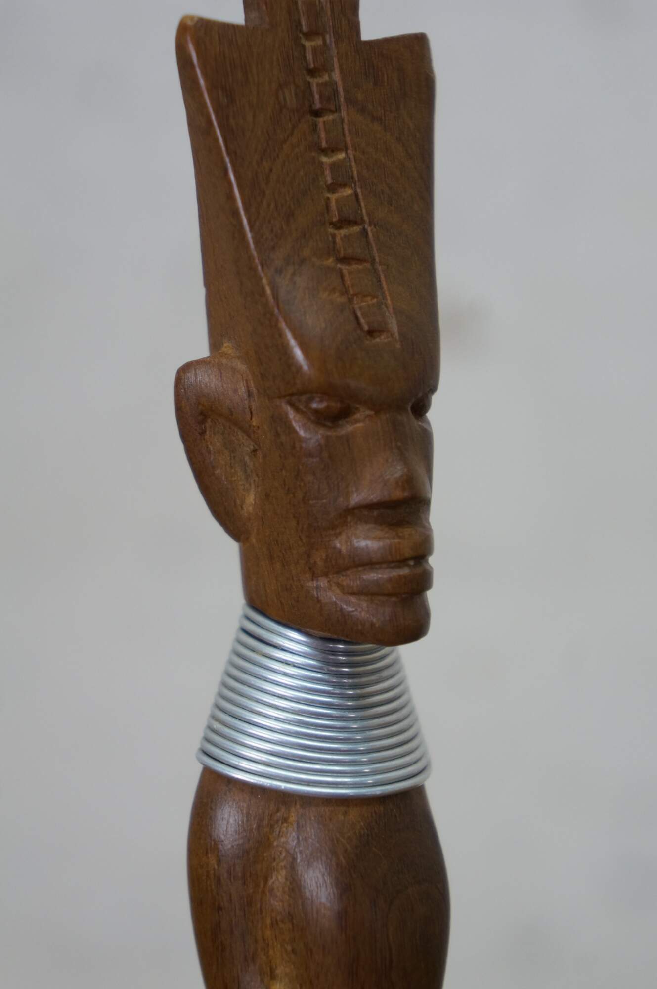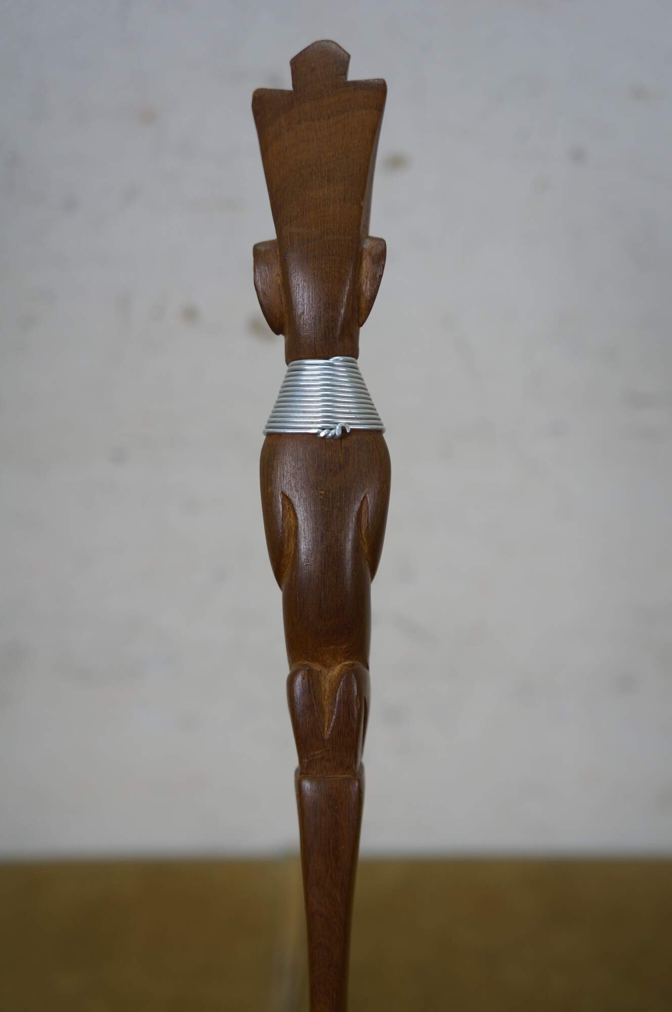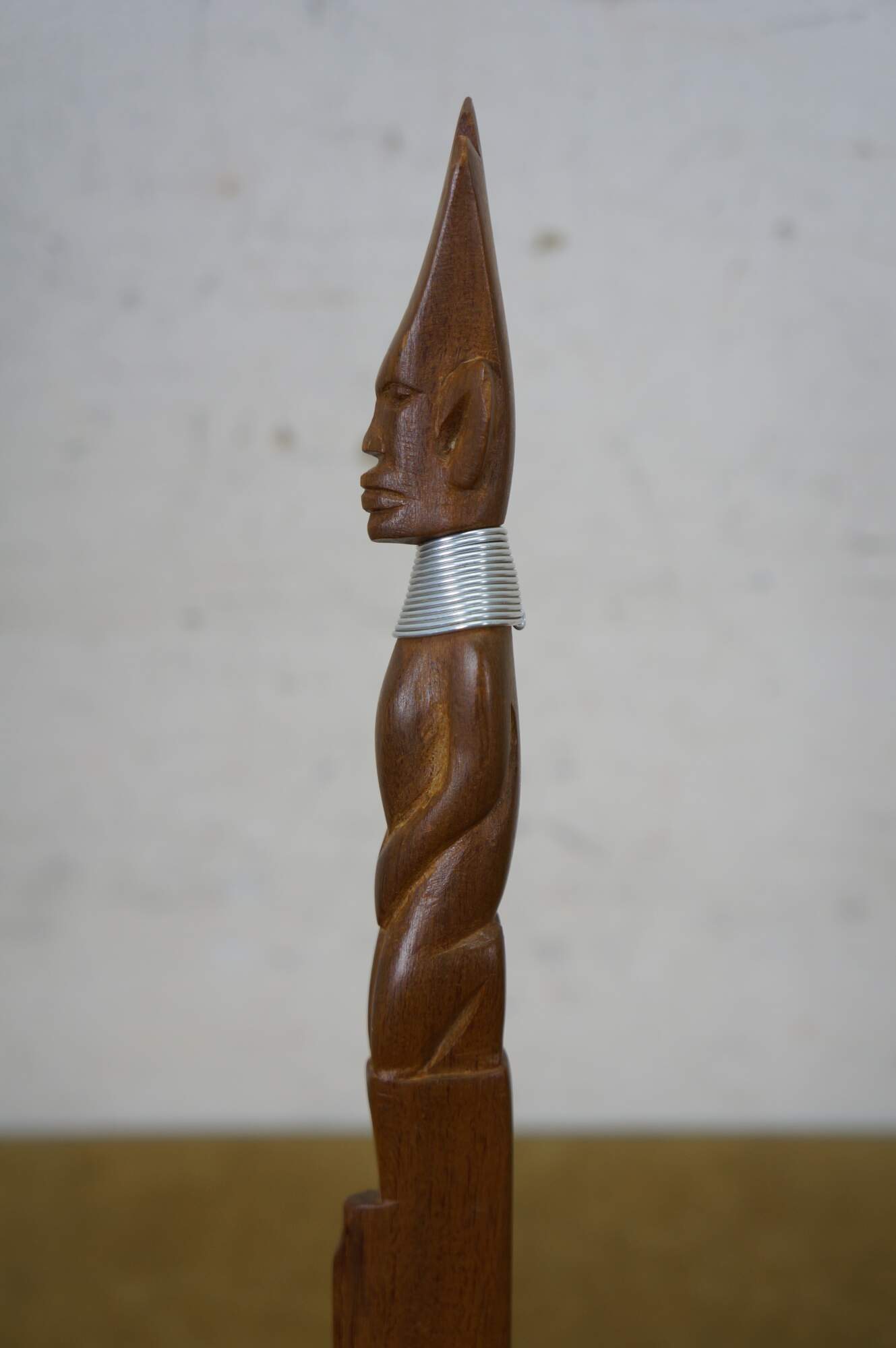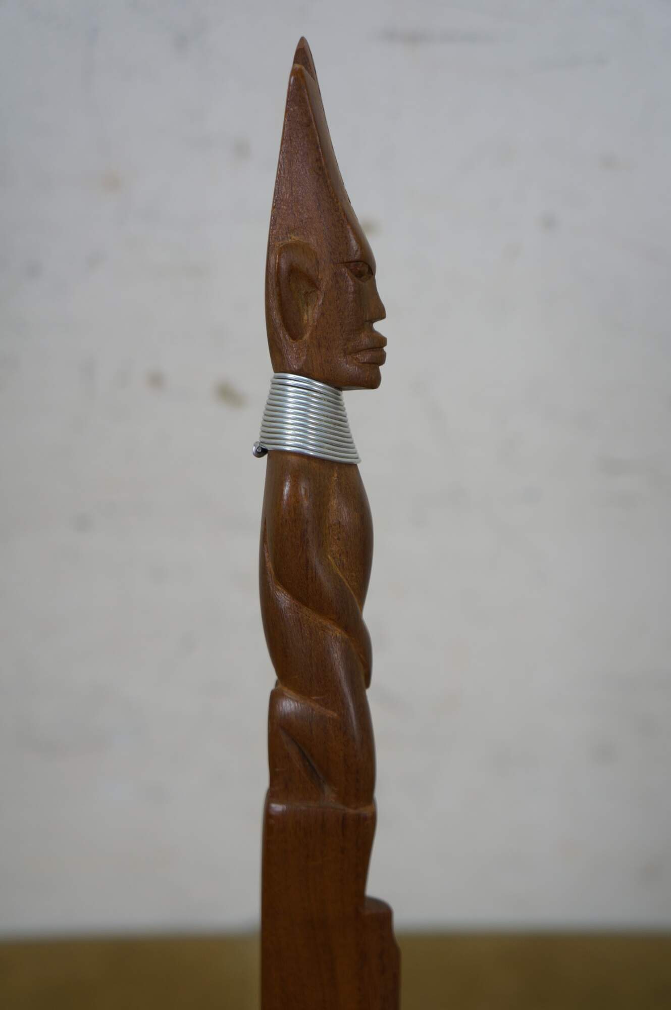 Vintage late 20th century hand carved mahogany wood African folk art style letter opener featuring a carved figure with wire necklace.