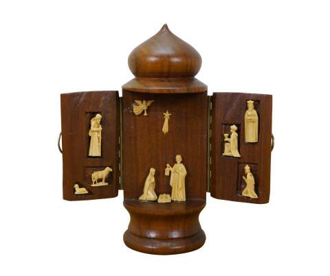 Mid to late 20th-century German Oberammergau carved wood Nativity scene/ creche. Cylindrical polished hardwood case with a teardrop-shaped top and two doors that open to reveal the scene, crafted of molded plastic figures set in carved niches. Shows the Holy Family, three Wise Men, a shepherd with sheep, a Christmas star, and an angel.