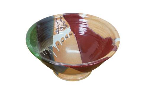 A very large and impressive late 20th century stoneware studio art pottery fruit centerpiece / footed serving bowl, featuring an abstract multicolored dripped and spattered glazed design.