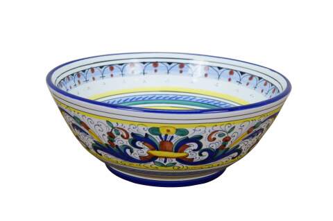 Late 20th century Italian R. Bonechi Imports Ricco Deruta pottery serving bowl. Dating back to the sixteenth century, the Ricco design is heavily influenced by the frescoes of Renaissance artist Pietro Perugino. He was the mentor of Raphael, and their work inspired the patterns of Deruta ceramics that date back to the sixteenth century. Hand painted. Made in Italy.