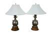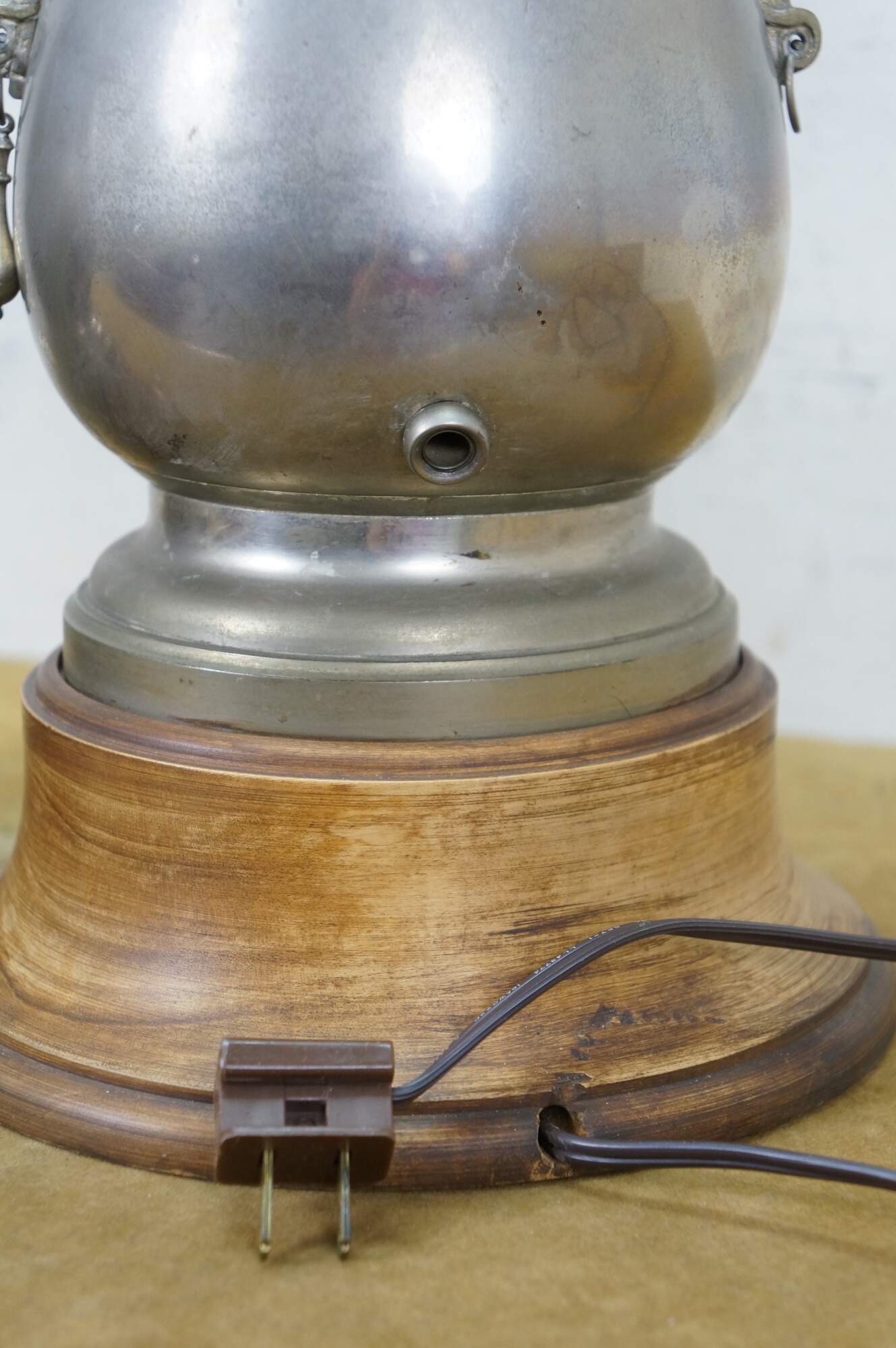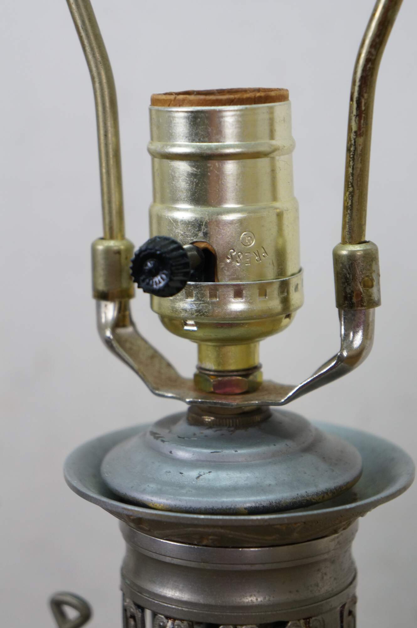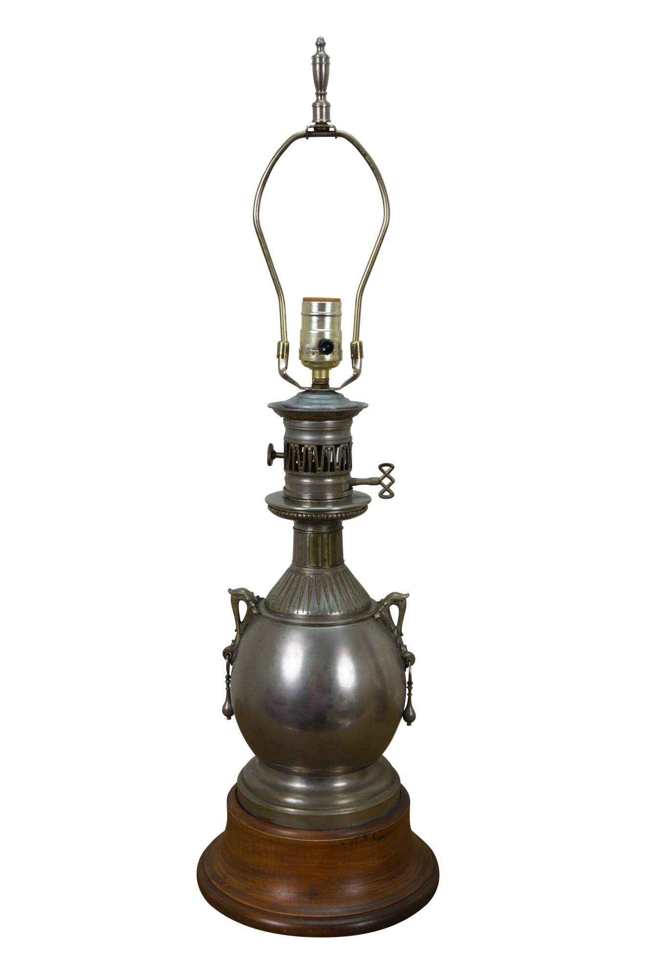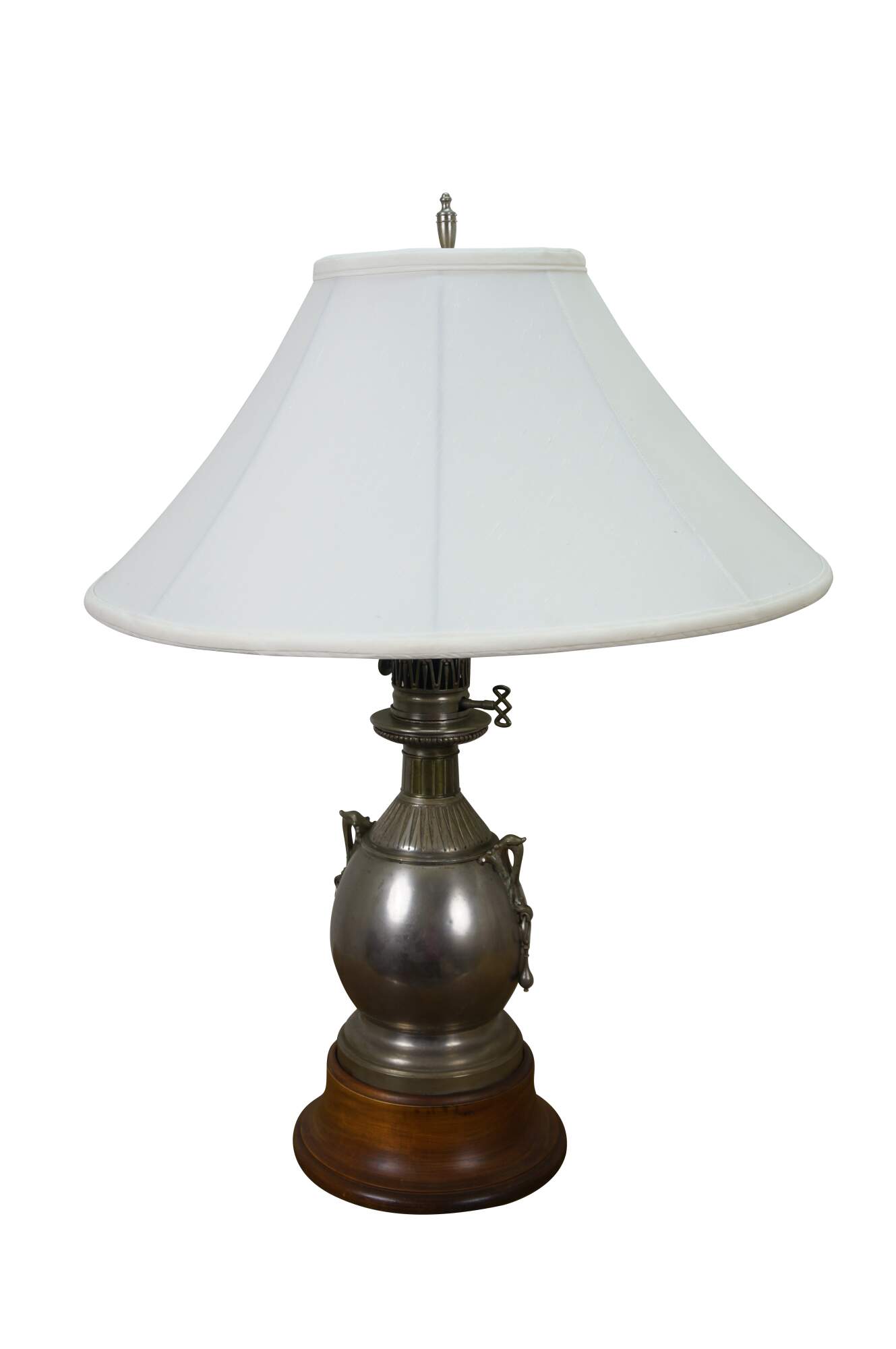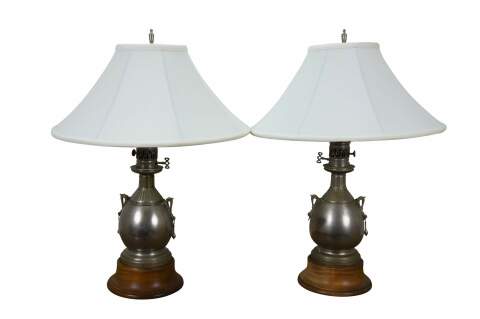Pair of vintage 20th century brushed silver converted oil table lamps. Urn shaped bodies with neoclassical details and serpent shaped handles; round painted wood grain base. Includes harps, urn shaped finials and white fabric shades.