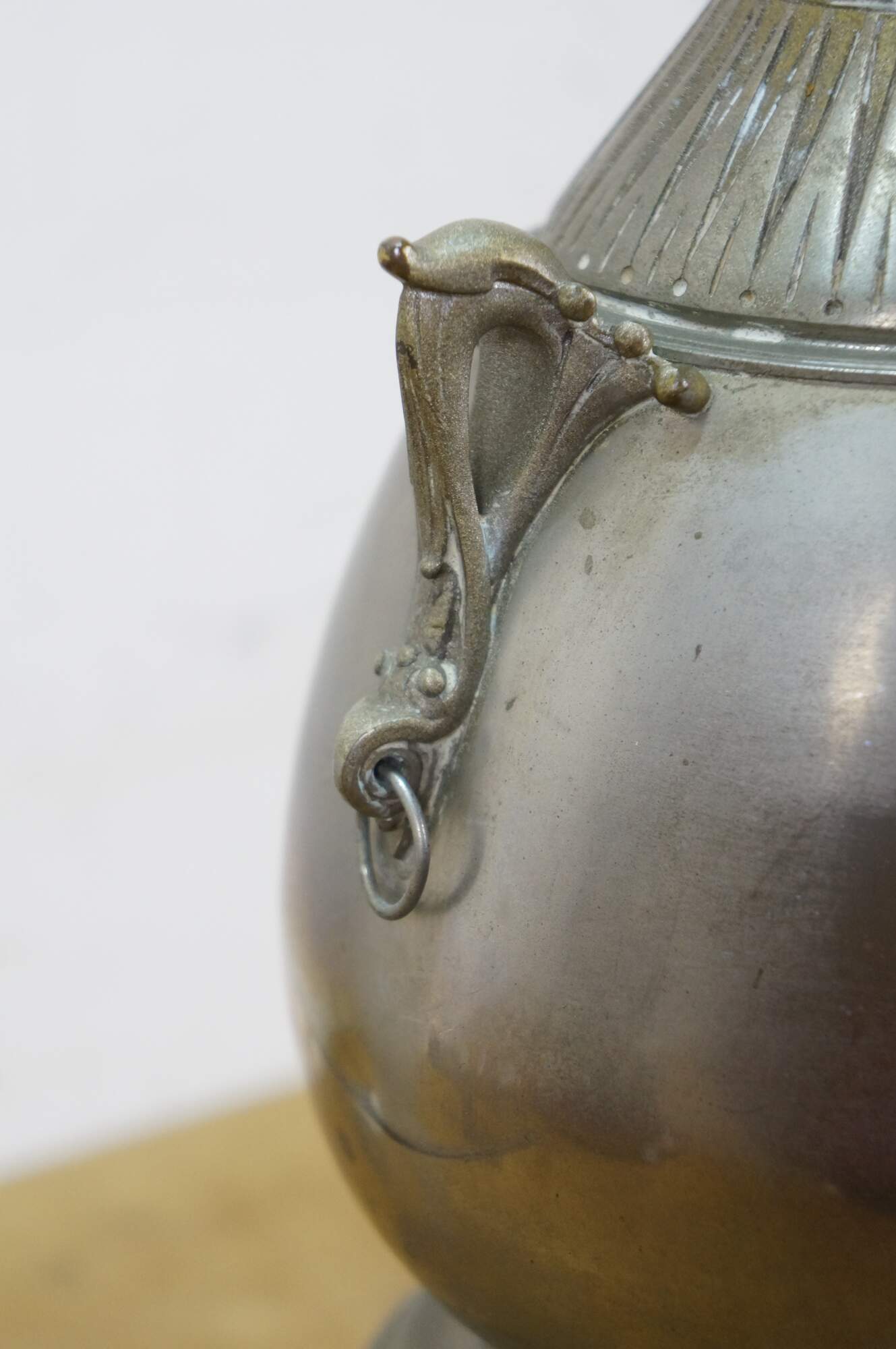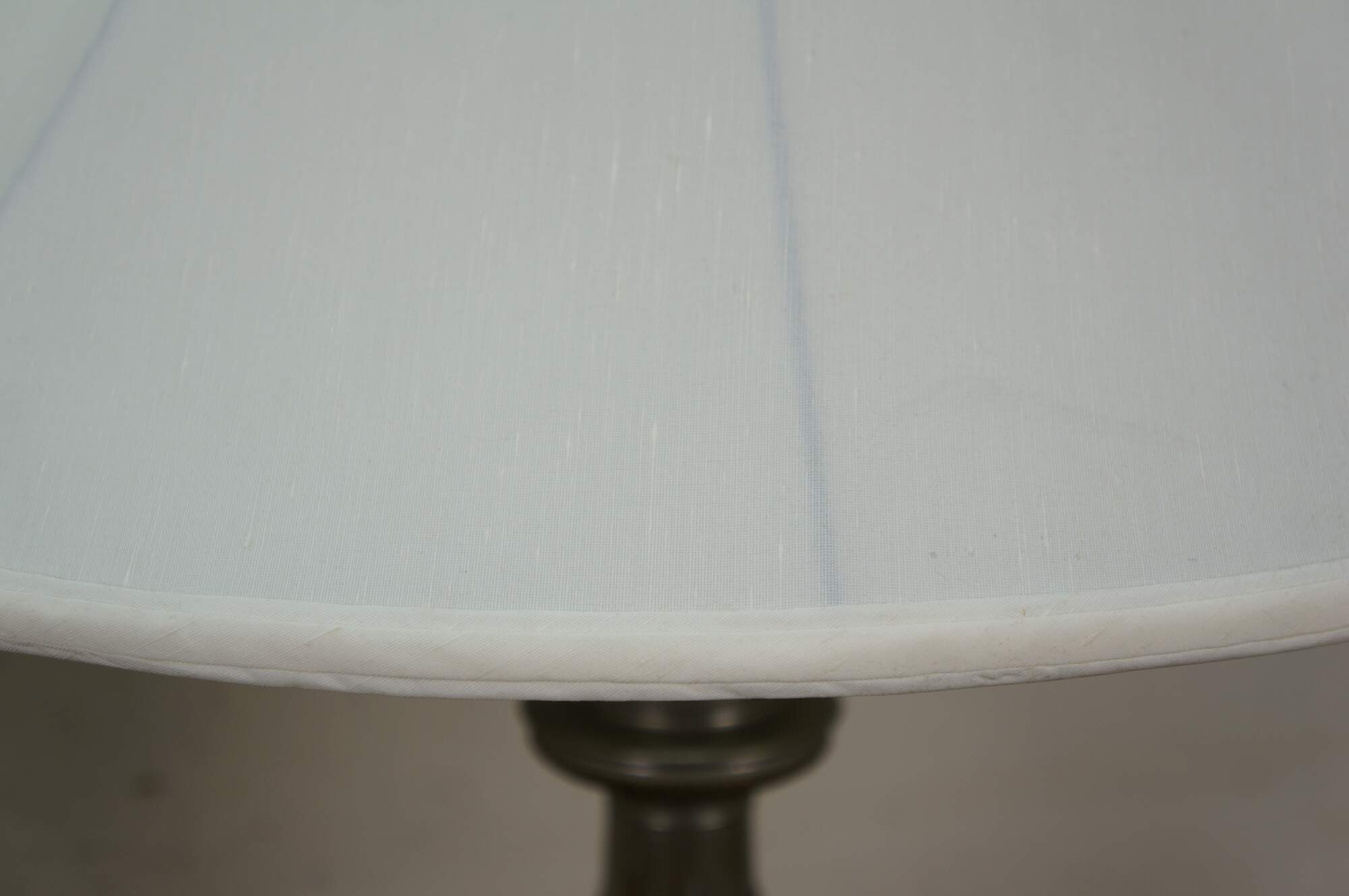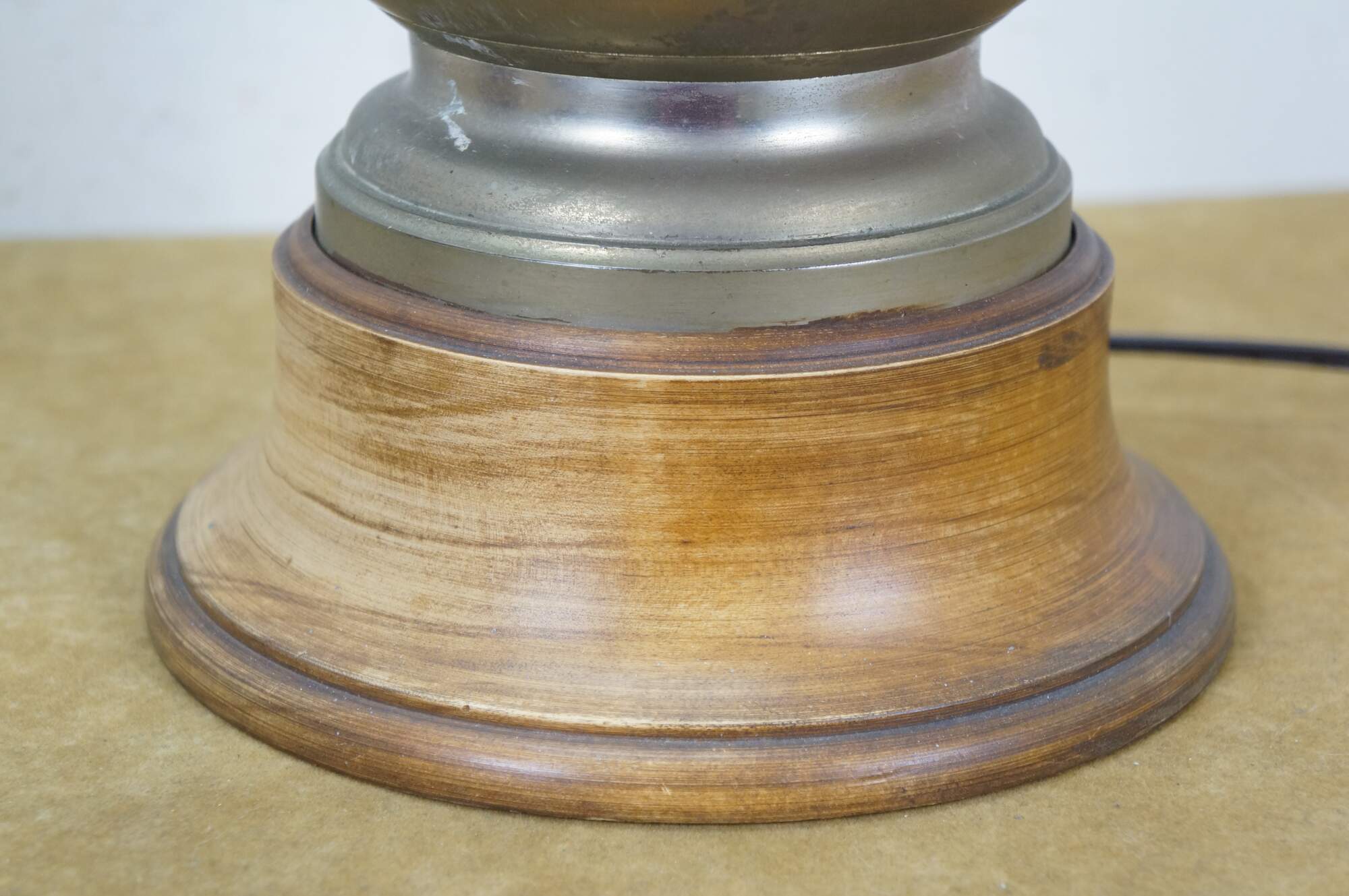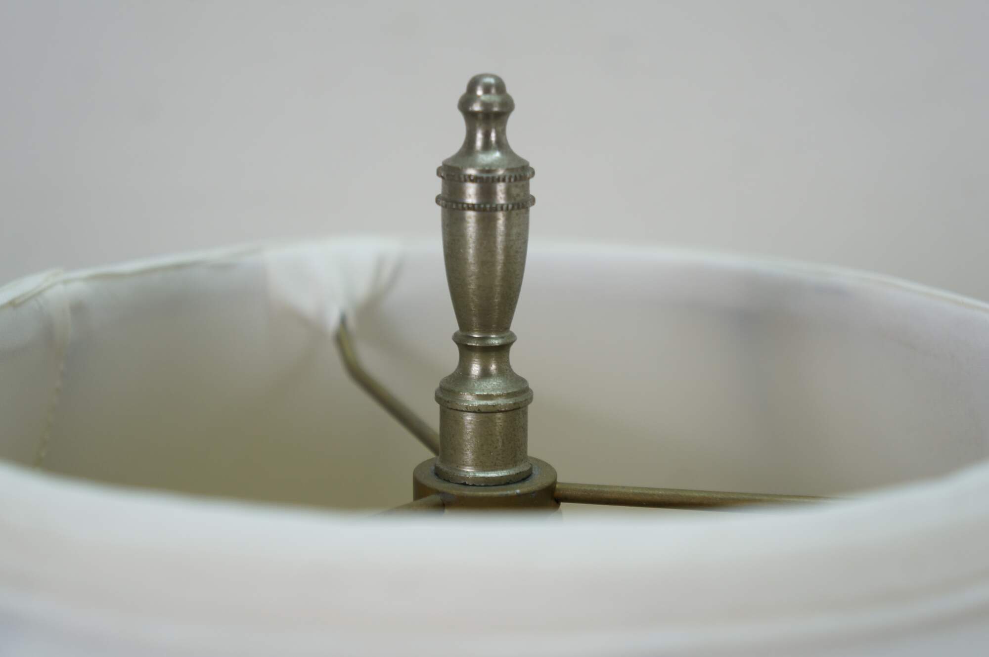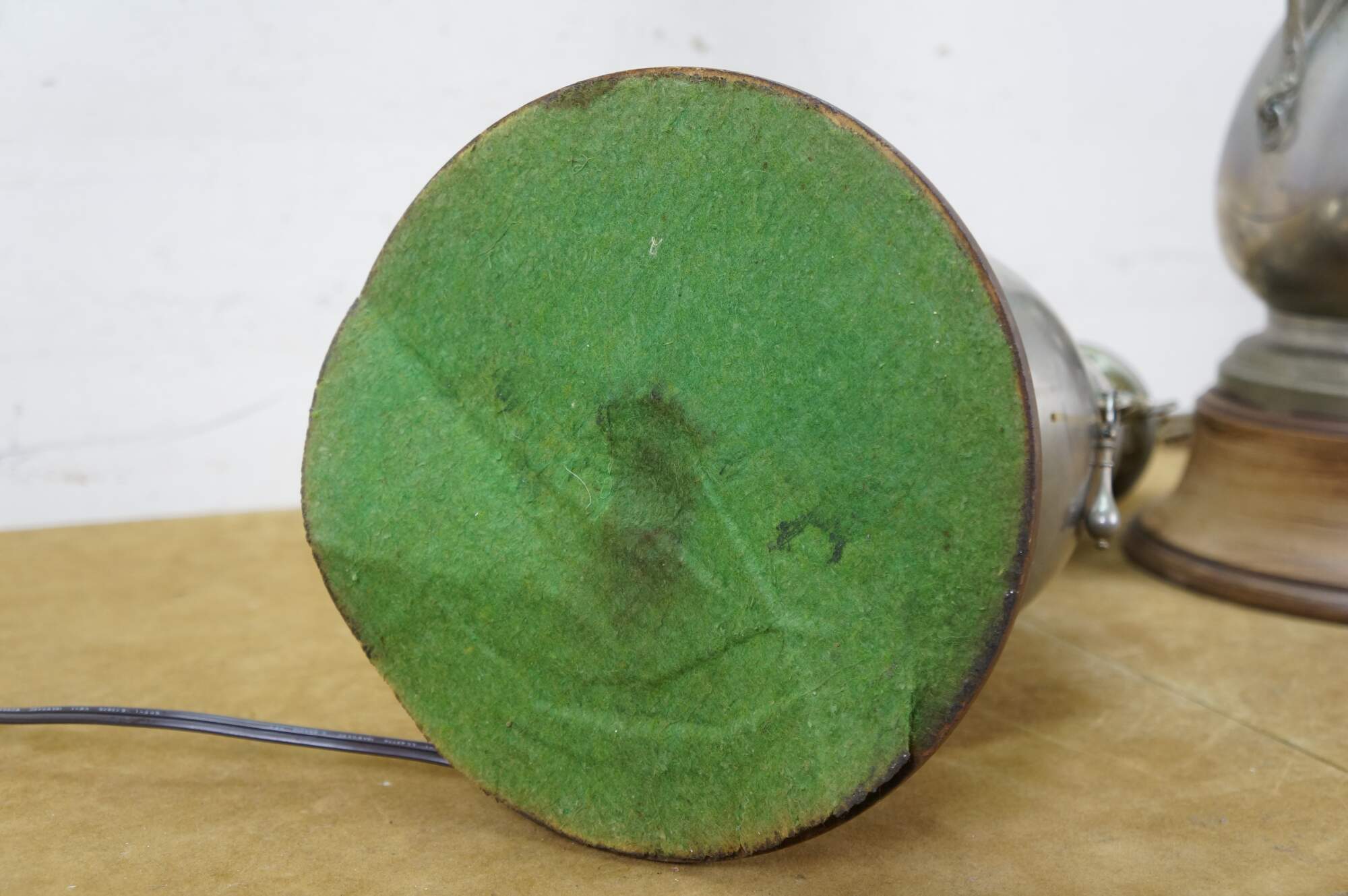 Pair of vintage 20th century brushed silver converted oil table lamps. Urn shaped bodies with neoclassical details and serpent shaped handles; round painted wood grain base. Includes harps, urn shaped finials and white fabric shades.