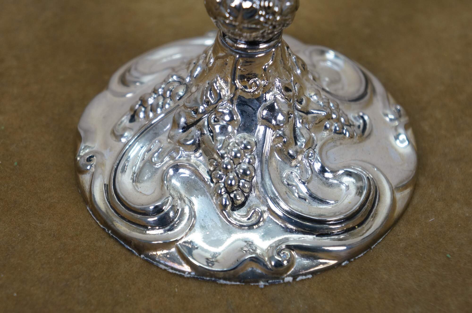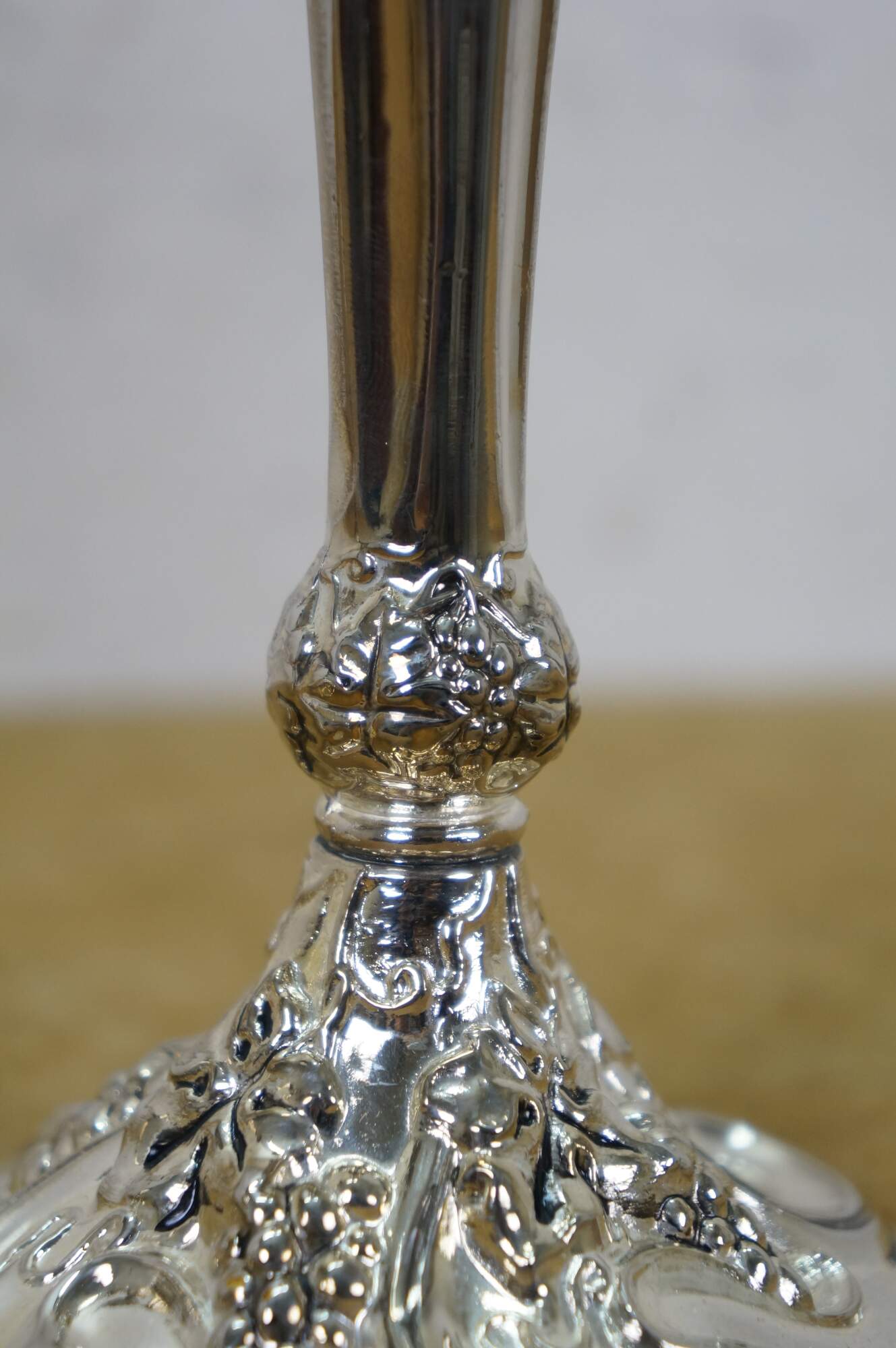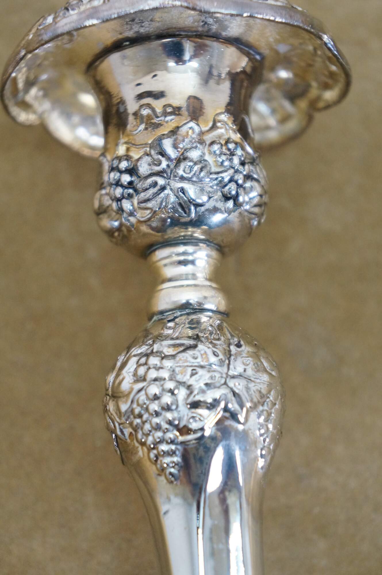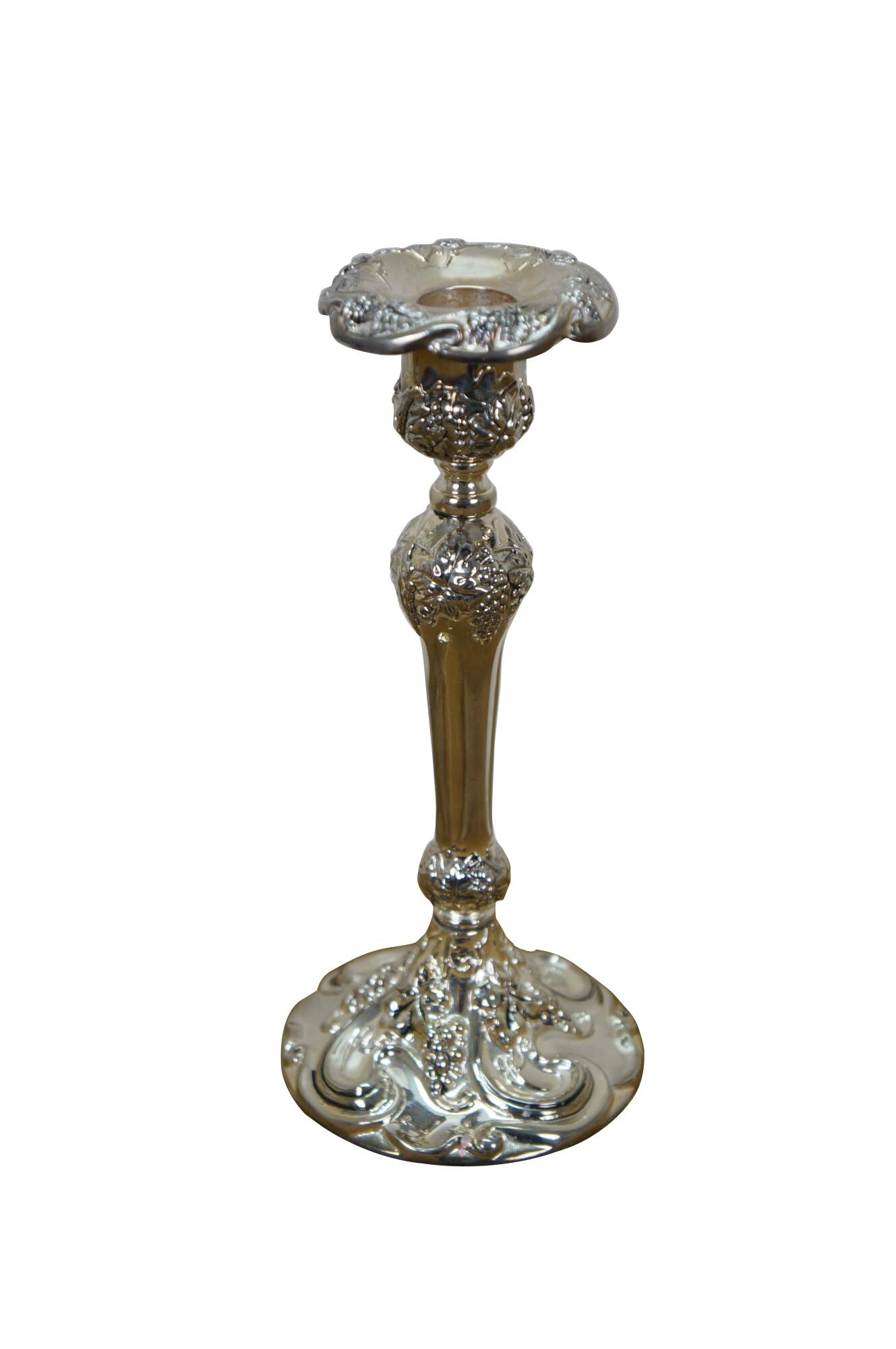 Late 20th century Godinger Silver Art Co silver plate taper candlestick pair. Baroque inspired styling with a design of grape vines.