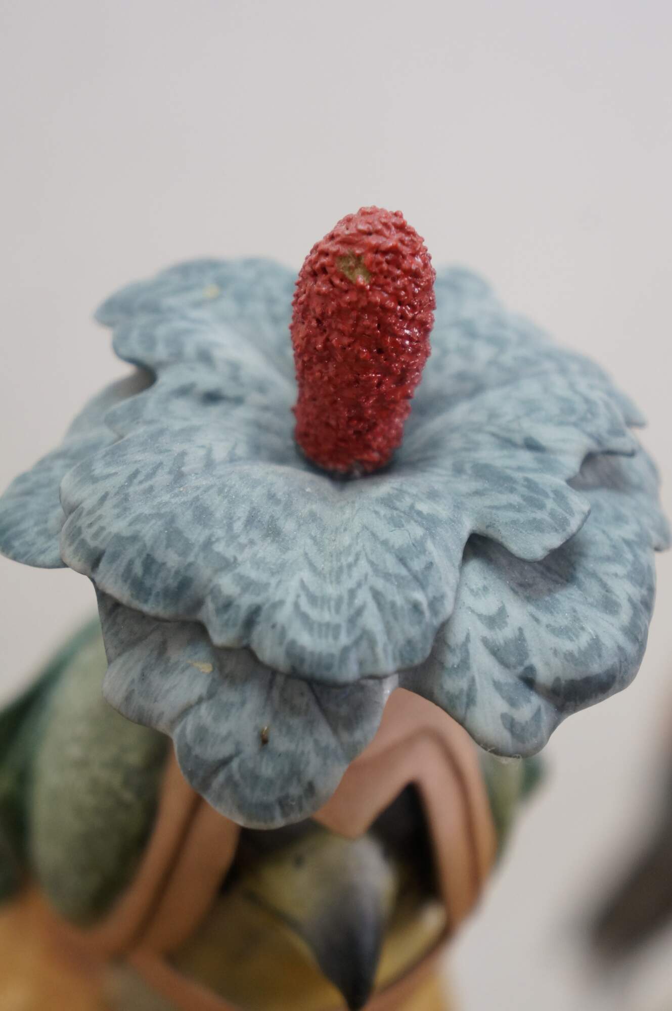 "Edward Marshall Boehm (August 21, 1913 – January 29, 1969) was an American figurative expressionist sculptor, known for his porcelain figures of birds and other wildlife. Boehm explained his choice of porcelain as the medium for his art as follows: "Porcelain is a permanent creation. If properly processed and fired, its colors will never change; and it can be subjected to extreme temperatures without damage. It is a medium in which one can portray the everlasting beauty of form and color of wildlife and nature." He and his wife founded an eponymous company, E.M. Boehm Studios, in 1950. Edward Marshall Boehm was born in Baltimore, Maryland in 1913. His surname is pronounced "Beam". His parents separated before his birth. His mother, Elsie, died when he was seven years old. (He did not meet his father until he was in his twenties.) Friends enrolled him in an all-boys school for orphans and the poor, the McDonogh School, where he remained until he was 16 years old, when he left to work as a farmhand. He studied animal husbandry at the University of Maryland, College Park. From 1934 to 1942, he managed Longacres Farm on the Eastern Shore of Maryland, specializing in Guernsey cattle. During World War II Boehm was in charge of a rehabilitation program for the Air Force at Pawling, New York. After World War II, Boehm apprenticed for six months with sculptor Herbert Haseltine. Boehm studied draftsmanship three times a week and taught himself the ancient process of porcelain making. In 1944, he married Helen Franzolin (12/26/1920–11/15/2010). They moved to Trenton, New Jersey, where they founded their business in 1950. The following year, the American Wing of the Metropolitan Museum of Art in New York ordered two statues for the museum's collection. The marriage was long and happy but childless. The couple remained together until Edward's death in 1969, aged 55. Boehm kept a large collection of exotic birds in extensive aviaries and tropical houses at his home in Trenton. These birds became some of the subjects and inspiration for his sculptures. Many of these species were successfully bred, approximately 12 were recognised as being for the first time in captivity anywhere in the world. For these breeding successes Edward Boehm received a number of commemorative medals and plaques. Edward Marshall Boehm died from a heart attack on January 29, 1969, aged 55. His widow, Helen Boehm, died in 2010, aged 89. The couple is interred at Saint Mary's Cemetery, Trenton, Mercer County, New Jersey. Boehm was accorded his highest honor in 1992 when a wing of the Vatican Museums in Rome was named in his memory. This was the first time in its 500-year history that one of the 13 museums in the Vatican was named for an American citizen, as the twelve other museums are named for popes and royal families." (Wikipedia)