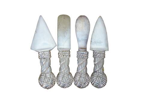 Set of four late 20th-century silver-plate cheese knives/spreaders with woven rope-patterned handles.