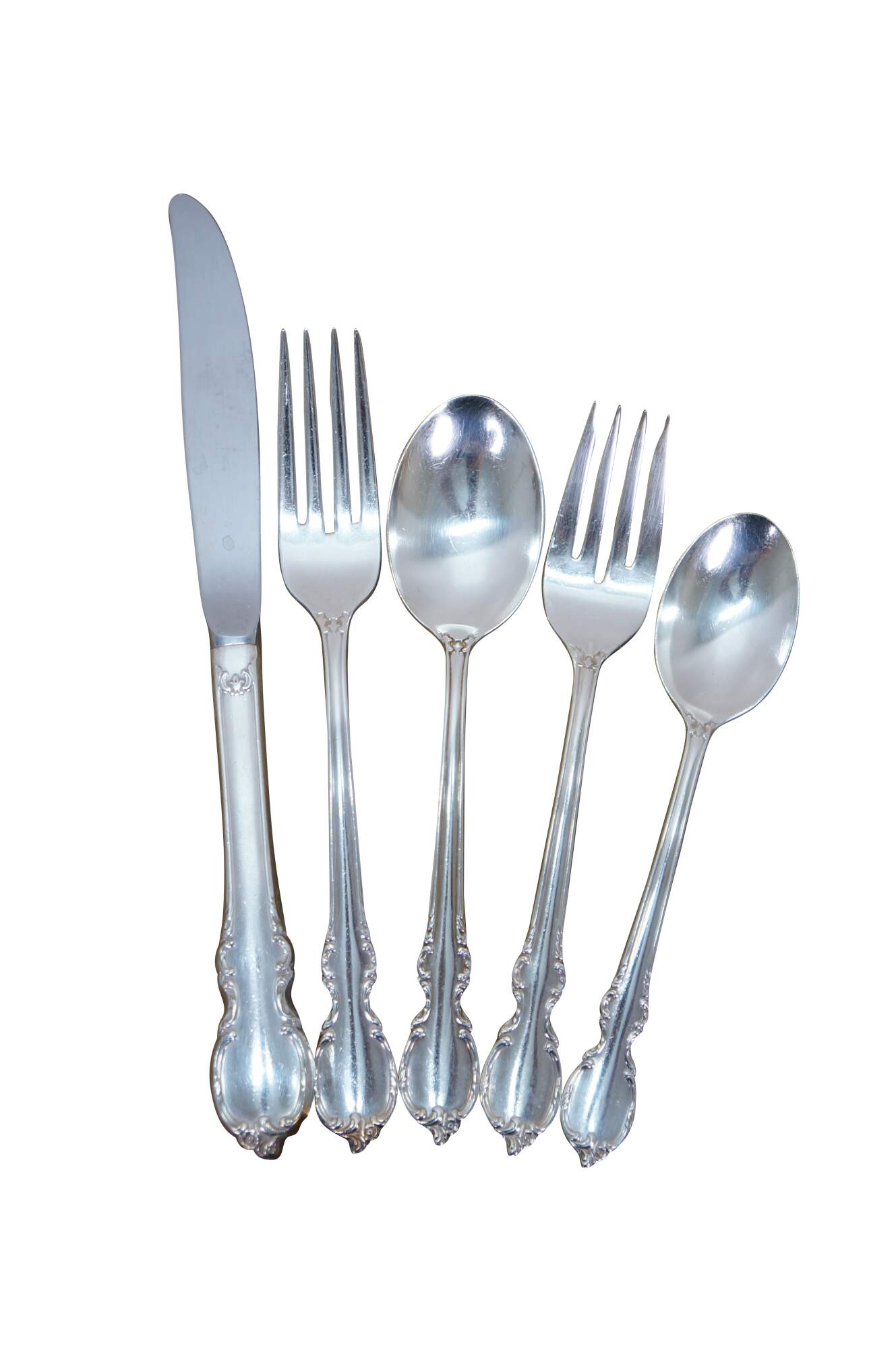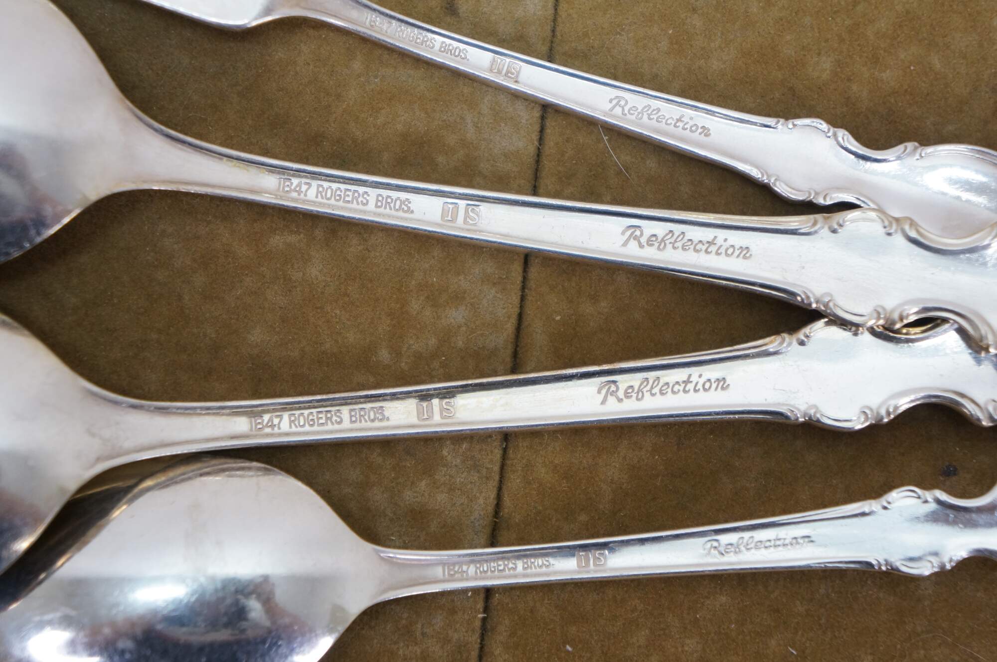Set of 64 pieces of silverplated flatware / cutlery by 1847 Rogers Bros / International Silver Co in the Reflection pattern. Set includes: 11 Salad Forks, 12 Table Spoons, 12 Dinner Forks, 22 Teaspoons, 2 Slotted Serving Spoons, 2 Serving Spoons, Sugar Spoon, Butter Knife, 13 Table Knives.