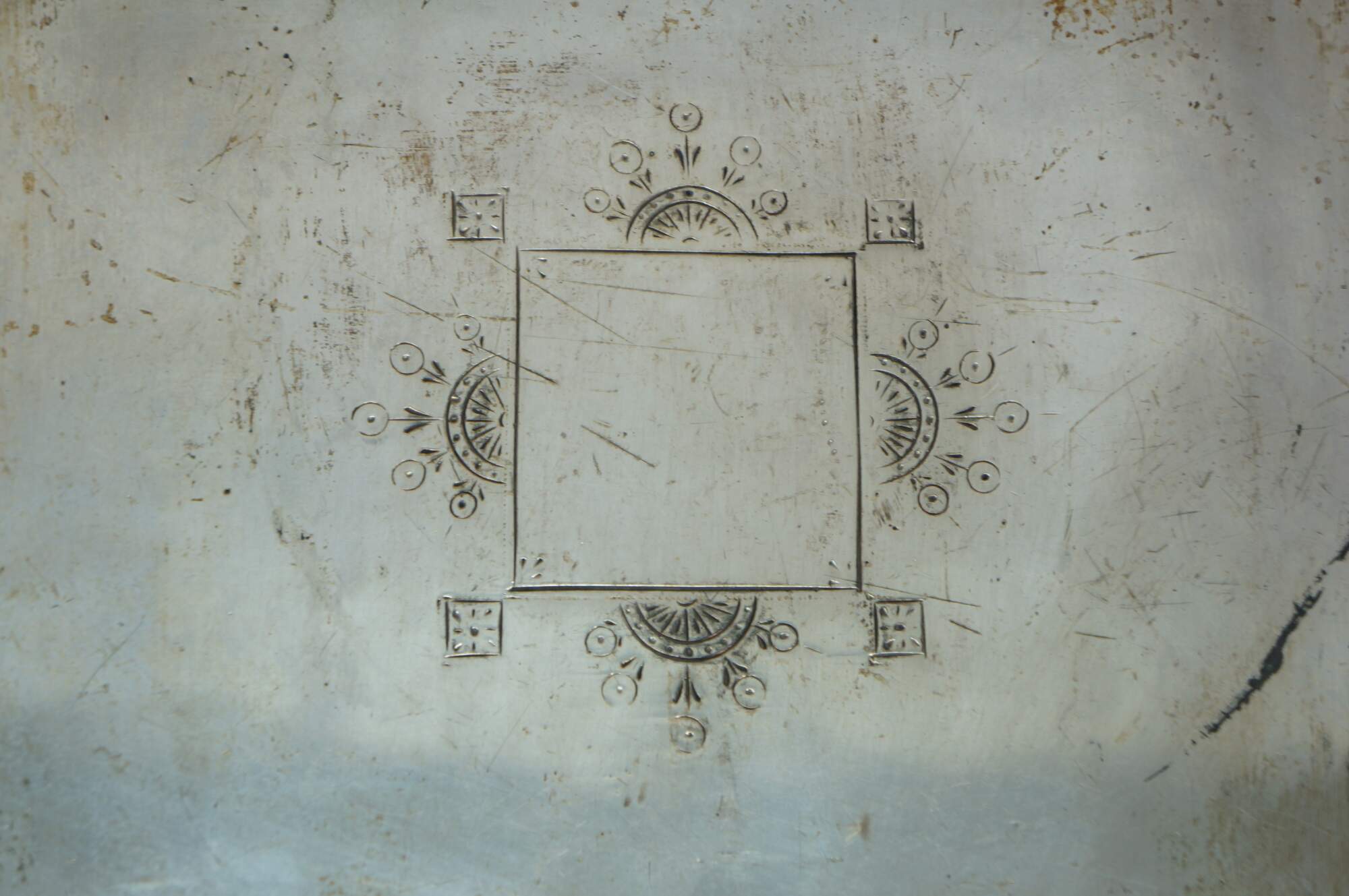 Late 19th century hard white metal quadruple plate serving tray by Middletown Plate Company. Numbered 63 and 10 on reverse. Square form with cut corners, etched geometric design at center; floral and foliate edge.