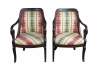 Antique Victorian library / parlor arm chairs. Made of mahogany featuring American Empire / regency styling with scrolled arms and plaid upholstery.
